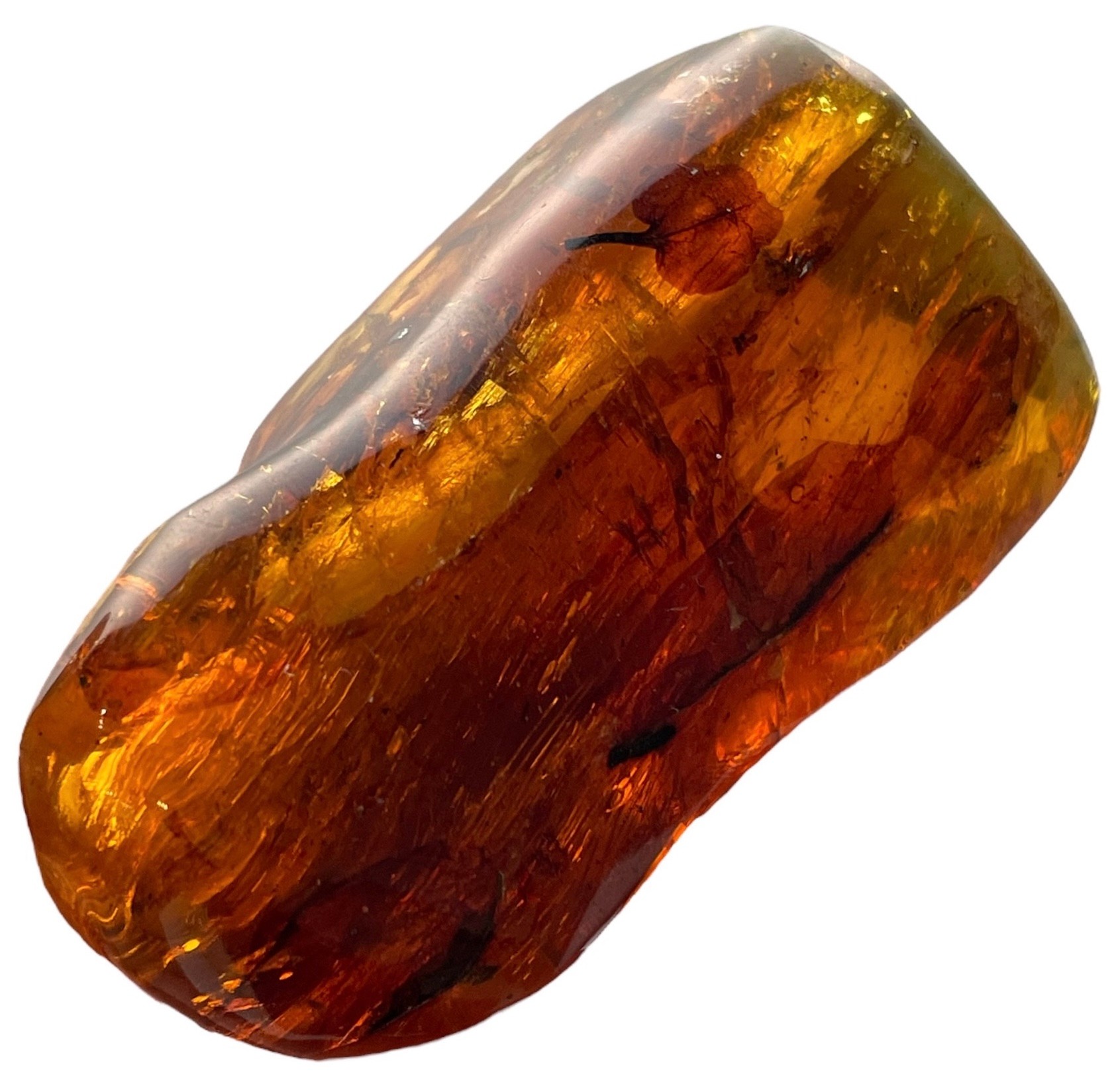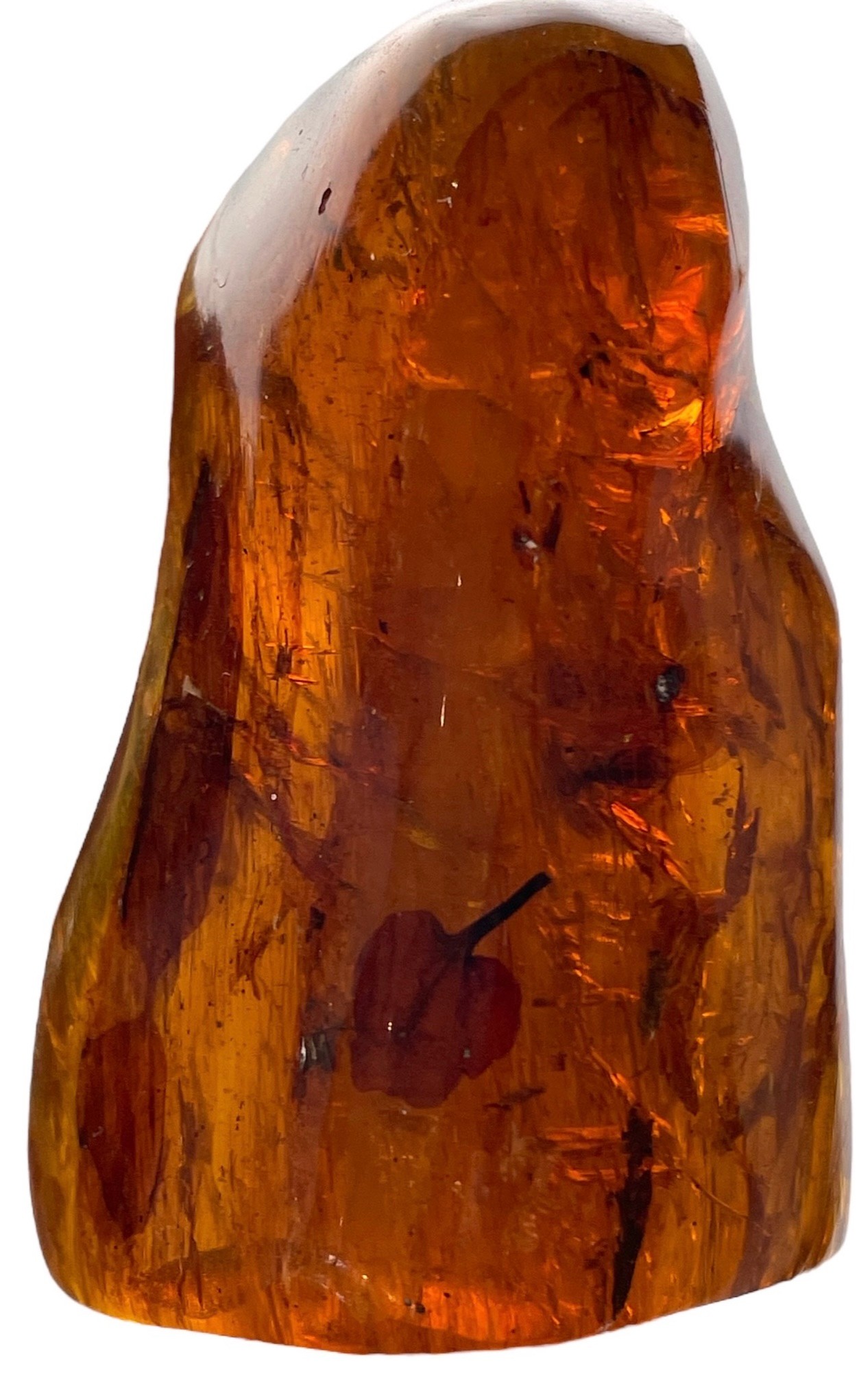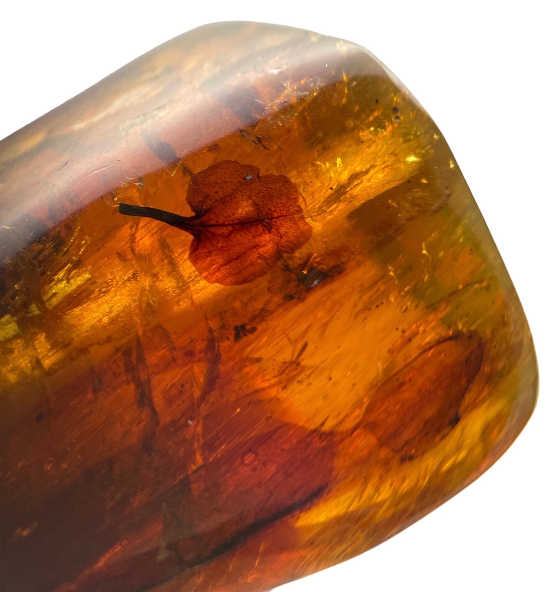 This sizeable piece of amber is freestanding and contains a remarkably well-preserved leaf. From the amber mines of Chiapas, Mexico. Miocene in age Circa. 23-28 million years old.