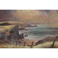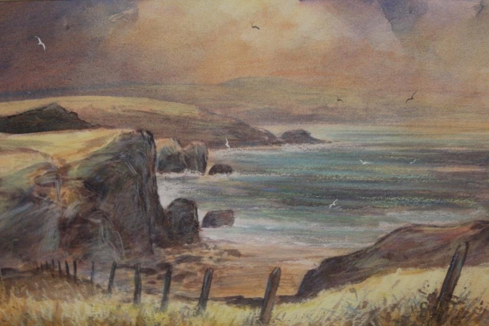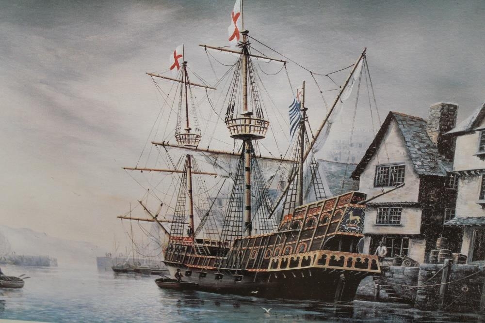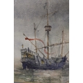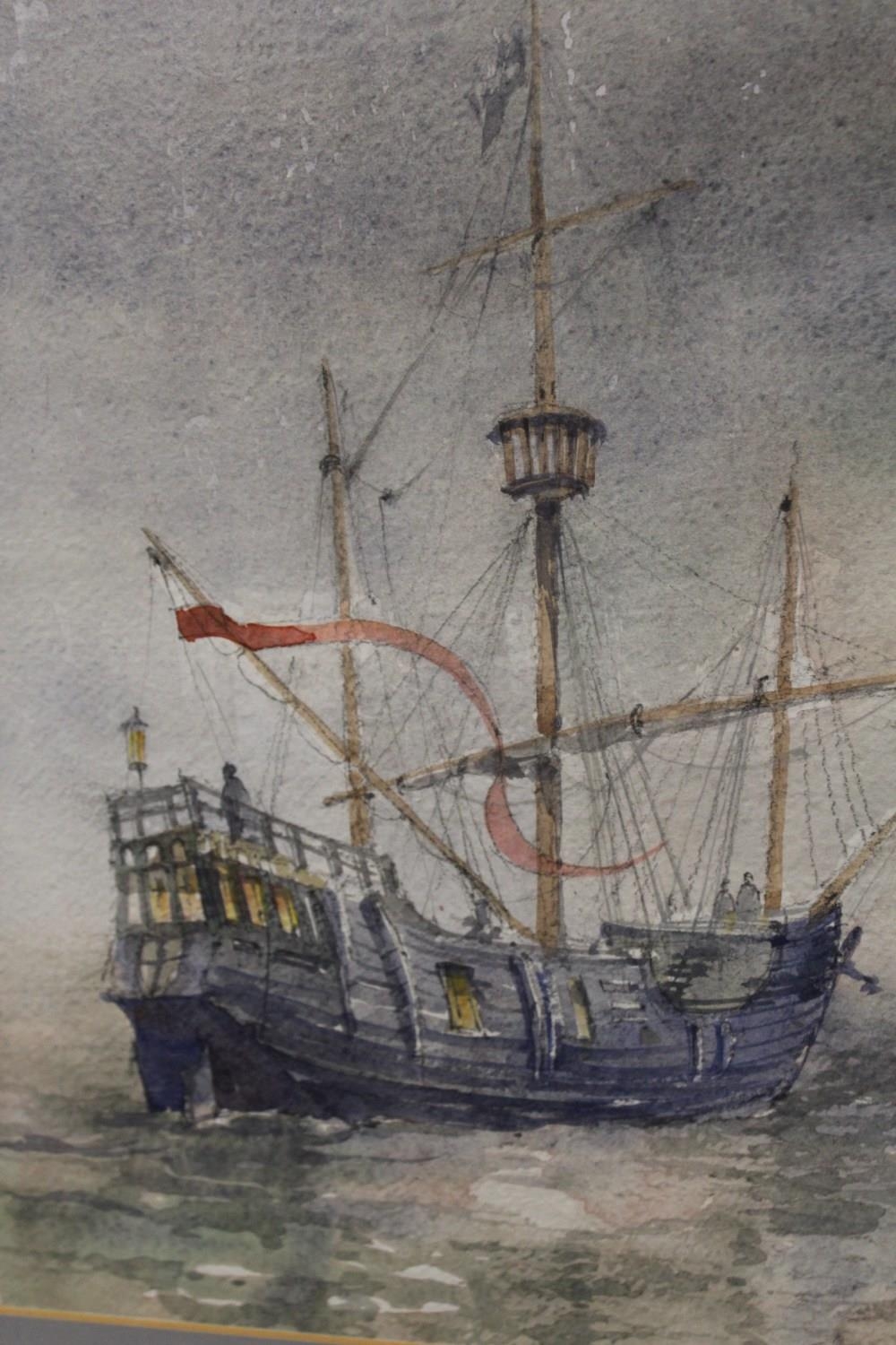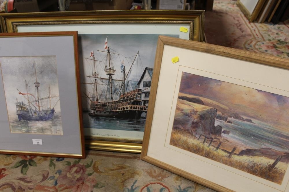 A FRAMED AND GLAZED WATERCOLOUR DEPICTING A GALLEON AT SEA, TOGETHER WITH A PASTEL OF A COASTAL SCENE AND A PRINT OF THE GOLDEN HINDE SHIP (3)