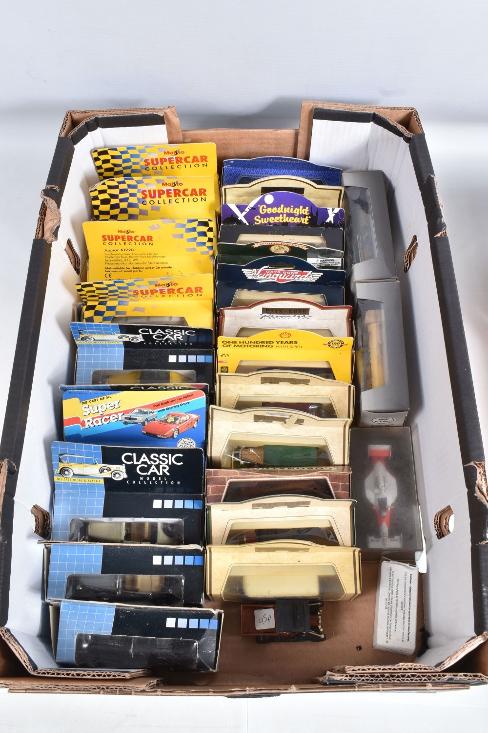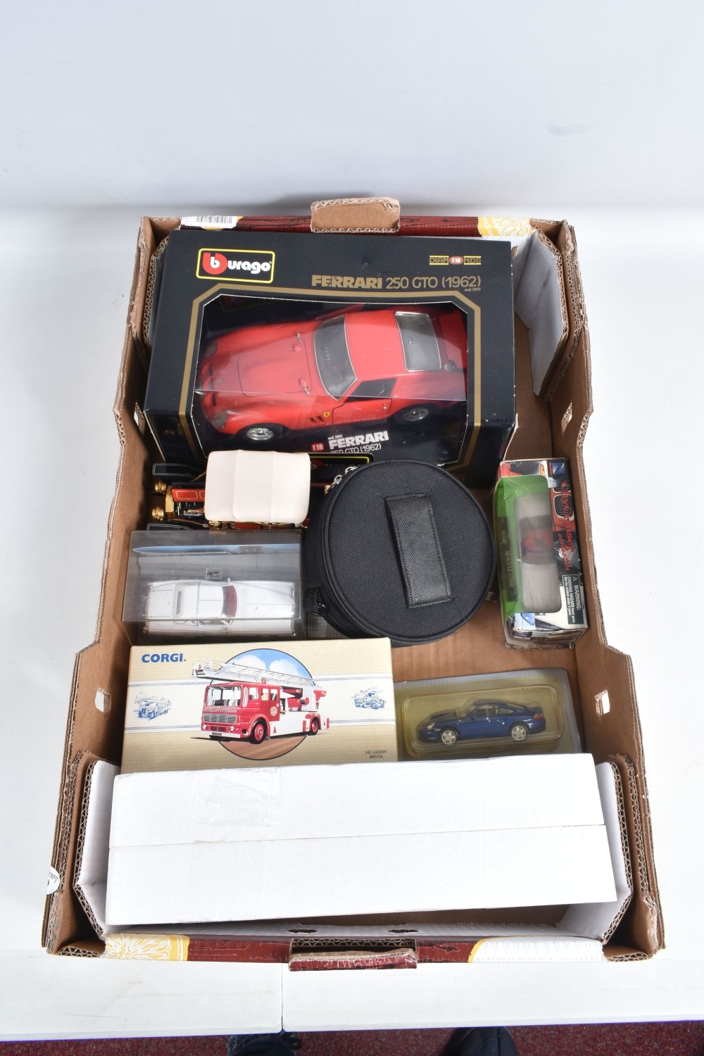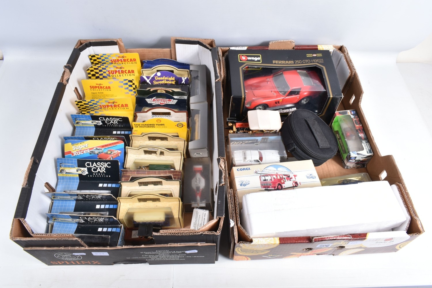 BOXED AND LOOSE DIECAST MODEL VEHICLES, models by Maisto, Vanguards, EFE, Lledo, Corgi, Classic Car, Bburago, Matchbox, to include a Matchbox Collectibles Peterbilt Truck ' Jim Beam', this is in its polystyrene packaging but missing the outer box, a Bburago boxed 1962 Ferrari 250 GTO no. 3011, an unboxed Franklin Mint 1910 Rolls Royce Silver Ghost, an empty box for a Corgi Classic AEC Ladder Fire Engine 'Bristol' no. 97386, a boxed yellow Maisto Corvette ZR1, a boxed Classic Car 1931 Open Grand Tourer no. 8873C, a boxed Days Gone 1935 Ford Articulated Tanker 'Regent Petrol' no. 62000, a boxed New Ray City Cruiser 1988 Jaguar XJ-S.V12 no. NR519, a boxed Corgi purple Mini 'Cadbury', a boxed Days Gone 1960 Morris Minor Traveller no. 65000, to name a few, also included in this lot is a Philips CD player with case and a Don Williams Greatest Hits CD, the models appear in good condition, the boxes vary in condition from good to creased, and showing wear on corners and edges, contents unchecked for completeness (2 boxes)