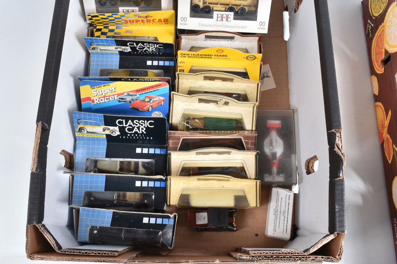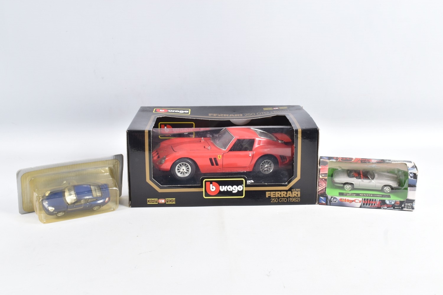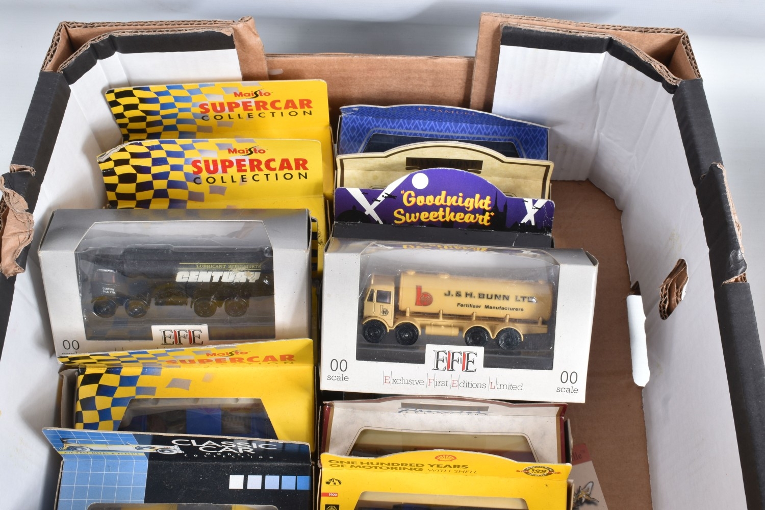 BOXED AND LOOSE DIECAST MODEL VEHICLES, models by Maisto, Vanguards, EFE, Lledo, Corgi, Classic Car, Bburago, Matchbox, to include a Matchbox Collectibles Peterbilt Truck ' Jim Beam', this is in its polystyrene packaging but missing the outer box, a Bburago boxed 1962 Ferrari 250 GTO no. 3011, an unboxed Franklin Mint 1910 Rolls Royce Silver Ghost, an empty box for a Corgi Classic AEC Ladder Fire Engine 'Bristol' no. 97386, a boxed yellow Maisto Corvette ZR1, a boxed Classic Car 1931 Open Grand Tourer no. 8873C, a boxed Days Gone 1935 Ford Articulated Tanker 'Regent Petrol' no. 62000, a boxed New Ray City Cruiser 1988 Jaguar XJ-S.V12 no. NR519, a boxed Corgi purple Mini 'Cadbury', a boxed Days Gone 1960 Morris Minor Traveller no. 65000, to name a few, also included in this lot is a Philips CD player with case and a Don Williams Greatest Hits CD, the models appear in good condition, the boxes vary in condition from good to creased, and showing wear on corners and edges, contents unchecked for completeness (2 boxes)