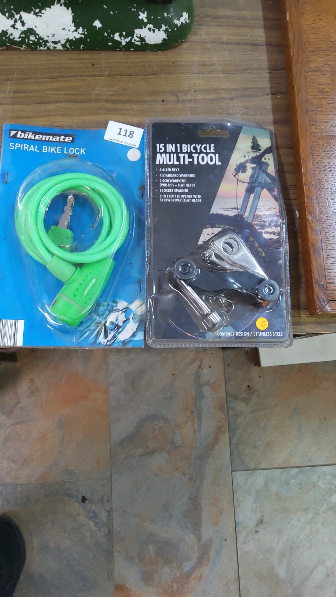 Two packaged bicycle accessories: a Bikemate spiral cable lock with keys and a compact 15-in-1 stainless-steel folding multi-tool.