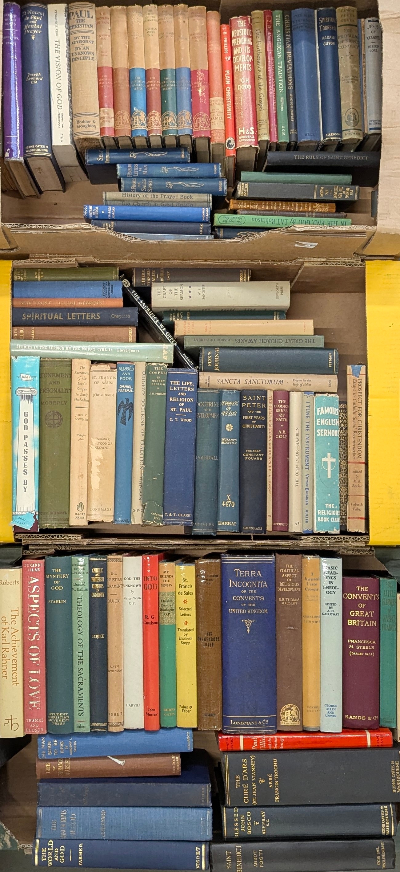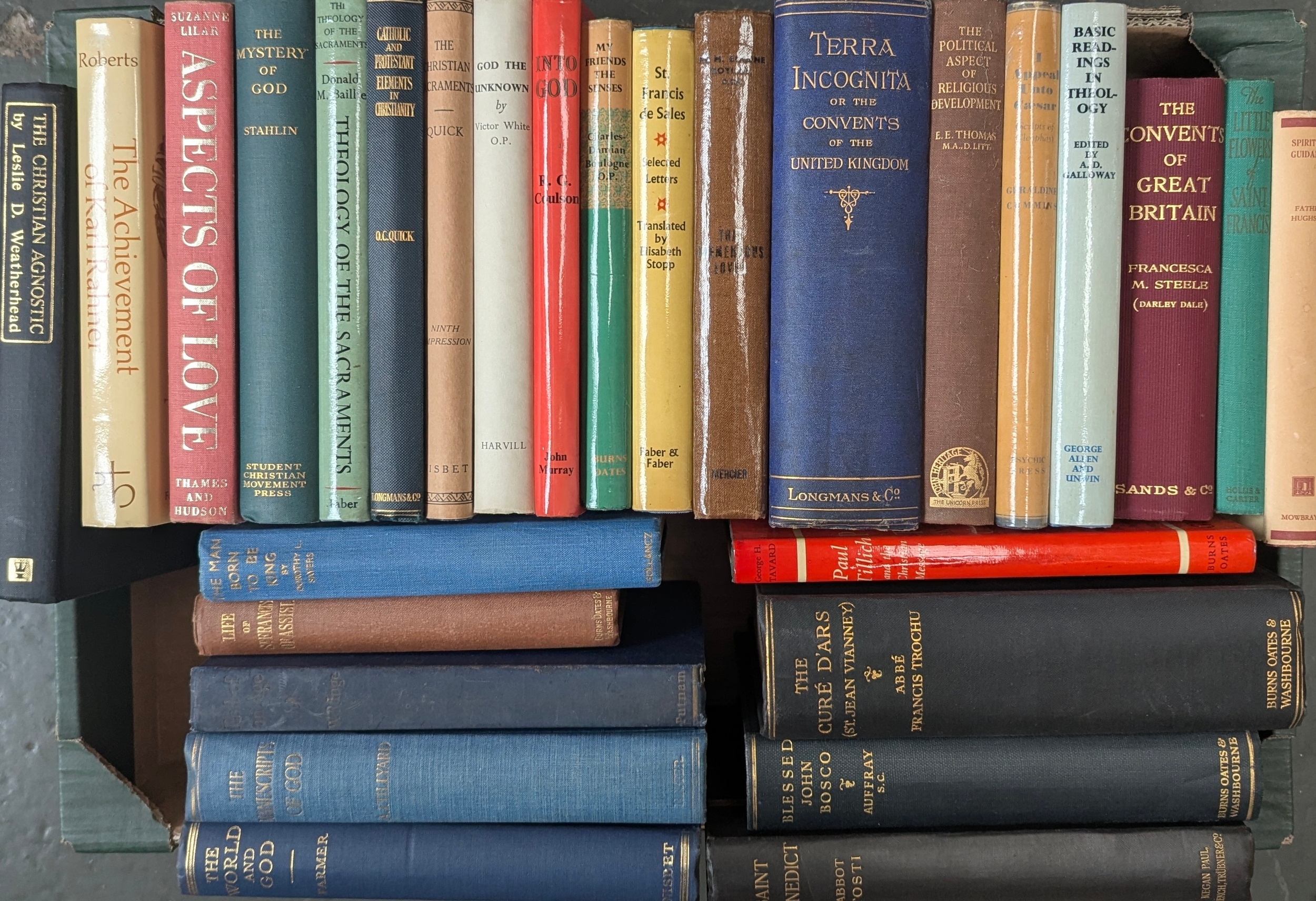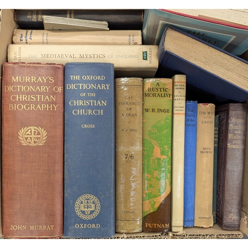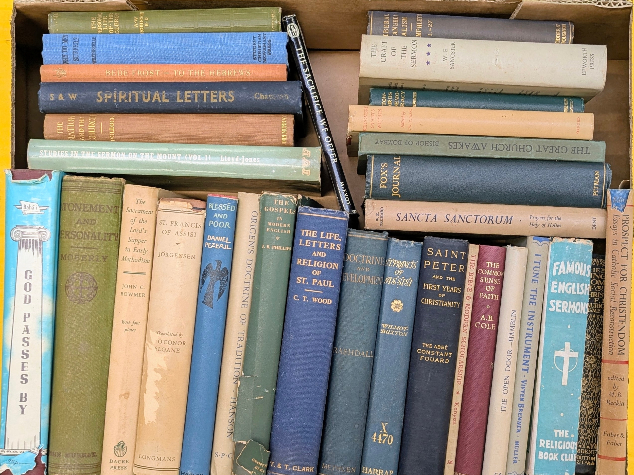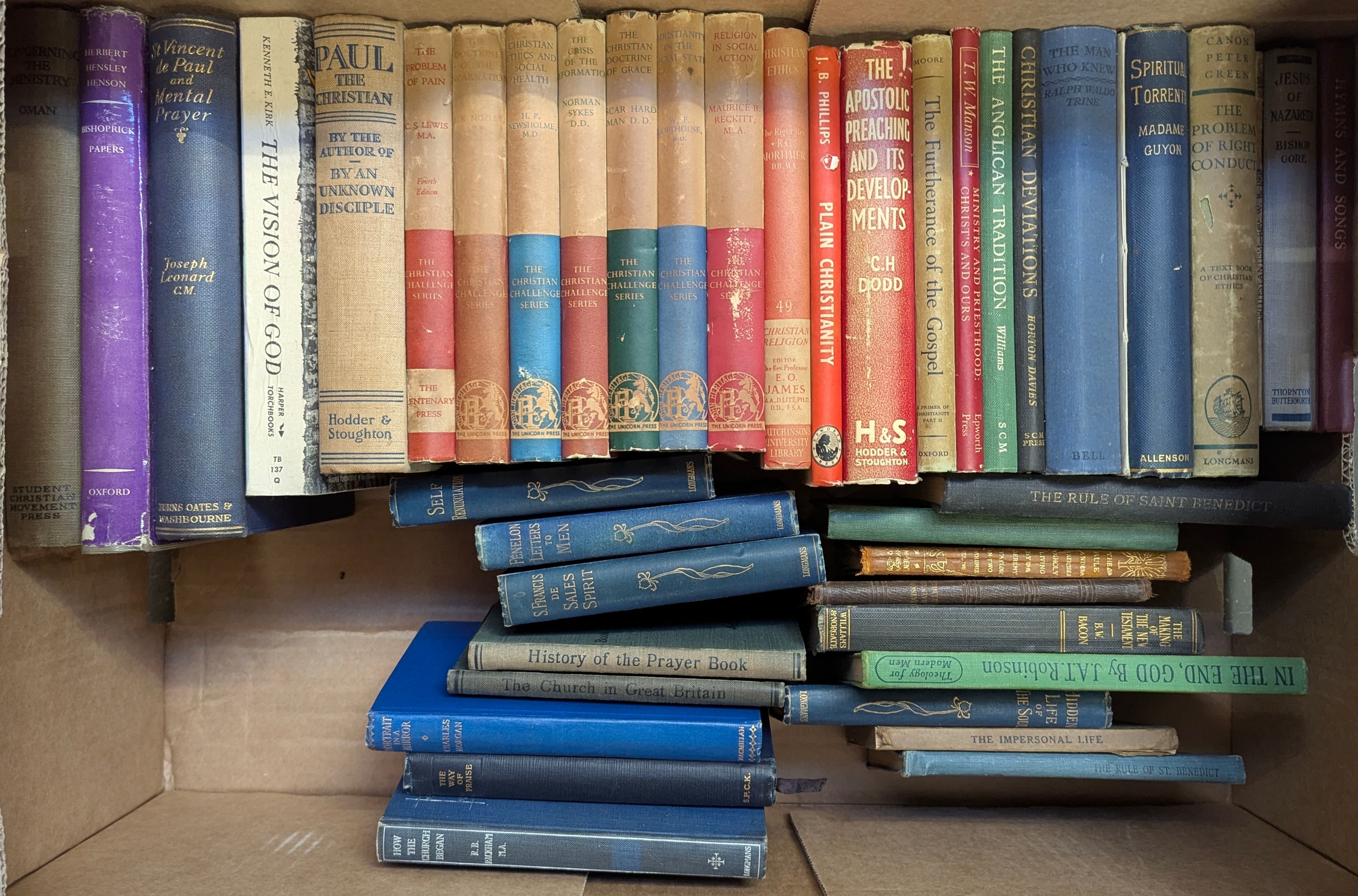 BOOKS, CHRISTIANITY AND CHRISTIAN THOUGHT. Three boxes. Various studies; doctrinal discussions; saints; British convents; the Sacraments; Saints; Cleophas; and numerous others. Authors include D.L.Sayers, Paul Tillich, W.R.Inge etc etc. Inc. a number of jacketed editions from the 'Christian Challenge Series' (Unicorn Press).