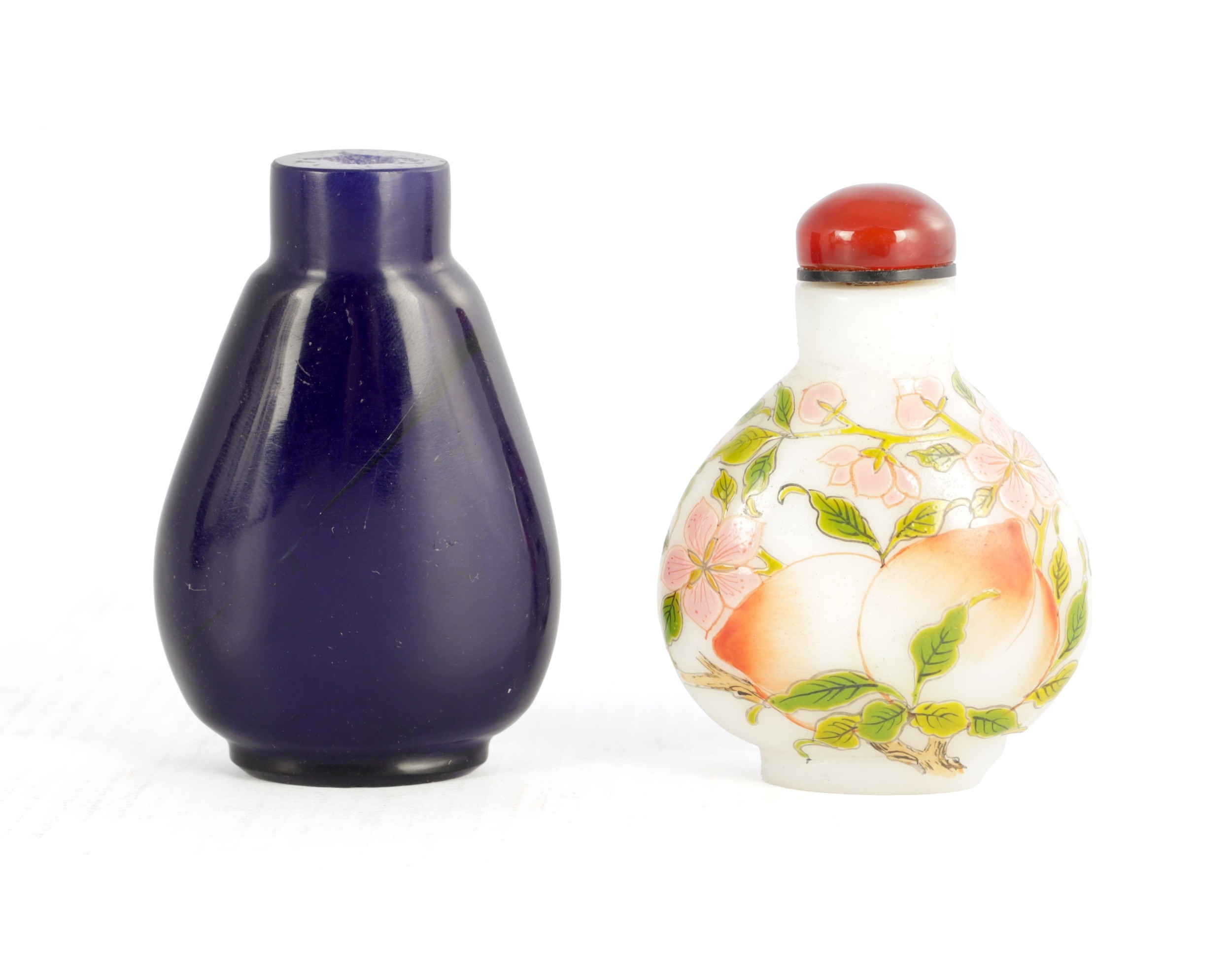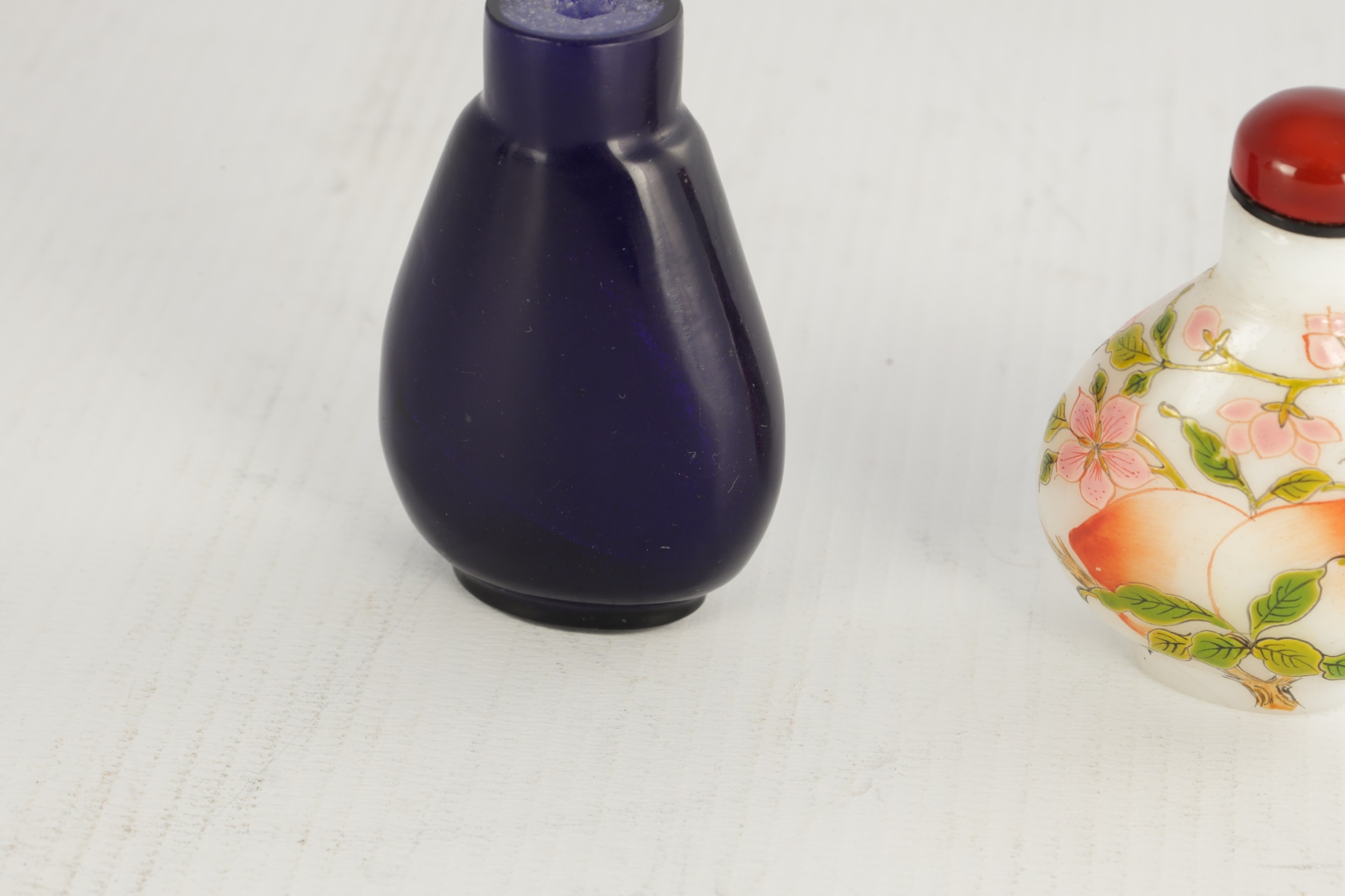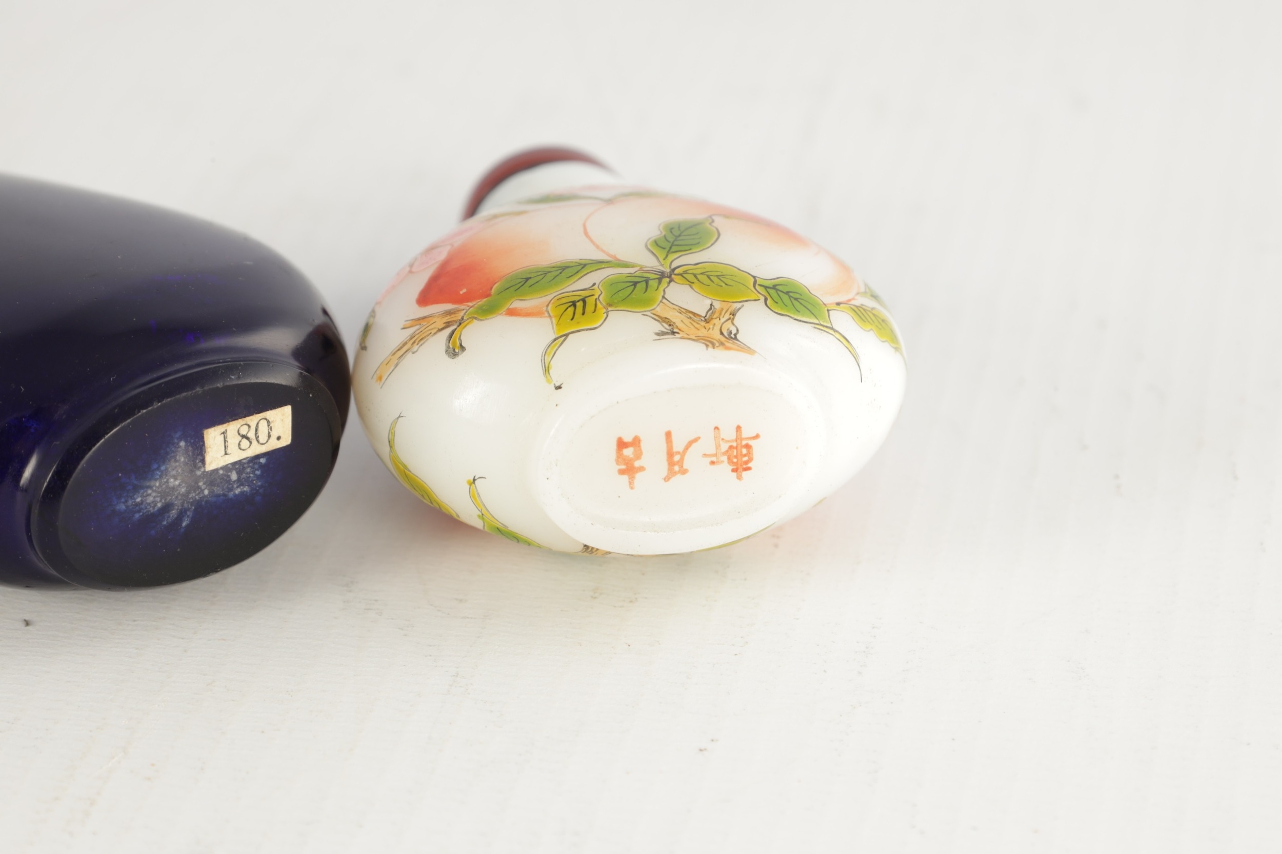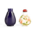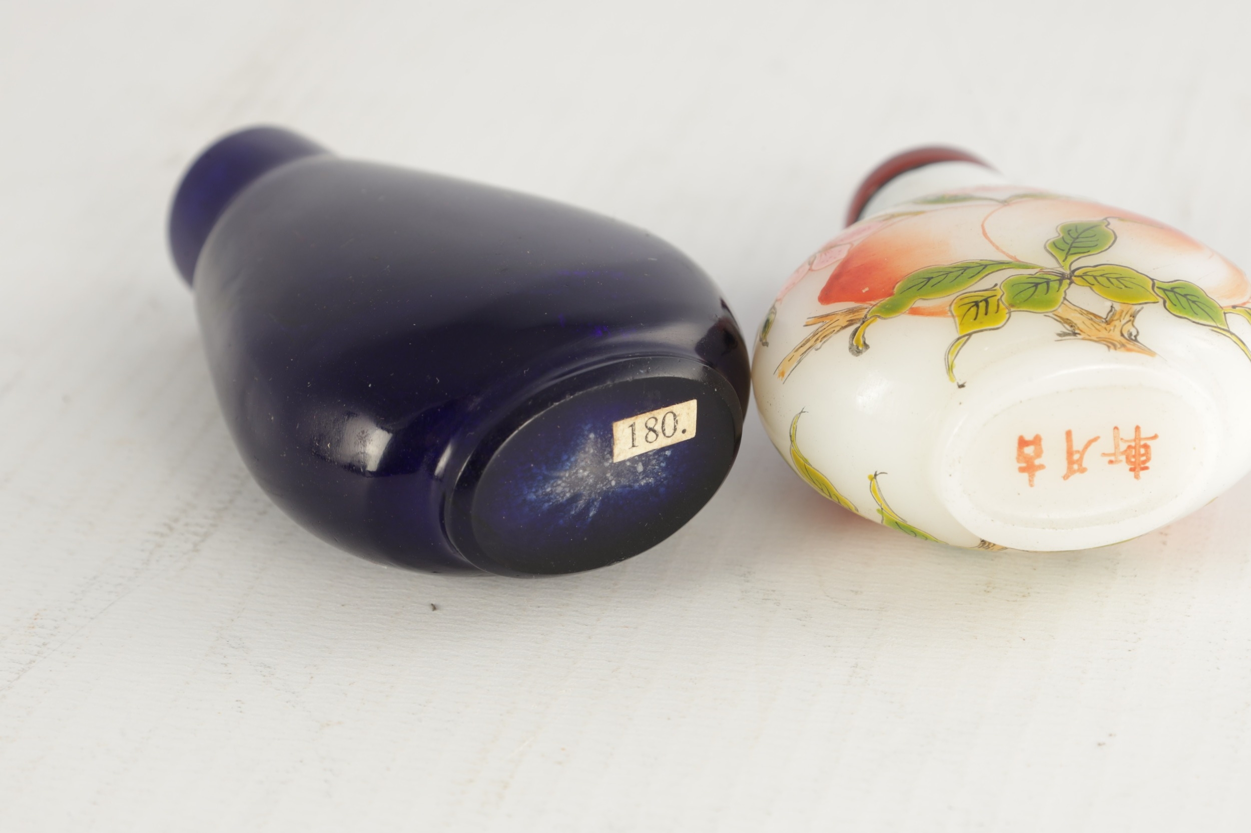 A 19TH CENTURY CHINESE WHITE GLASS AND ENAMEL SNUFF BOTTLE decorated with peaches amongst flowering branchwork, with red cabochon stopper TOGETHER WITH ANOTHER BLUE GLASS SNUFF BOTTLE. (6cm high)