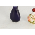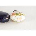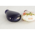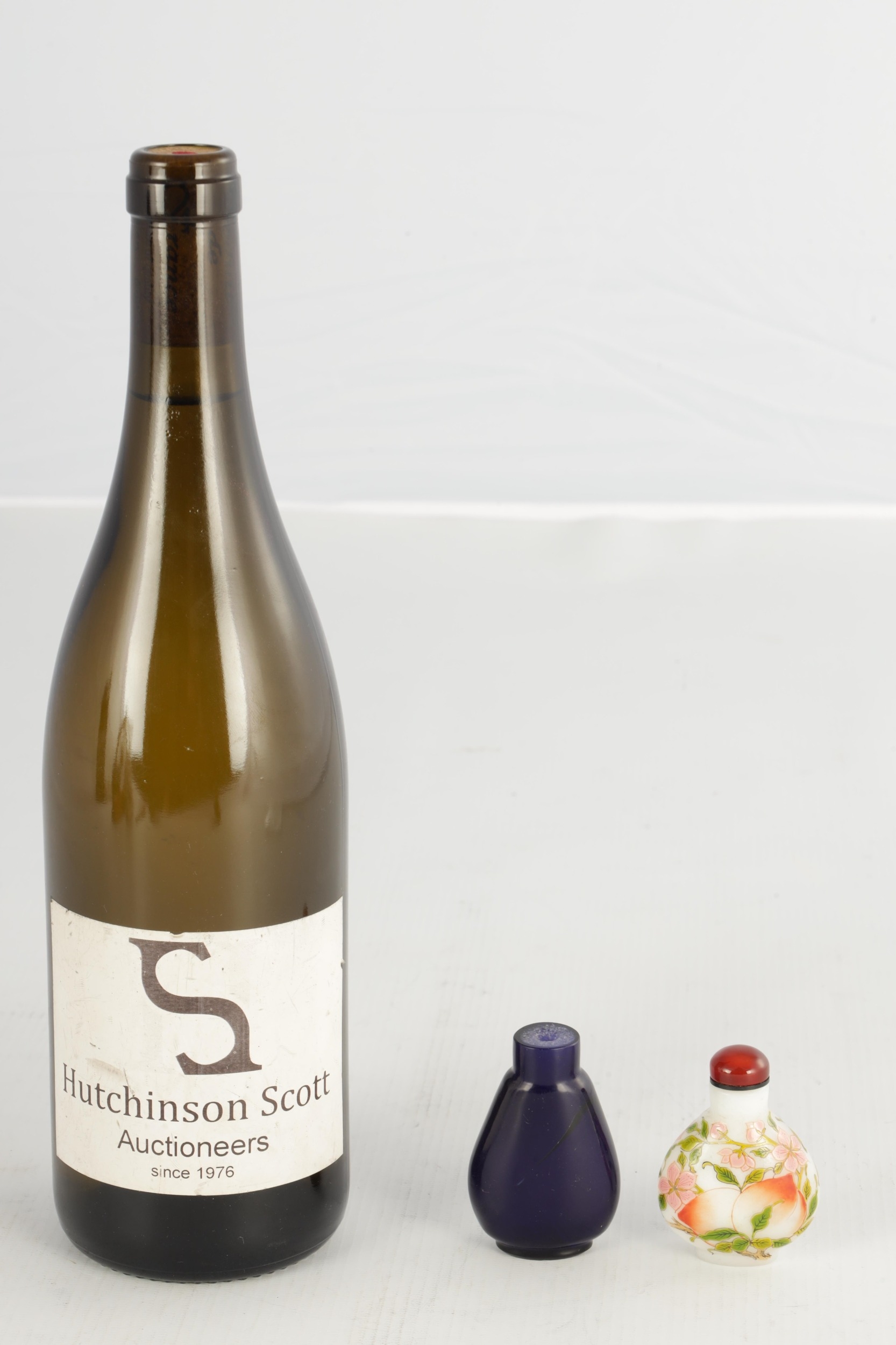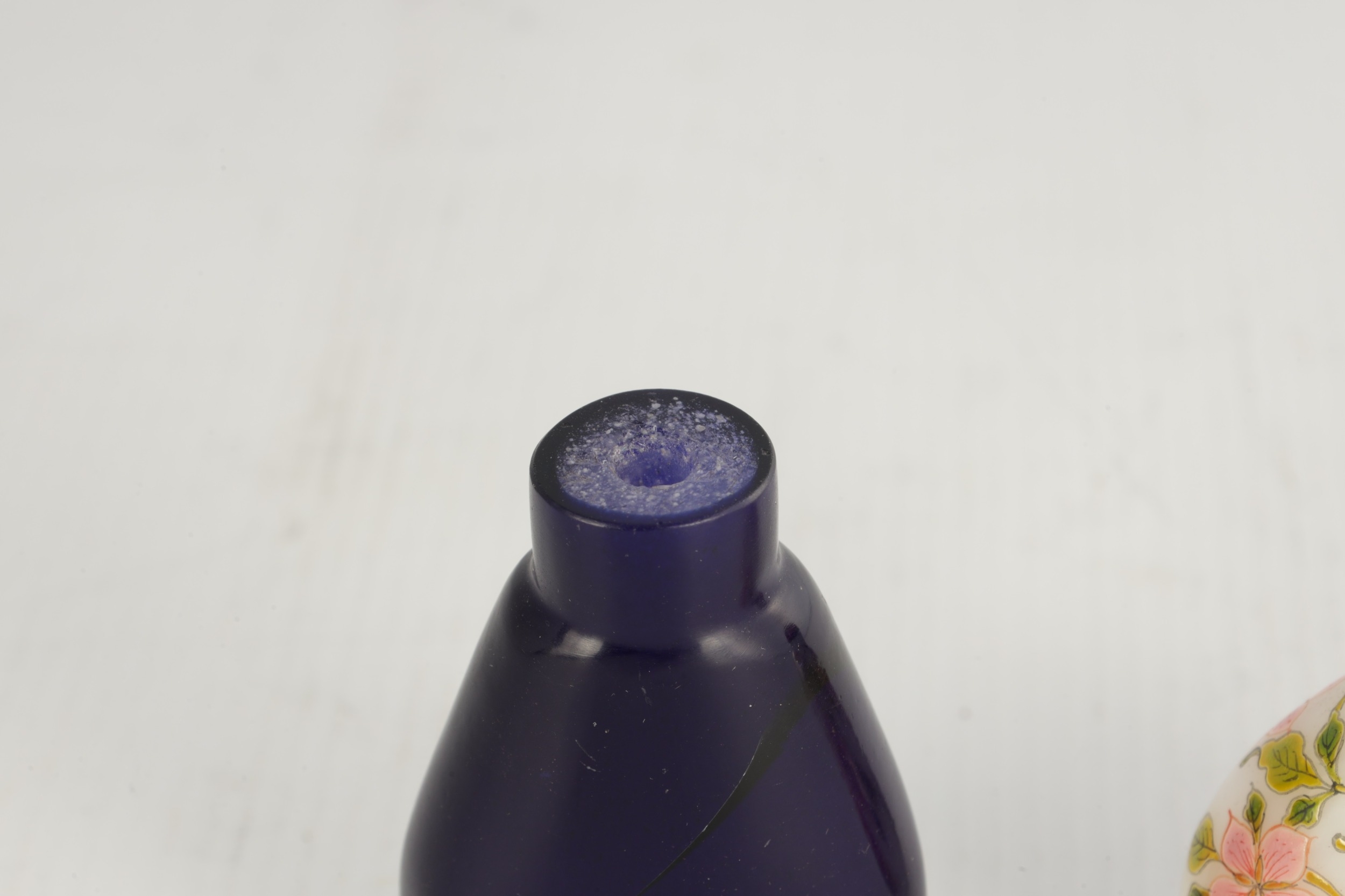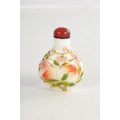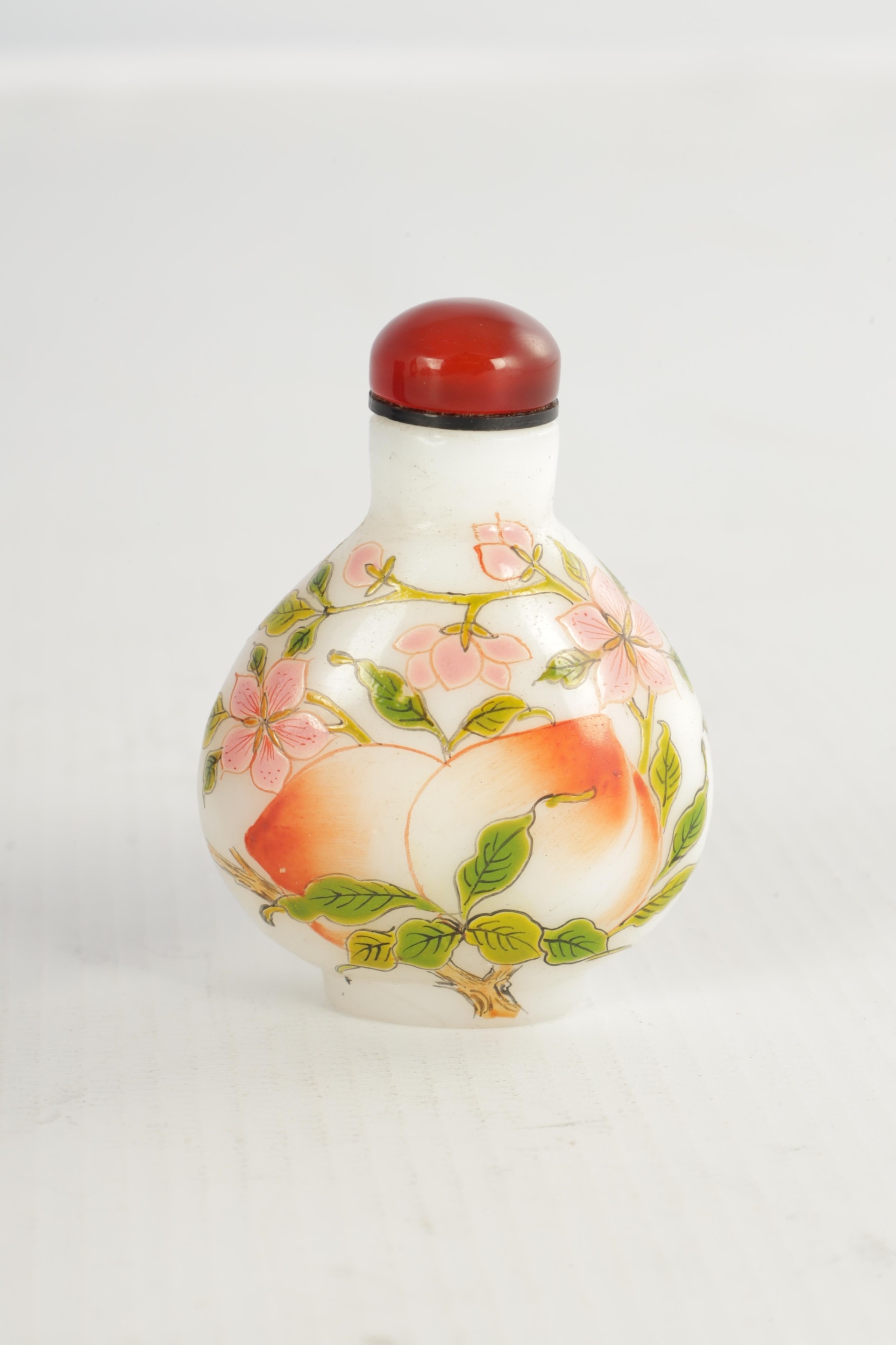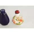 A 19TH CENTURY CHINESE WHITE GLASS AND ENAMEL SNUFF BOTTLE decorated with peaches amongst flowering branchwork, with red cabochon stopper TOGETHER WITH ANOTHER BLUE GLASS SNUFF BOTTLE. (6cm high)