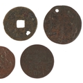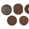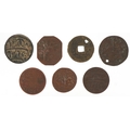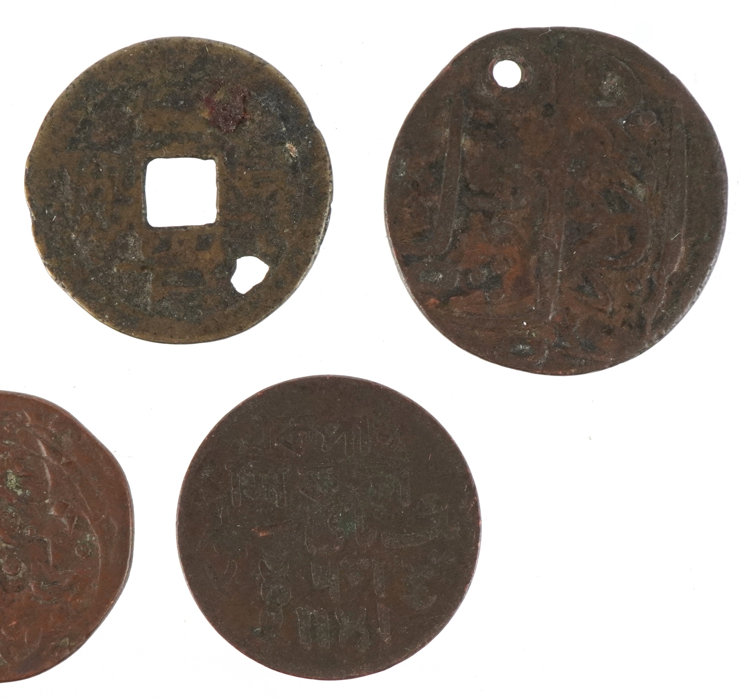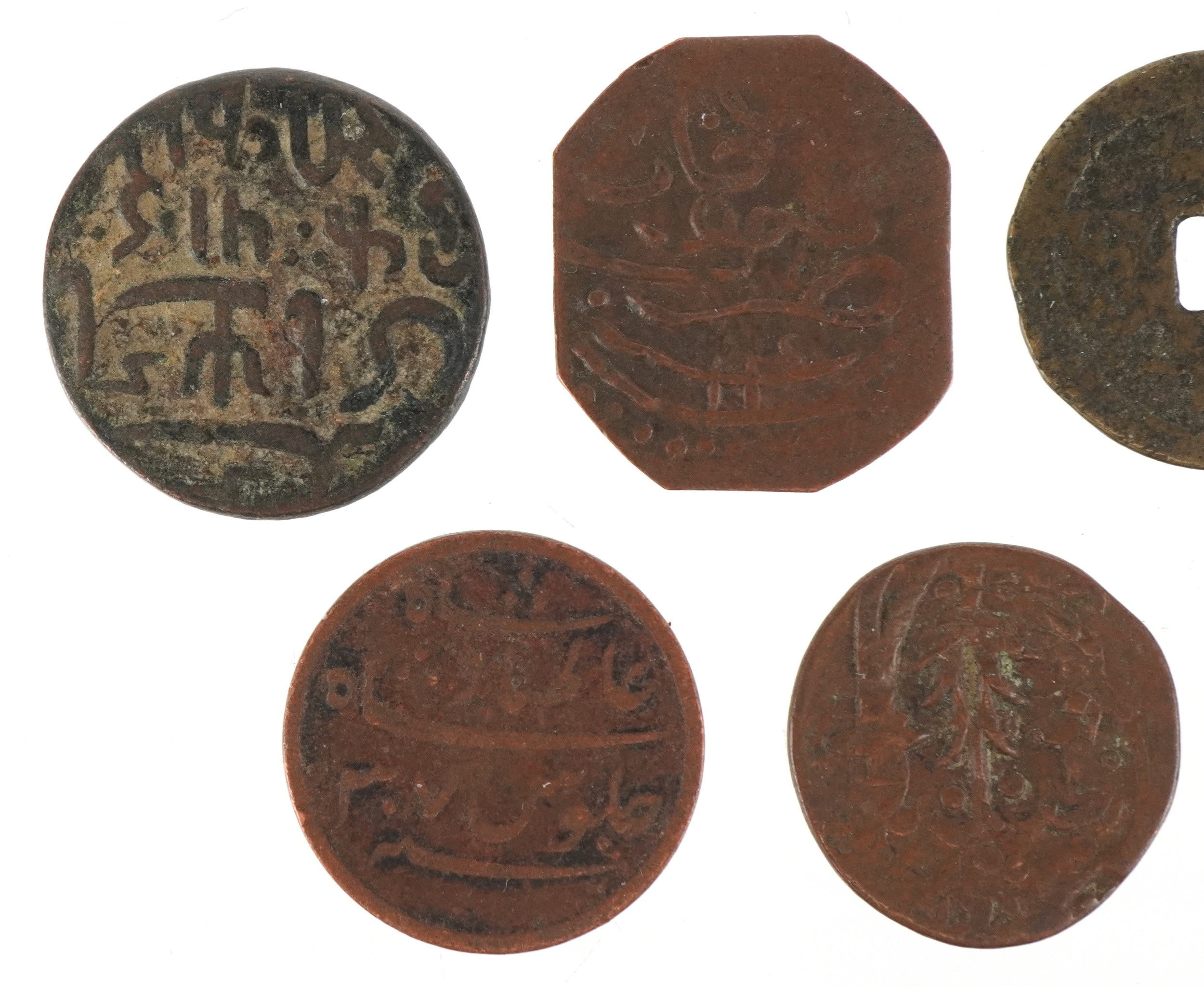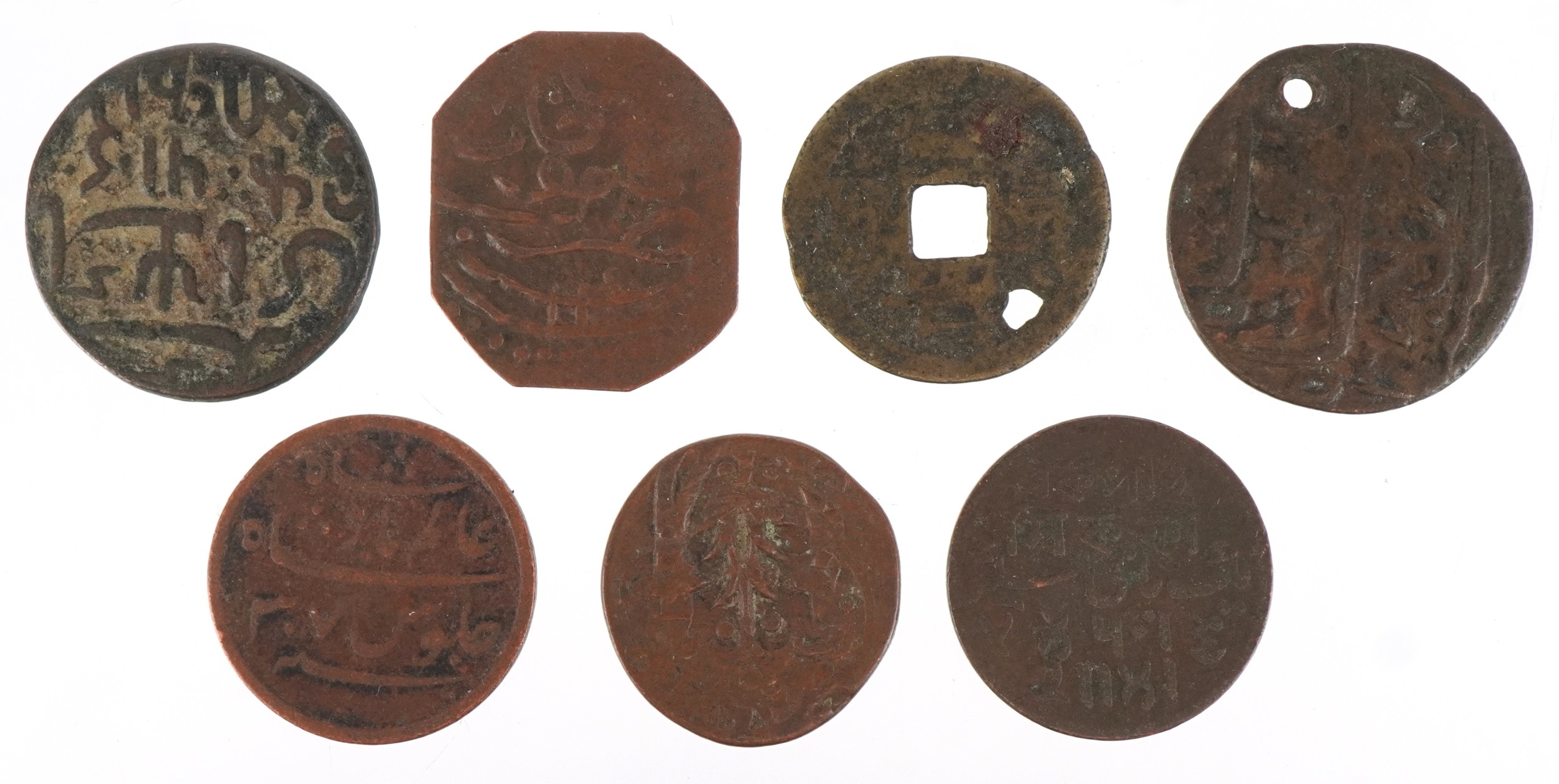 Six 18th/19th century British East India Company Bengal Presidency copper coins, possibly from the Mughal Emperor Shah Alam II together with an antique Chinese cash coin.