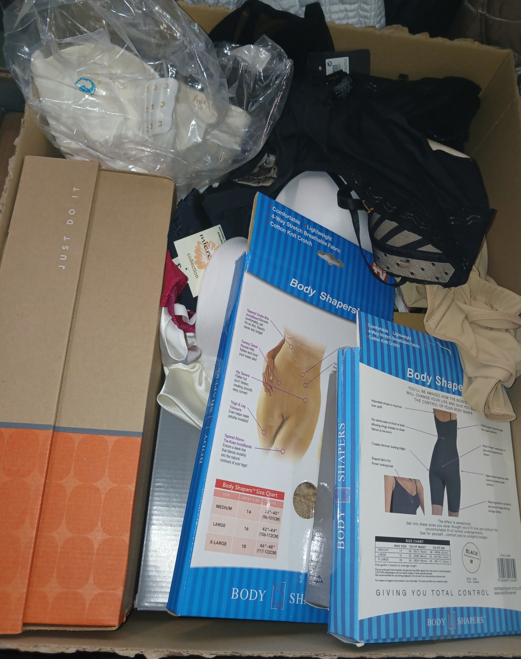 A box containing three boxed Ladies fashion shoes and a quantity of ladies "tagged" underware,