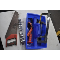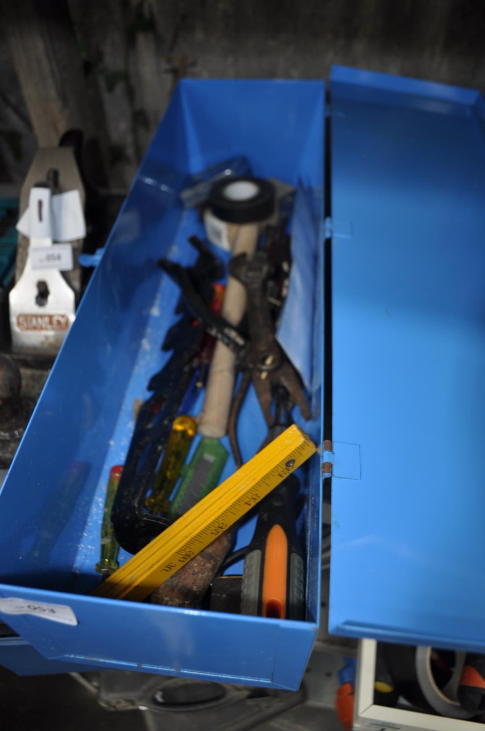 BLUE METAL TOOLBOX OF ASST TOOLS INC TAPE MEASURES ETC