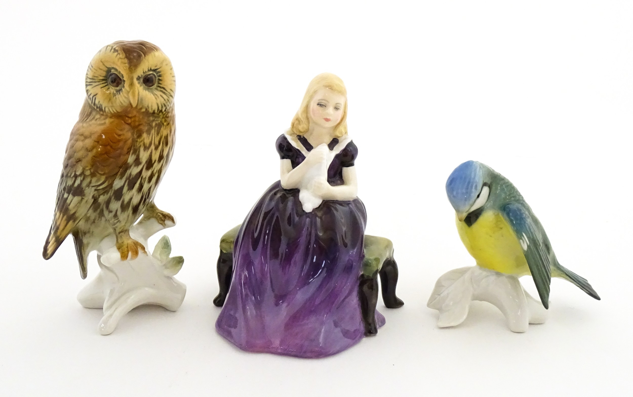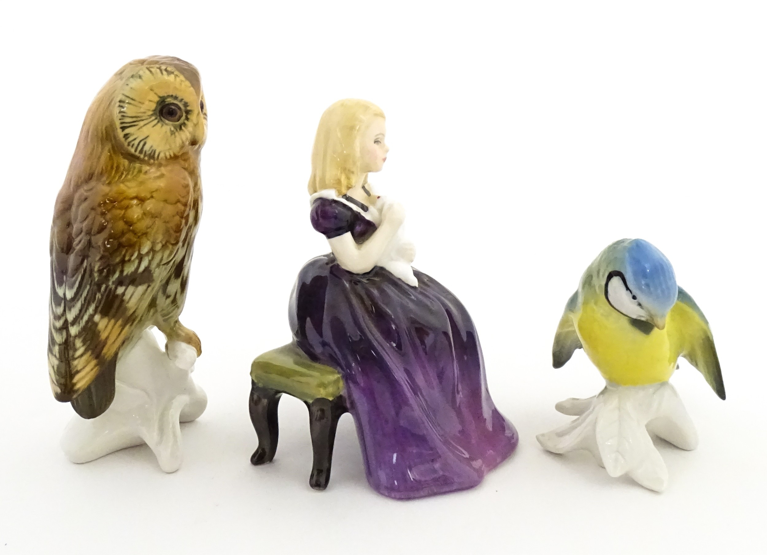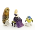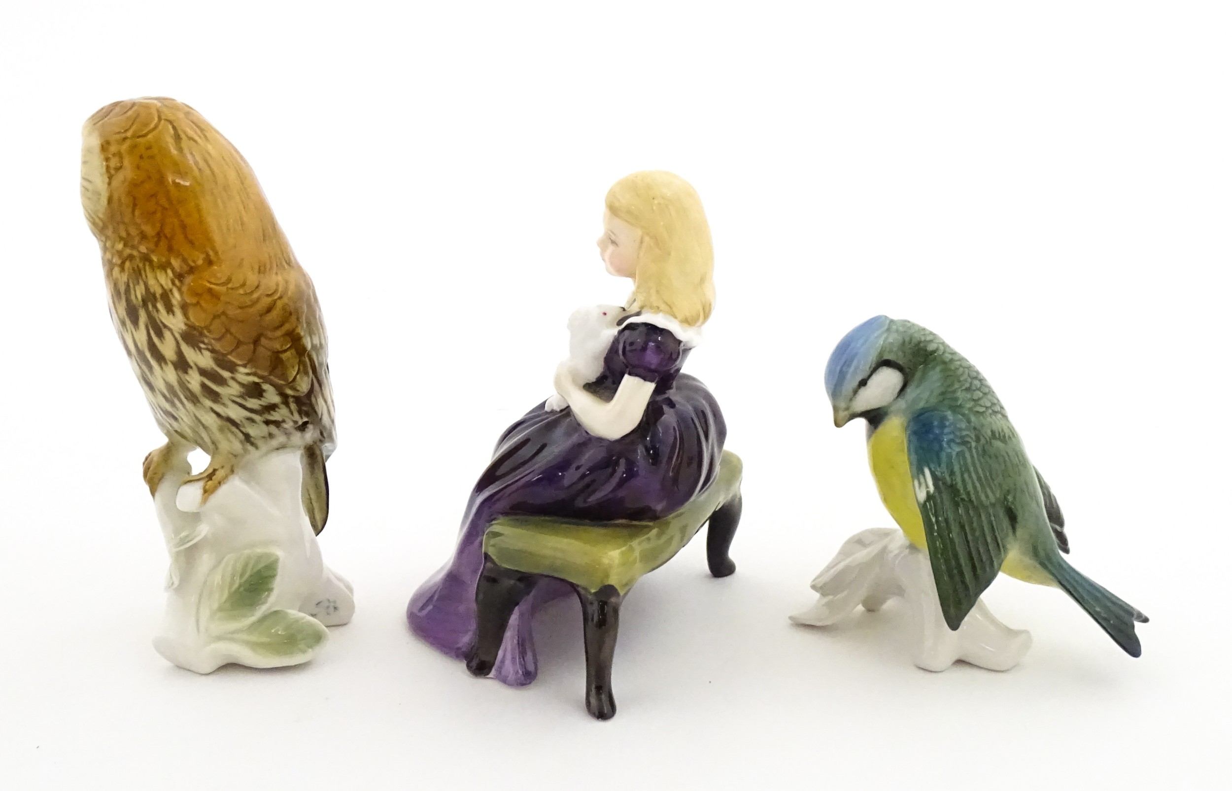 Two Karl Ens models of birds comprising an owl and a blue tit. Together with a Royal Doulton model Affection HN2236. Largest approx. 5 1/4" high (3)