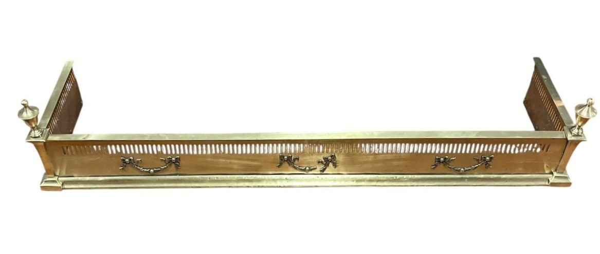 A VINTAGE PIERCED BRASS FENDER with urn finials on stepped platform base 26cm (h) 128cm (d) 33cm (d)