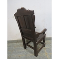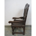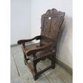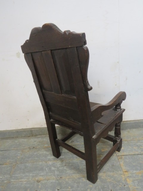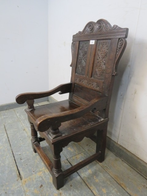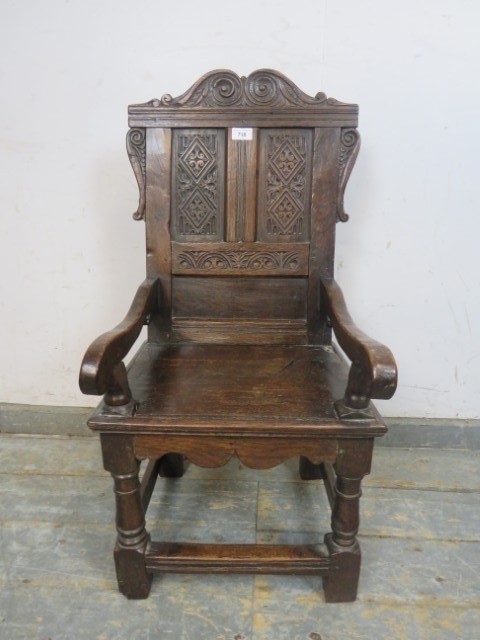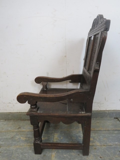 An antique child's wainscot oak chair, with carved pediment and back rest, solid seat, raised upon turned supports united by stretchers. H82cm x W37cm x D42cm approx.