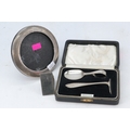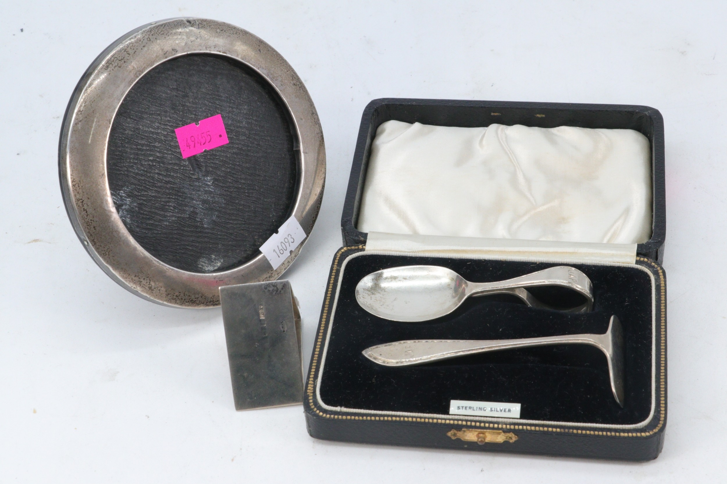 A silver Christining set together with a triangle napkin ring and a small circular silver frame (no glass)