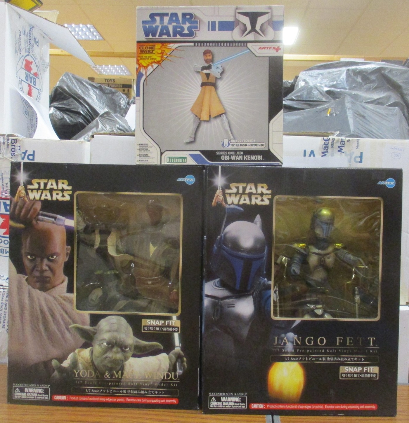 Star Wars. ARTFX. Range of unassembled 1/7 scale kits, generally mint in excellent to near mint boxes, with Jango Fett, The Clone Wars Series One: Jedi Obi-Wan Kenobi and Yoda & Mace Windu. Qty 3 (B)