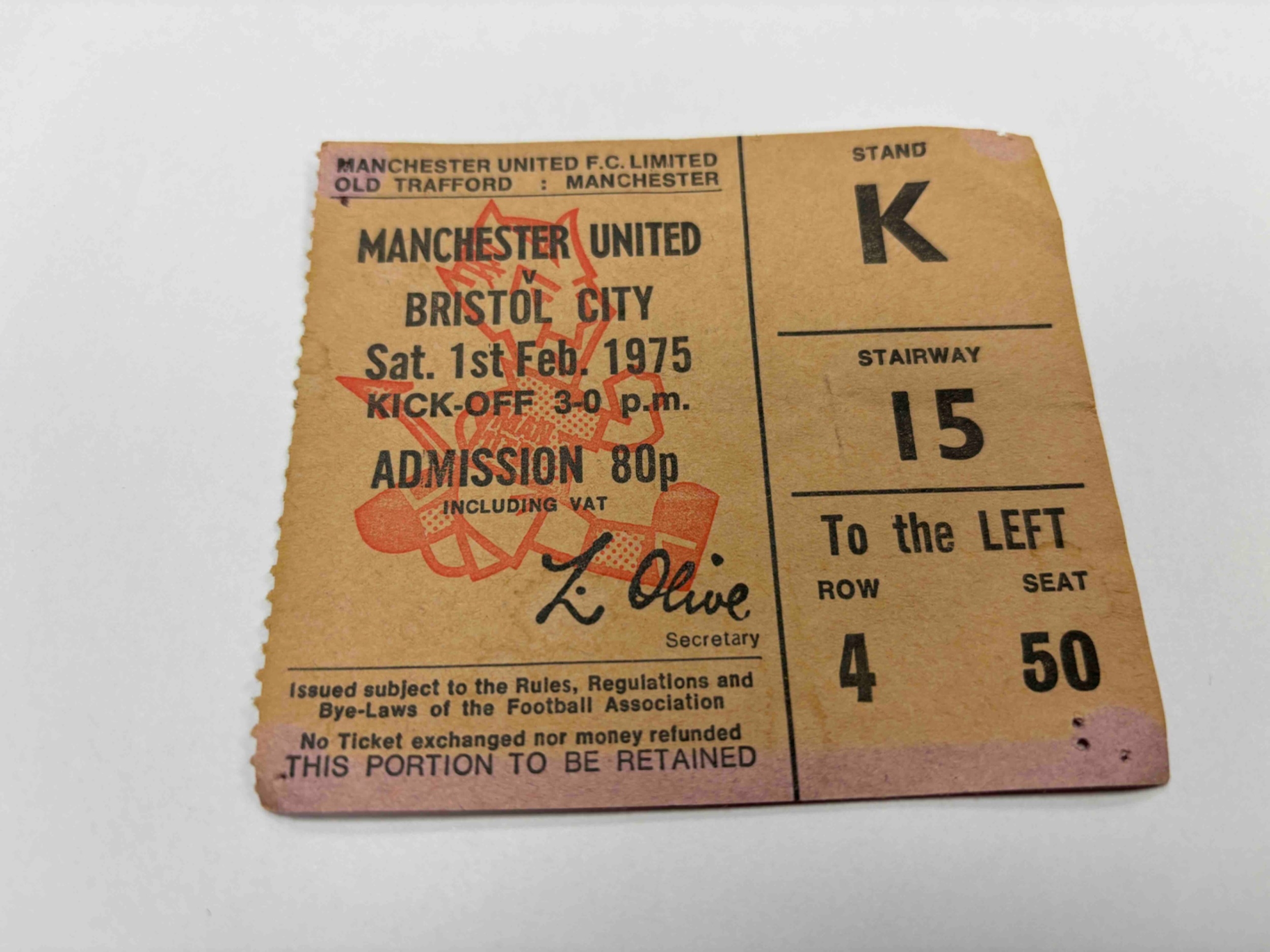 Ticket Manchester United Home v Bristol City, 1974/75 2nd division. Small Pin holes, slight fading bottom edge.