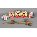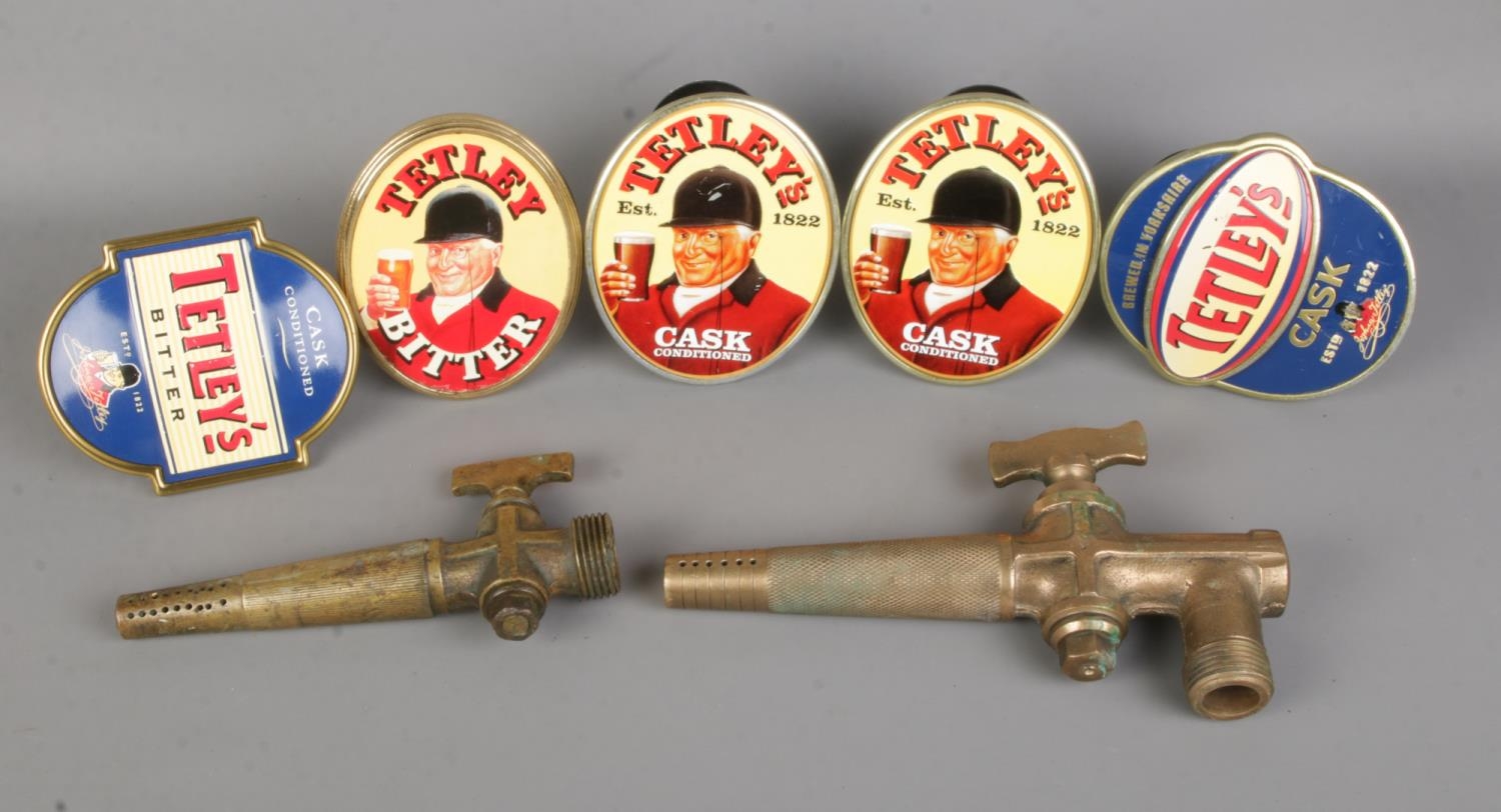 A collection of Tetley's beer pump badges along with two brass keg taps.
