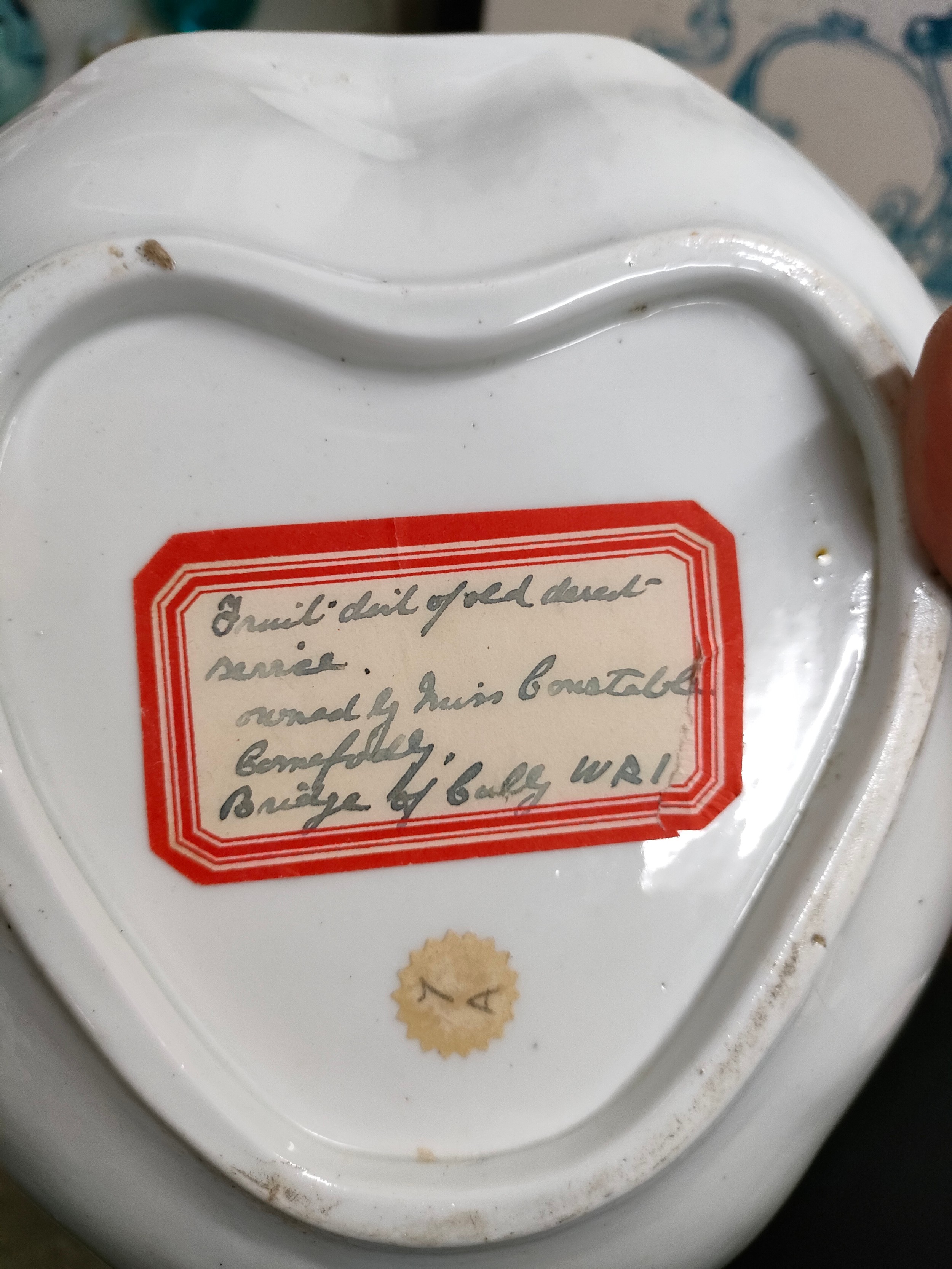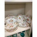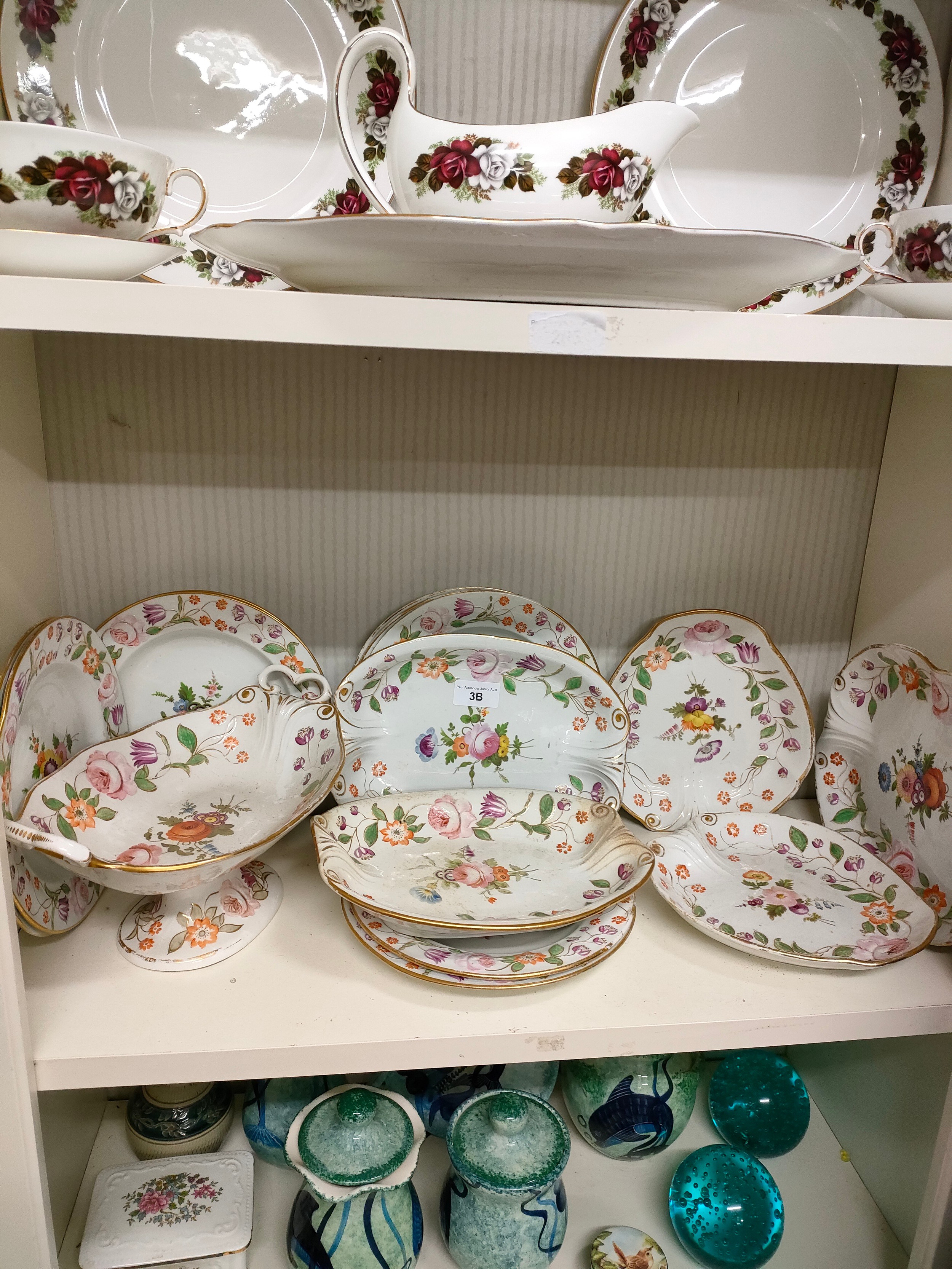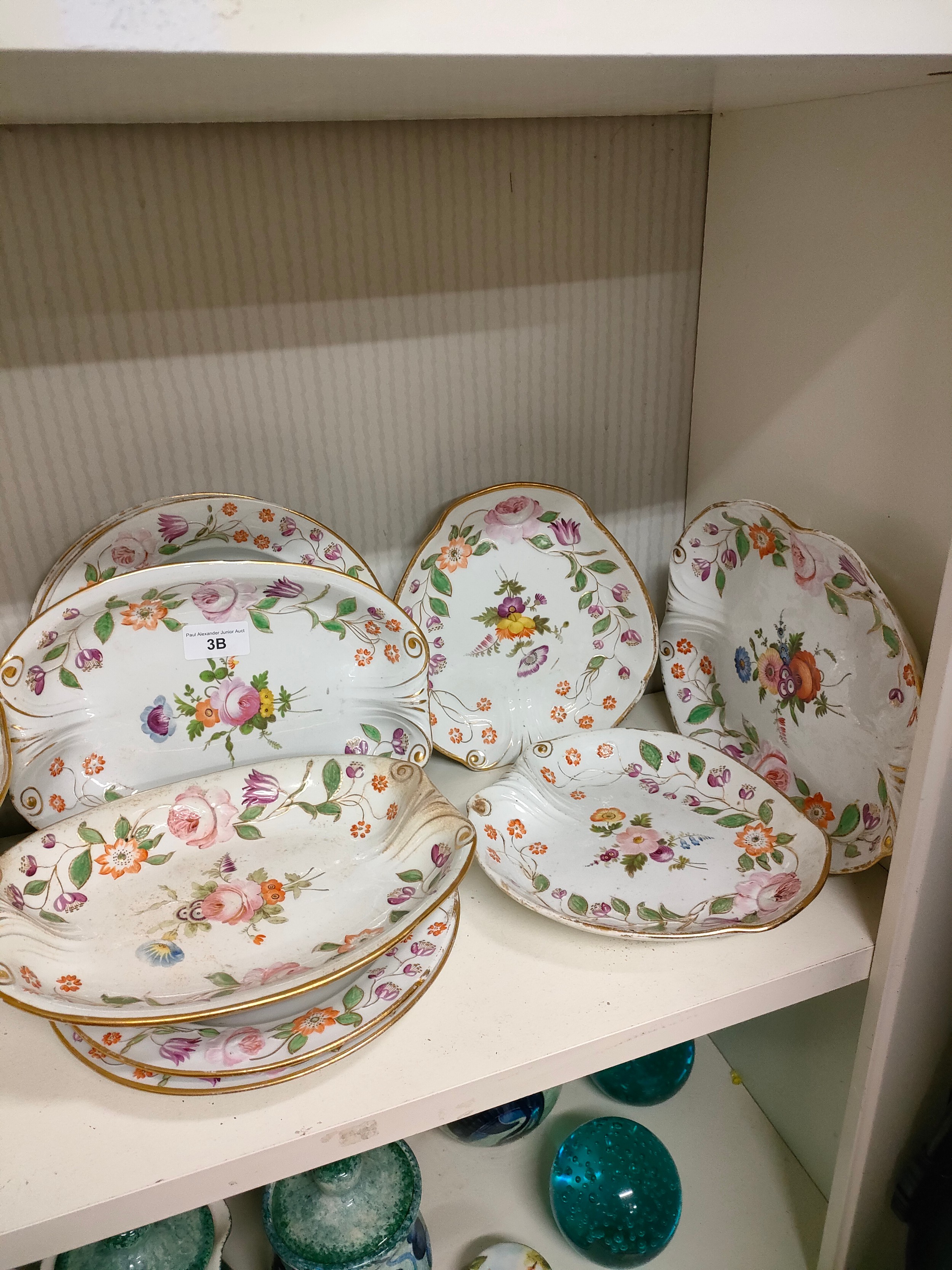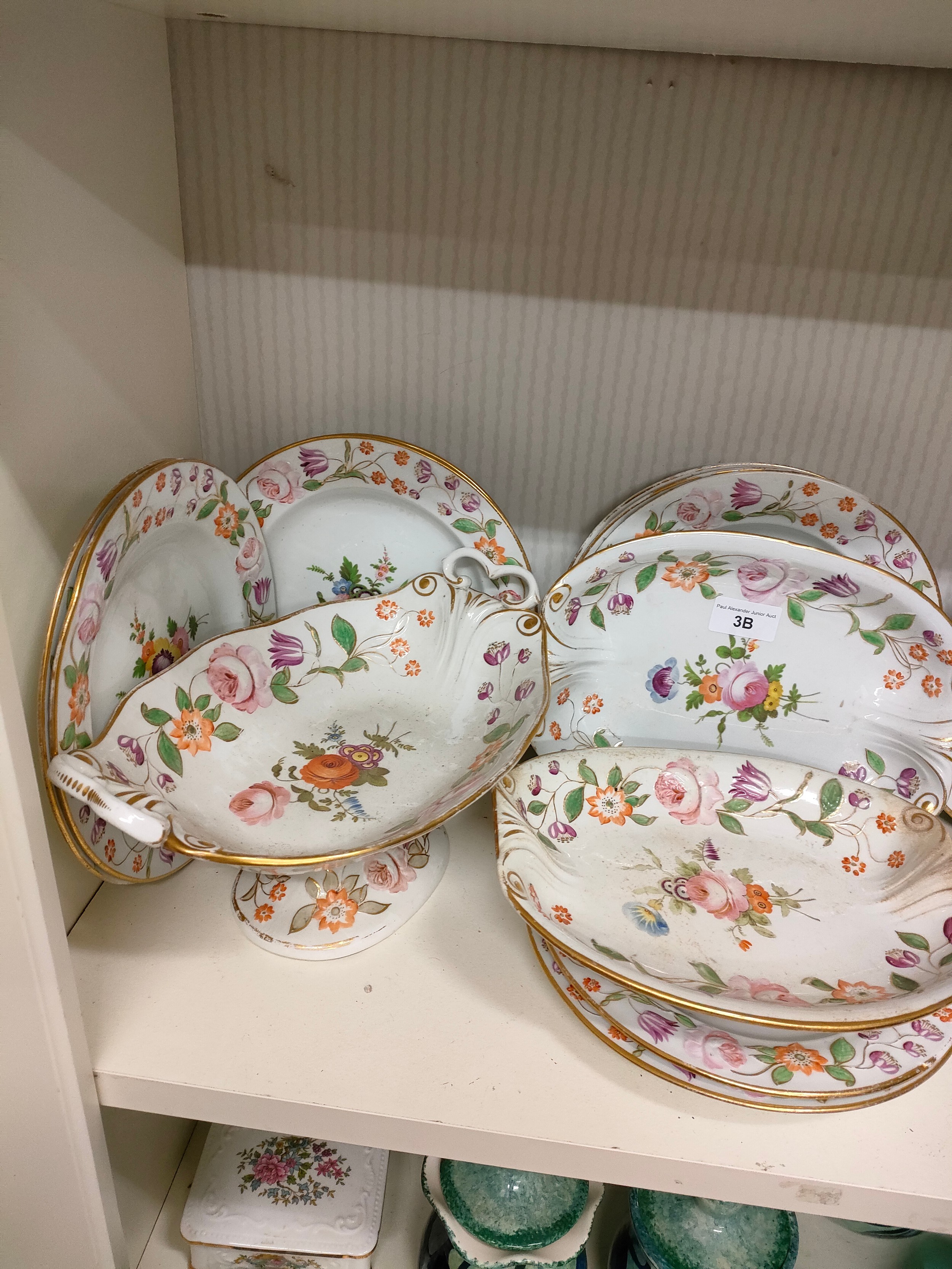 Shelf of quality Victorian 1800s porcelain tazza and plate set .