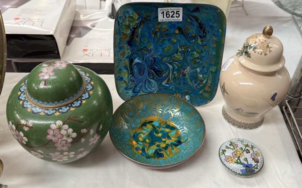 A Chinese cloisonne ginger jar & a selection of enamel on metal pieces & oriental pottery