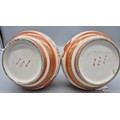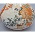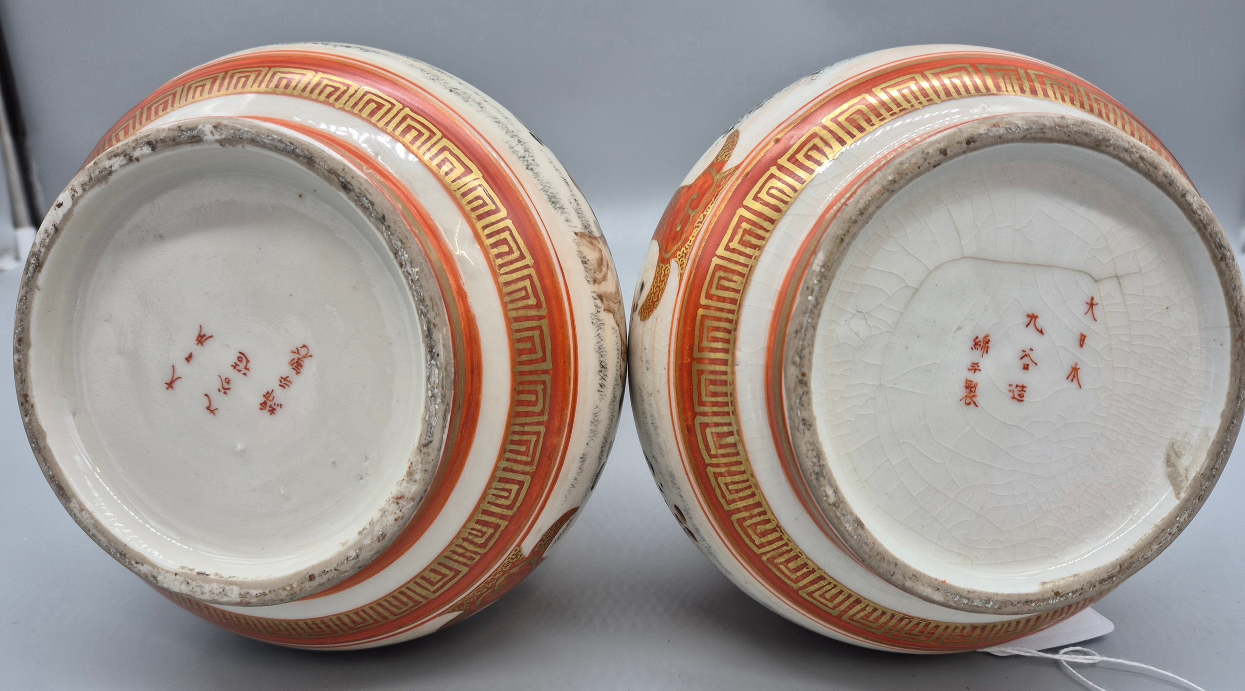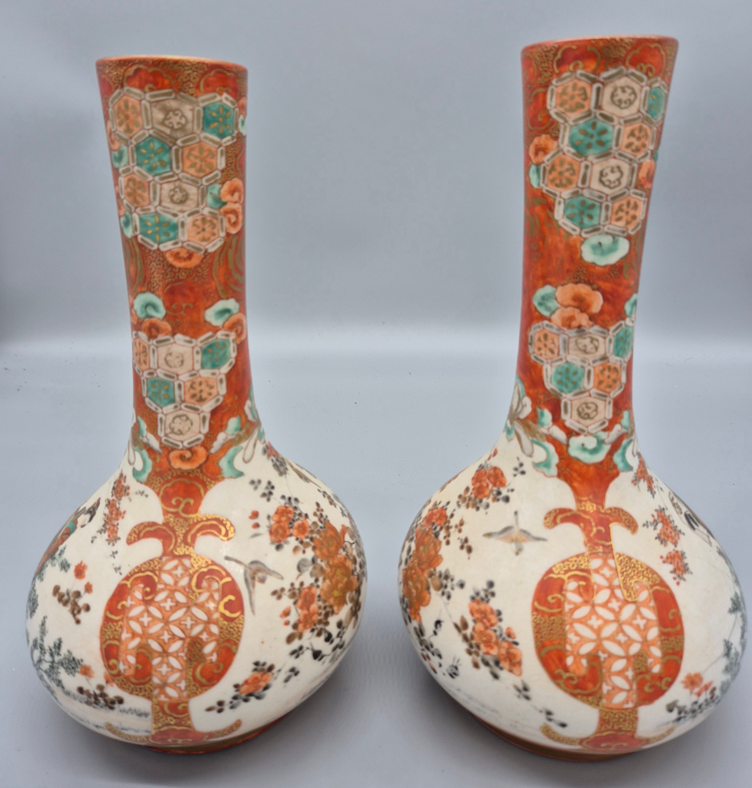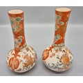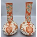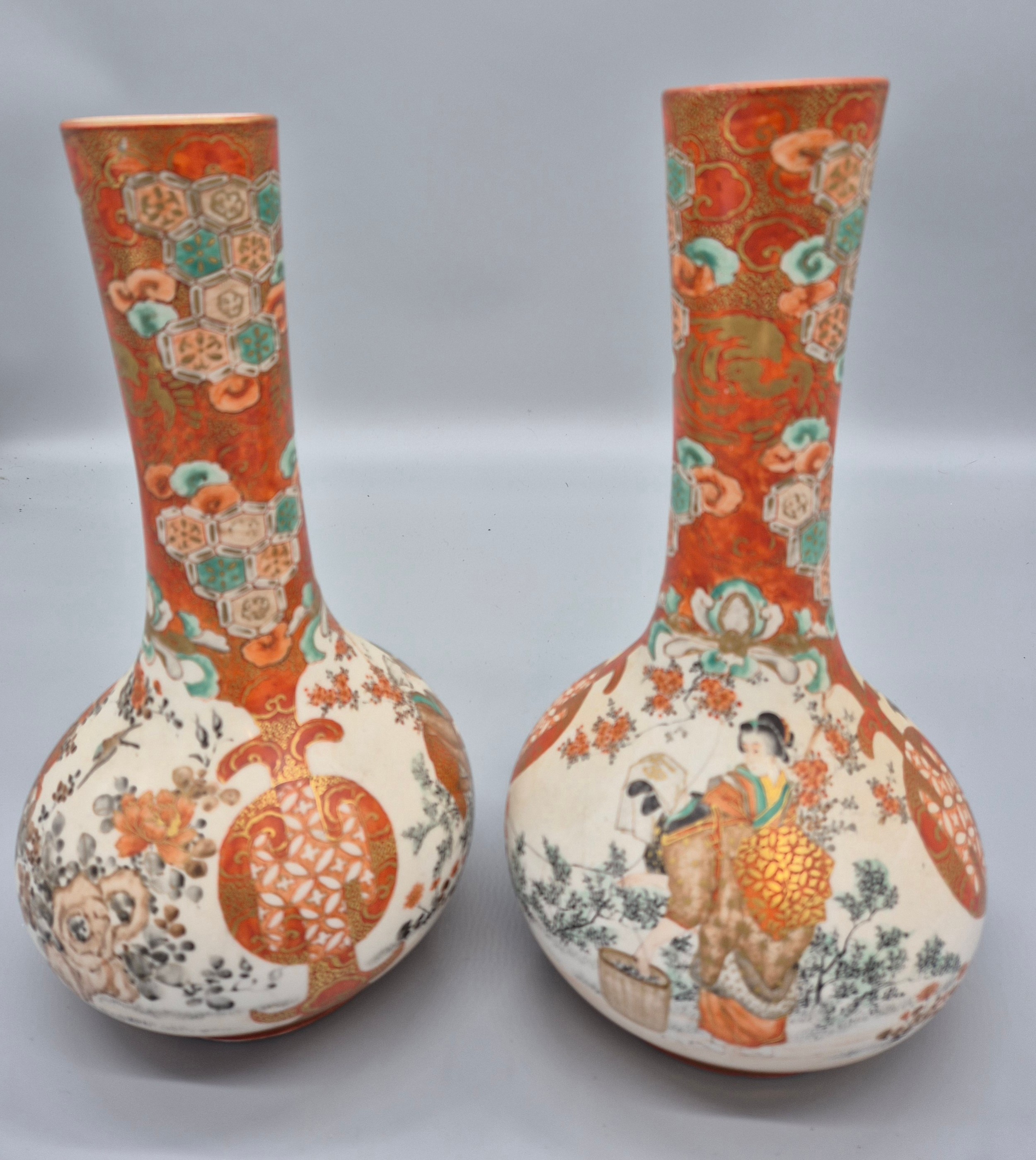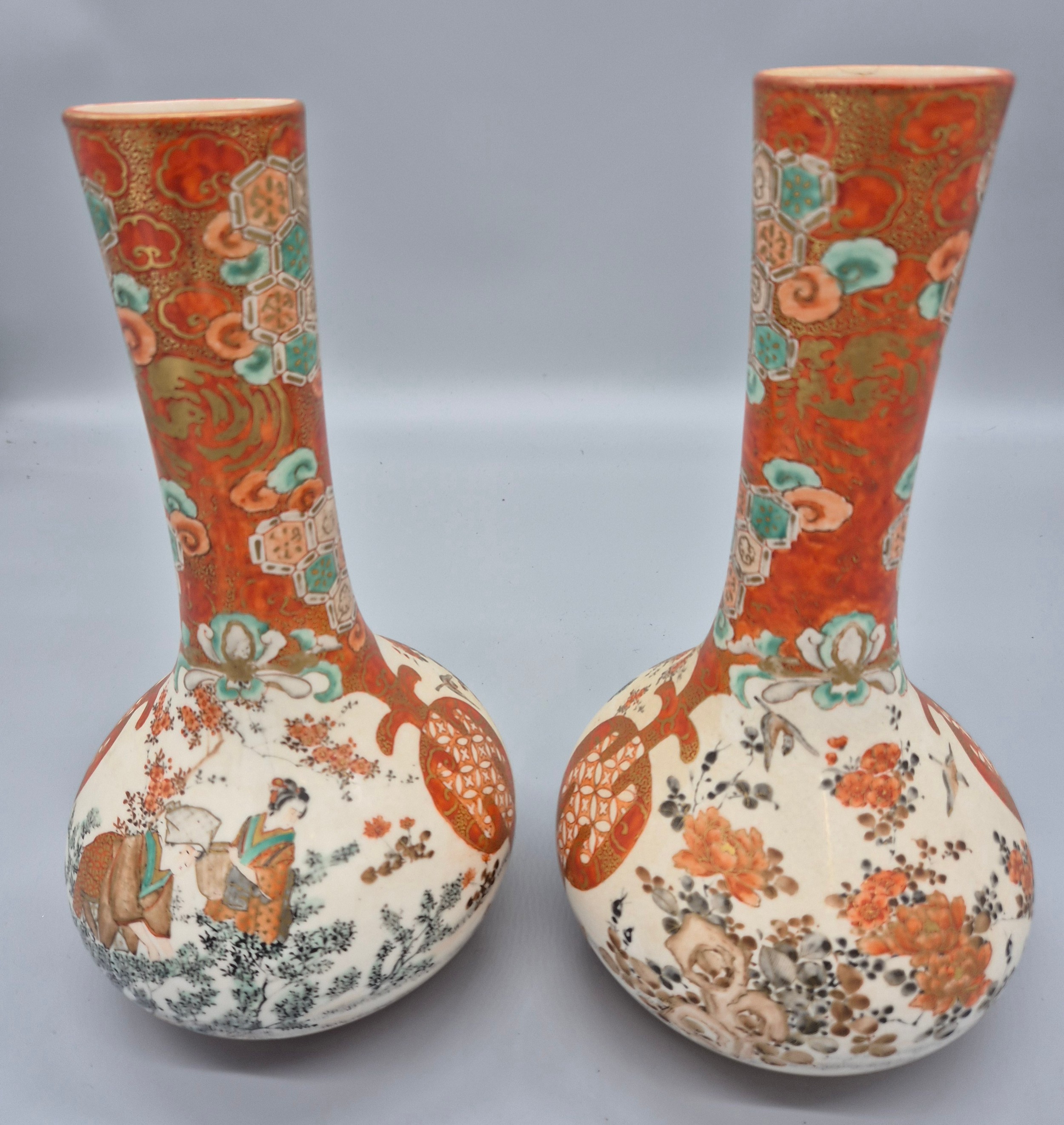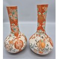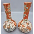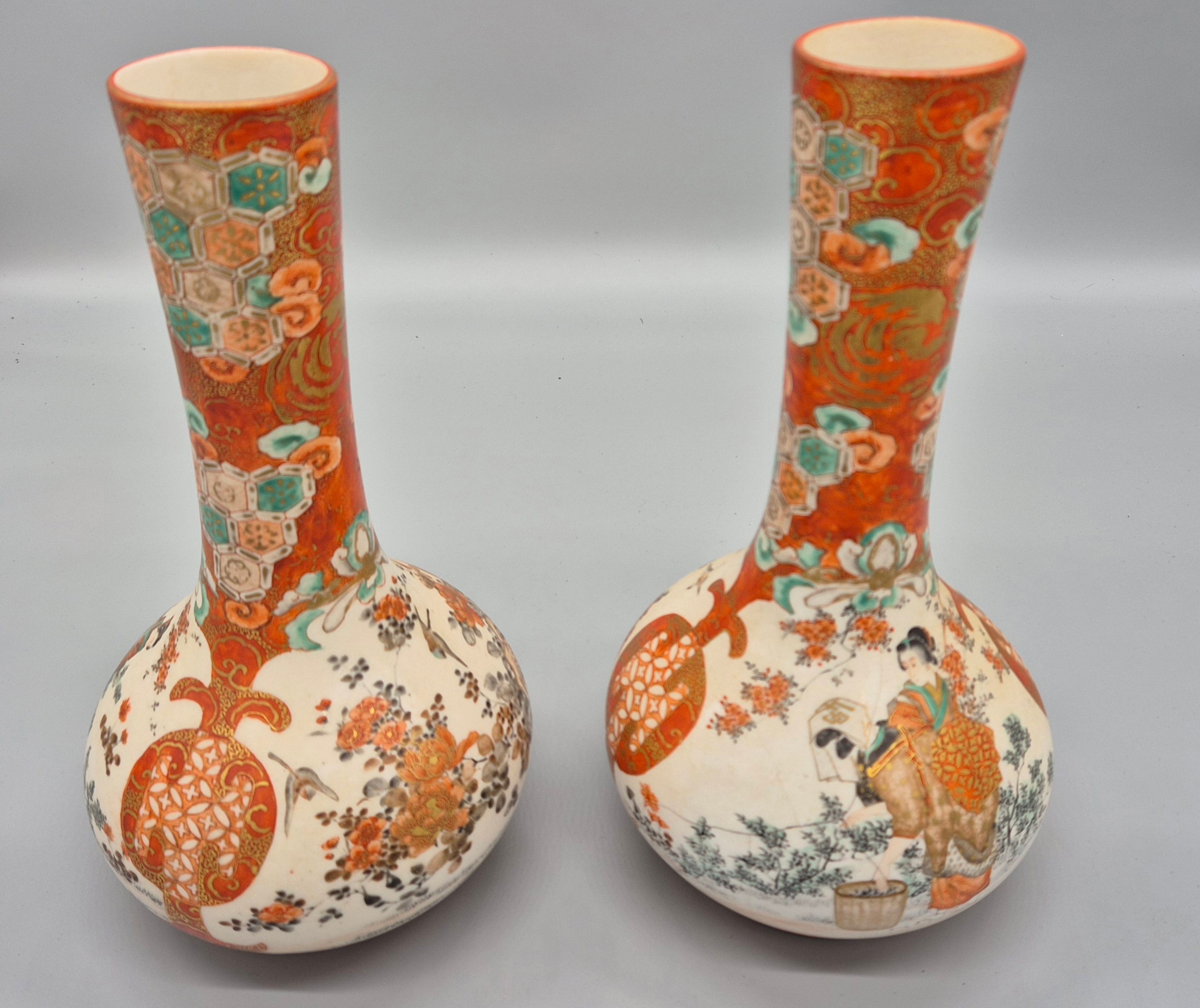 A Pair of 19th century Japanese hand painted bottle neck vases; Orange and neutral ground. Figural, bird and floral painted panels. Signature to the base. [30cm high] [One as found- see images]