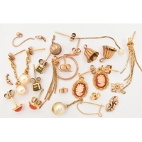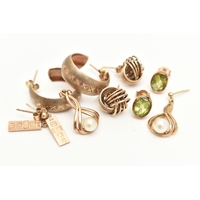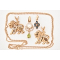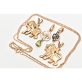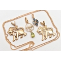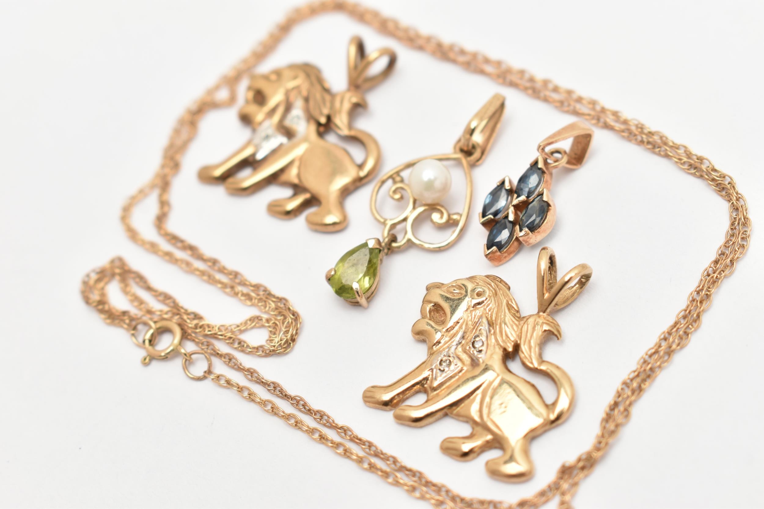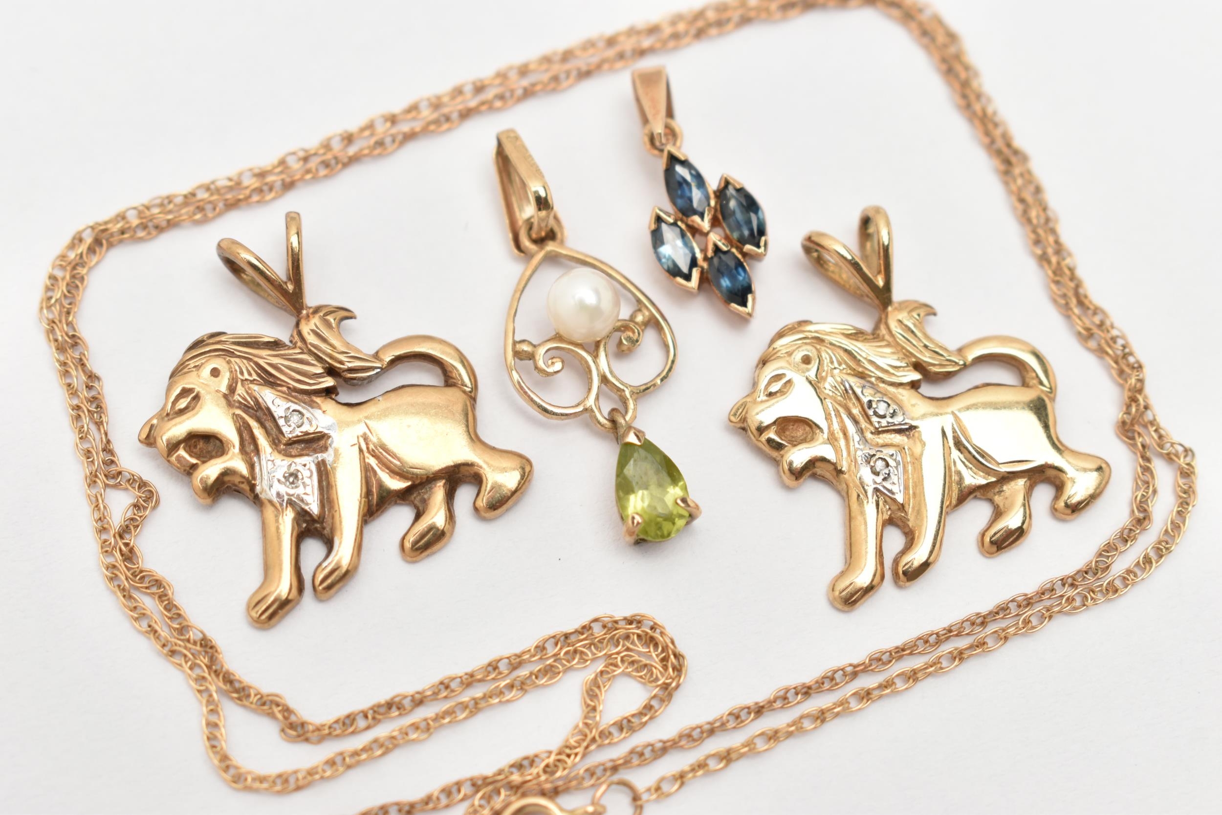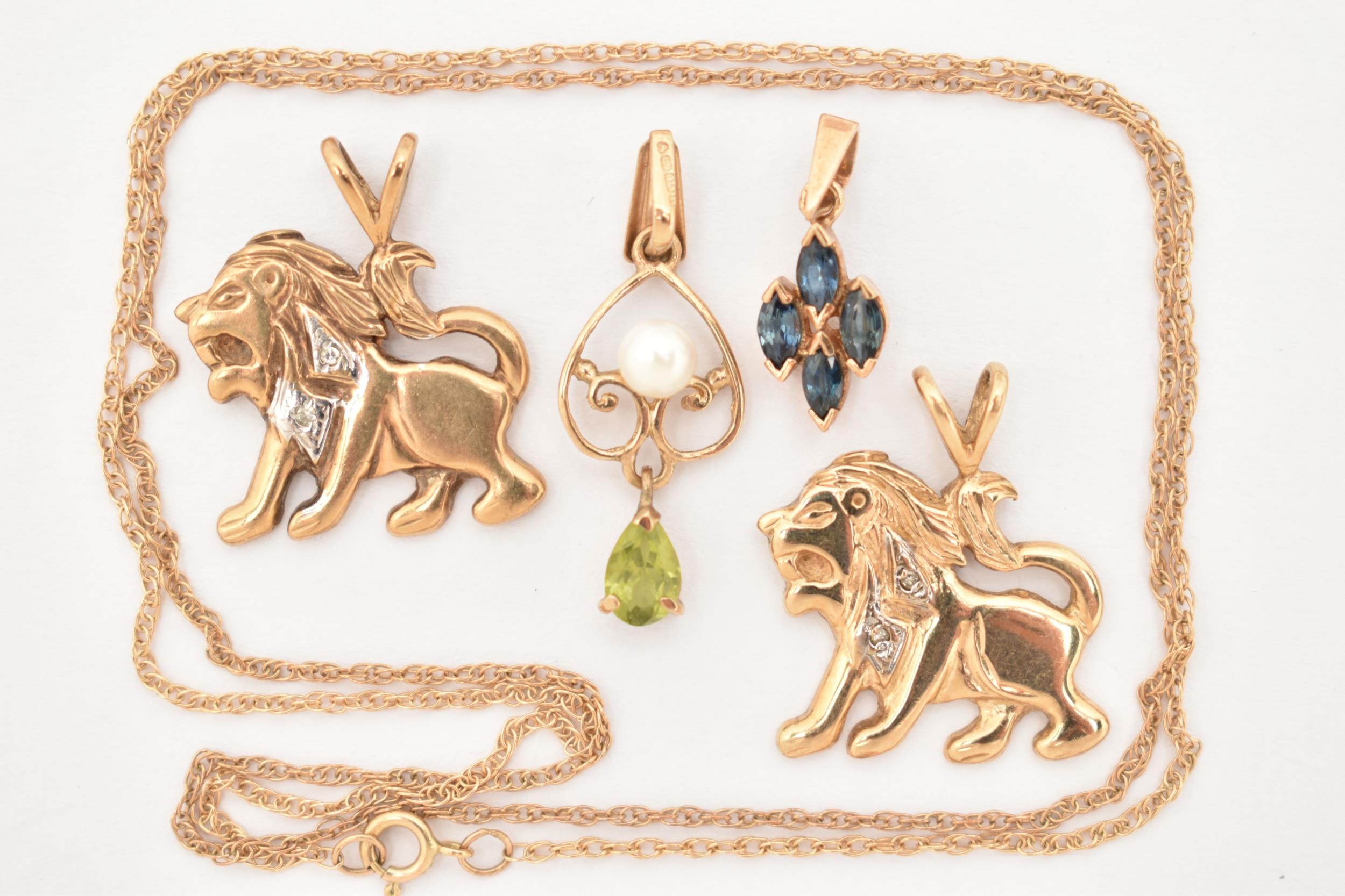 FOUR PENDANTS AND A FINE CHAIN, to include two 9ct gold lion form pendants, both set with single cut diamond accents, fitted with split V bails, each hallmarked 9ct Birmingham, a cultured pearl and peridot open work drop pendant, fitted with a tapered bail, hallmarked 9ct Birmingham, length including bail 25mm, approximate gross weight 5.1 grams, together with a small yellow metal pendant set with four marquise cut blue sapphires, fitted with a tapered bail stamped 375, and a fine yellow metal Prince of Wales chain with spring clasp, stamped 9k, length 460mm, approximate gross weight 1.6 grams