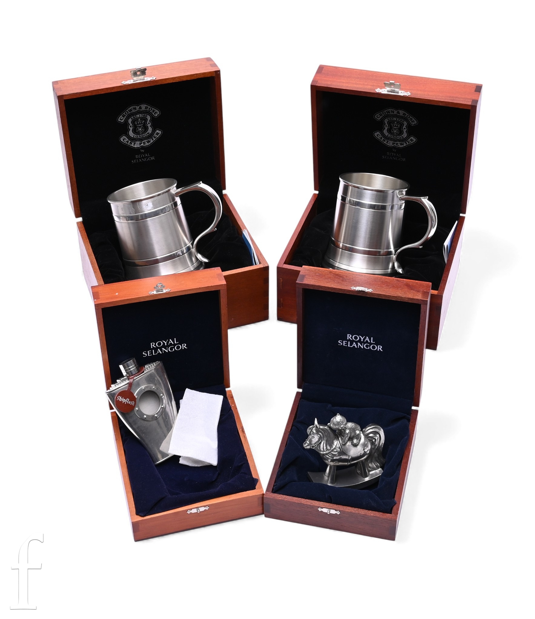 A group of four boxed Royal Selangor items, to include a hip flask, novelty rocking horse and two Crown & Rose pewter tankards, all in wooden boxes. (4)