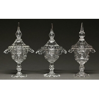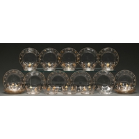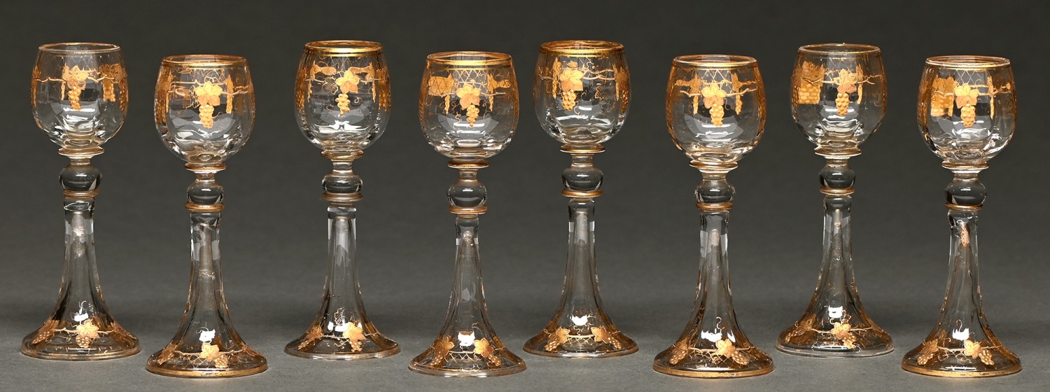 A set of eight raised gilt liqueur glasses, probably Bohemian, early 20th c, the cut bowl and flared foot with grapevines, 11.5cm h