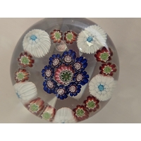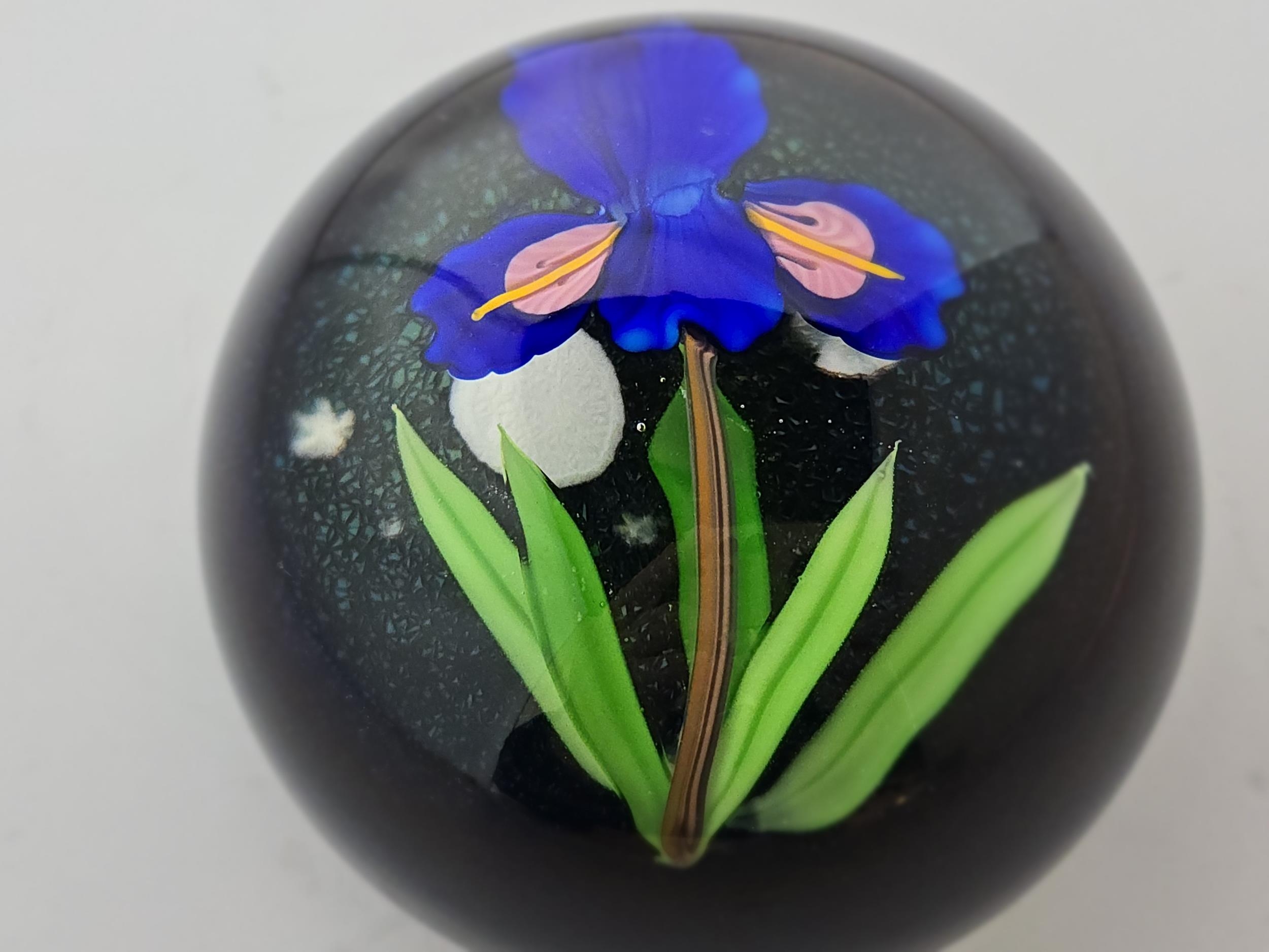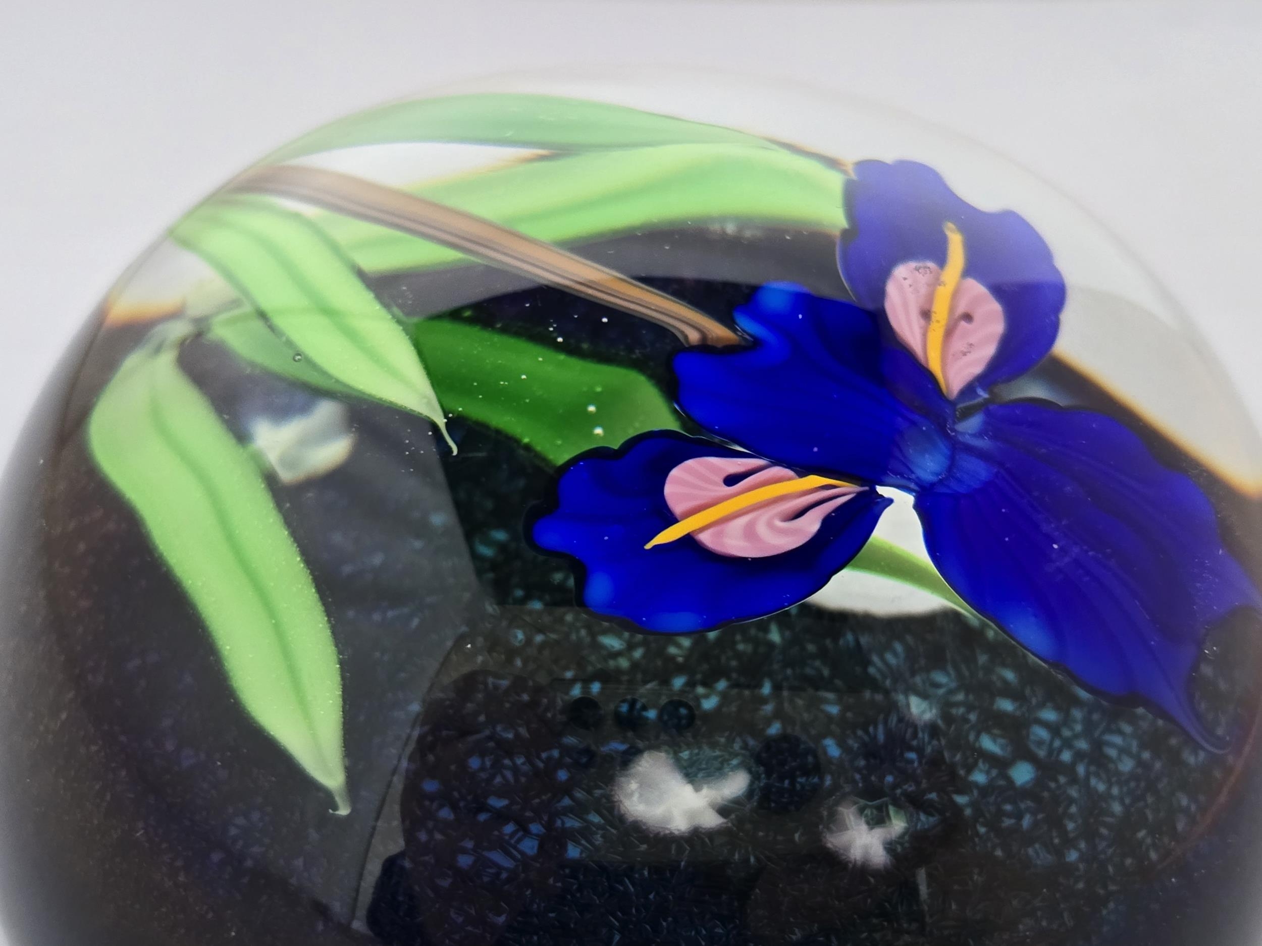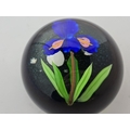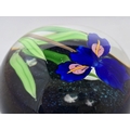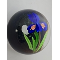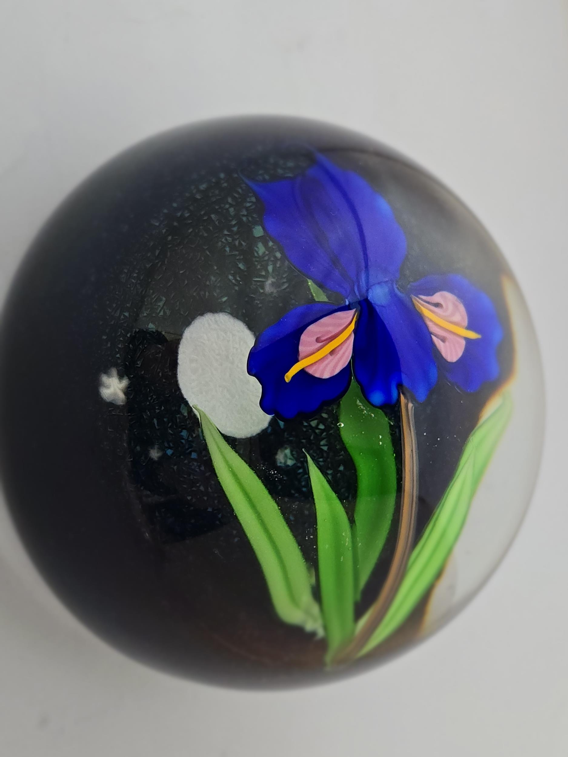 Mayauel Ward paperweight - Large 3D weight from Mayauel featuring an iris of rich blue petals, touched with pink, which floats above an irridescent dark green ground representing the night sky with the moon and stars. 3 layers to this complex weight, made in 2023. Diam: 85mm or 3 5/16th ins
