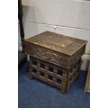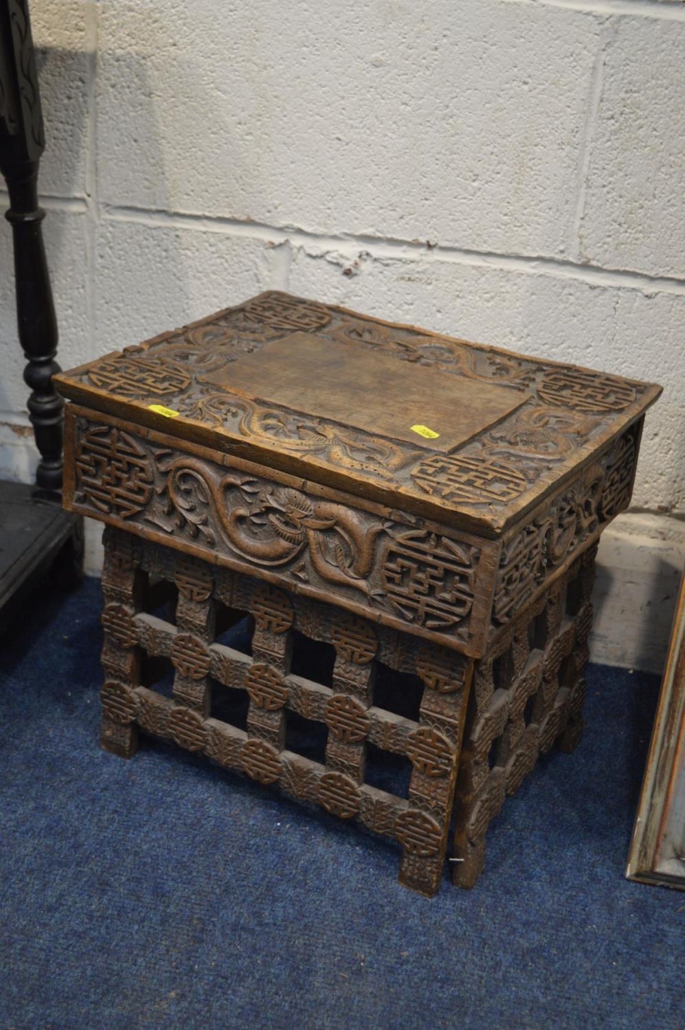 AN EARLY 20TH CENTURY CARVED OAK OCCASIONAL TABLE together with an Oriental folding table (sd) ebonised torchere stand, three mirrors, two walking sticks, etc (10)