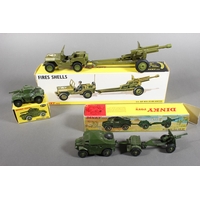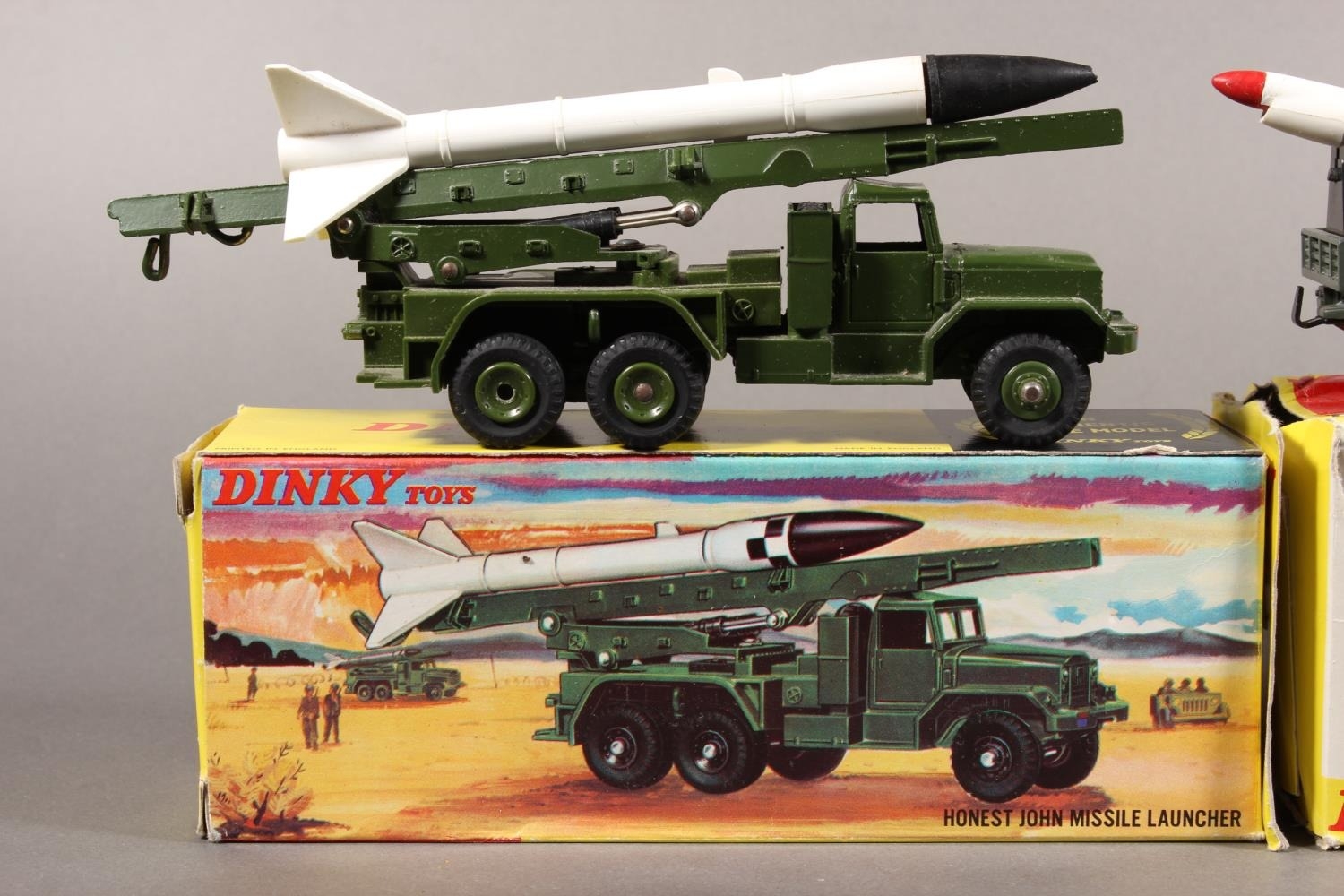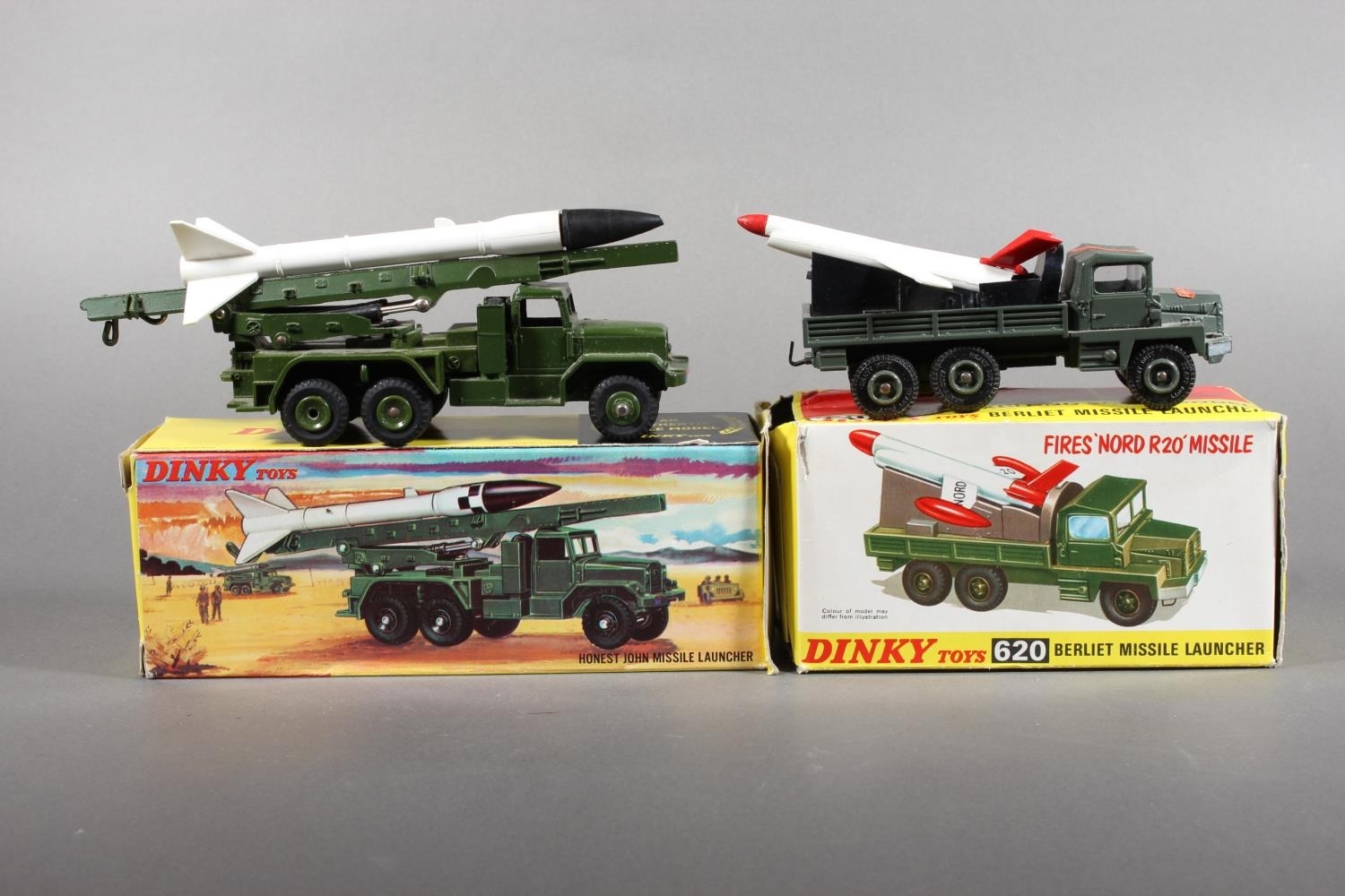 Dinky Toys diecast model vehicle 665 Honest John Missile Launcher and 620 Berliet Missile Launcher with Fires Nord R20 missile, both boxed. (2)