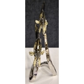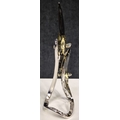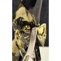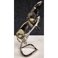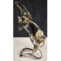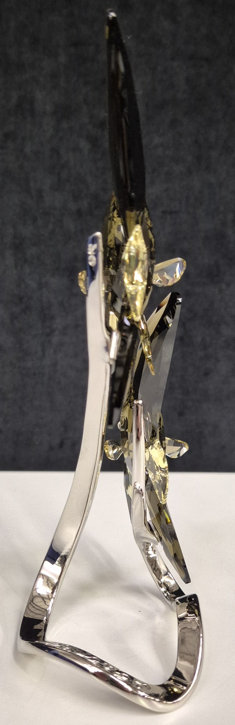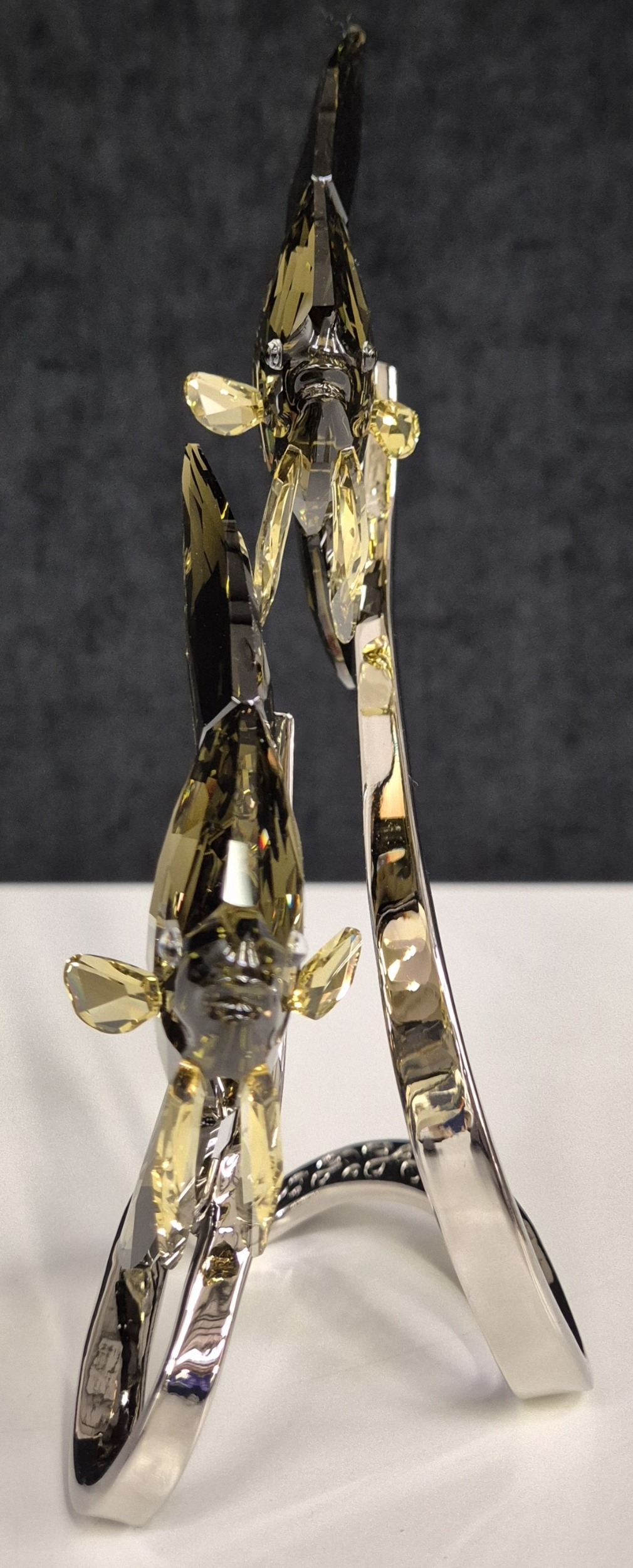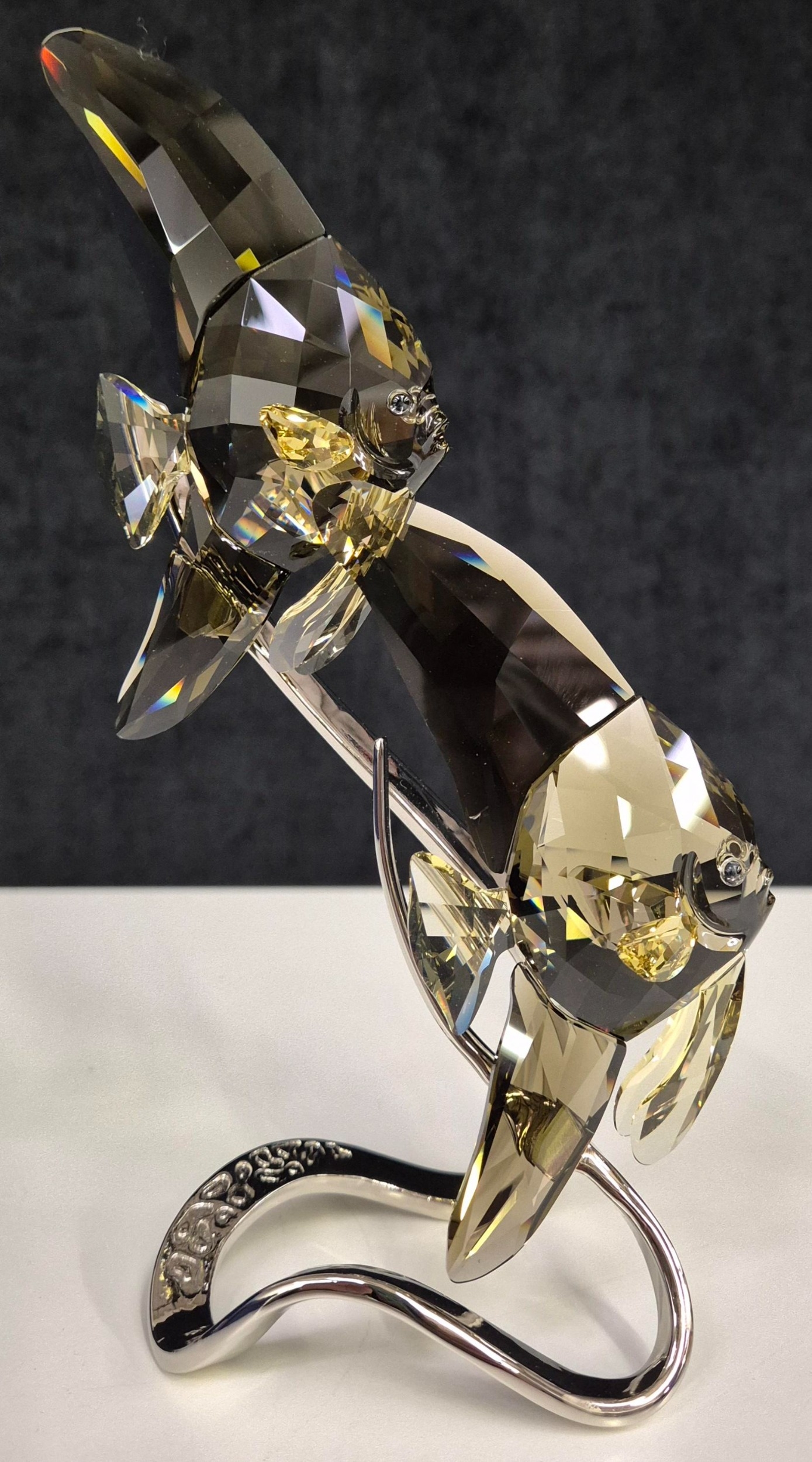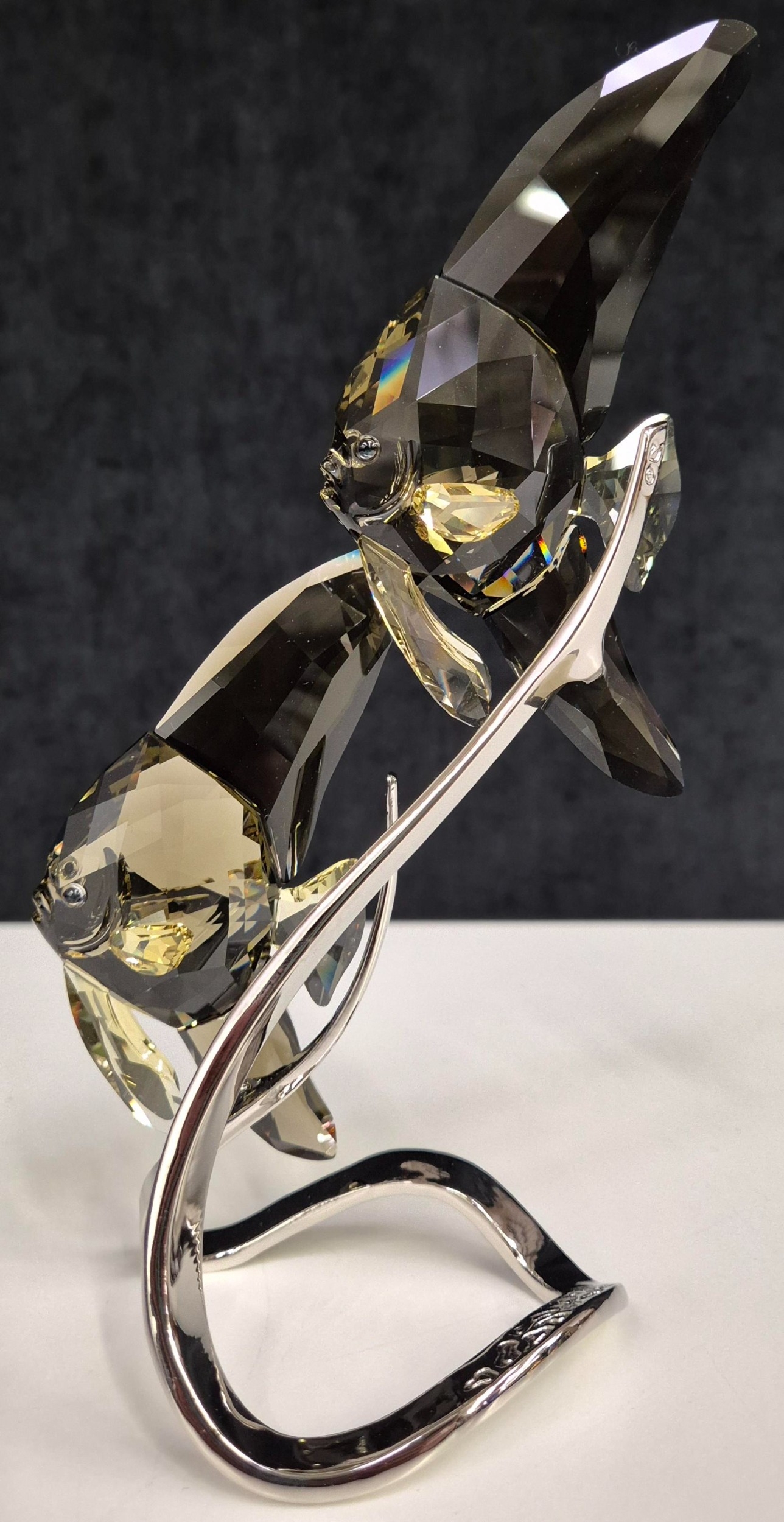 This serene pair of elegant Swarovski Batfish seem to be floating in the air. Their bodies sparkle in faceted Smoky Quartz crystal and their fins shine in Jonquil crystal. They are beautifully presented on a unique silver-tone metal display with an embossed coral motif.