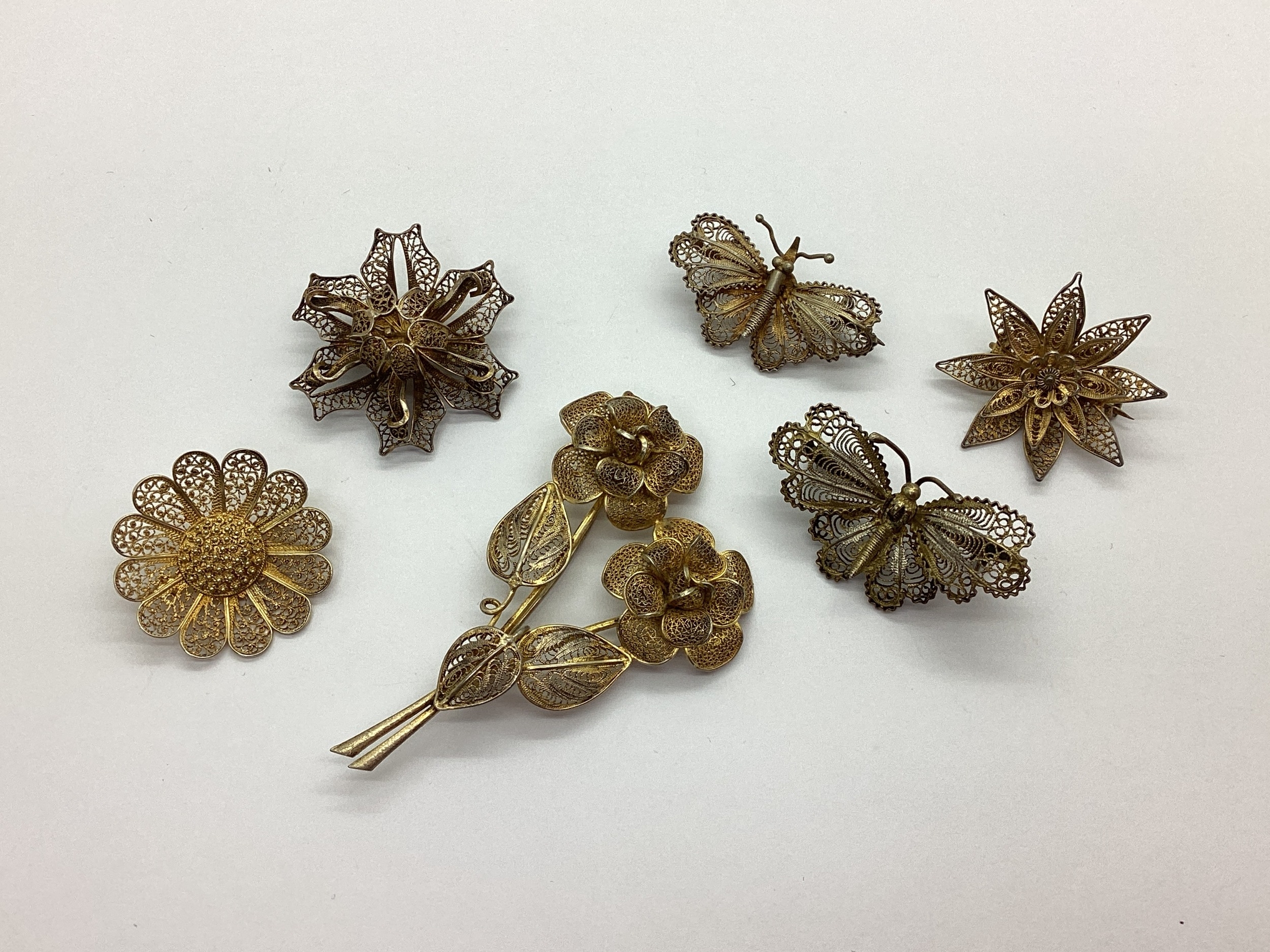 A Collection of Gilt Coloured Filigree Brooches, including butterflies, flowerheads, etc. (6)