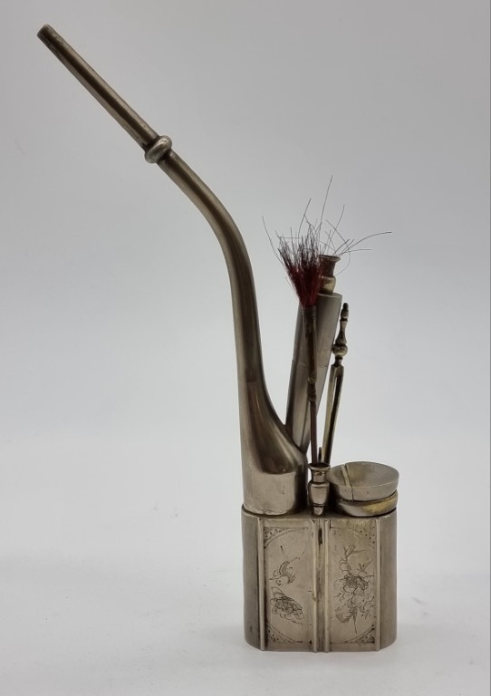 A Chinese nickel plated opium pipe, 25.5cm high....