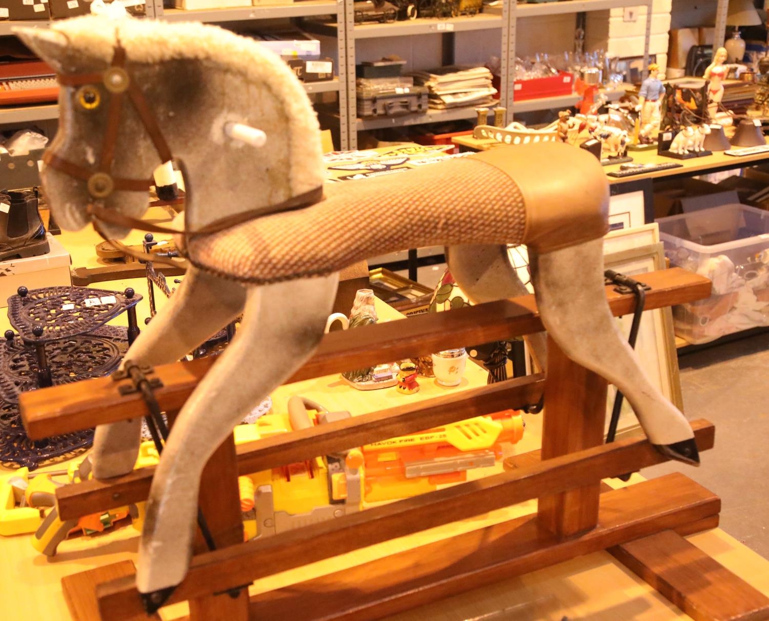 Child's rocking horse on wooden stand. Not available for in-house P&P.
