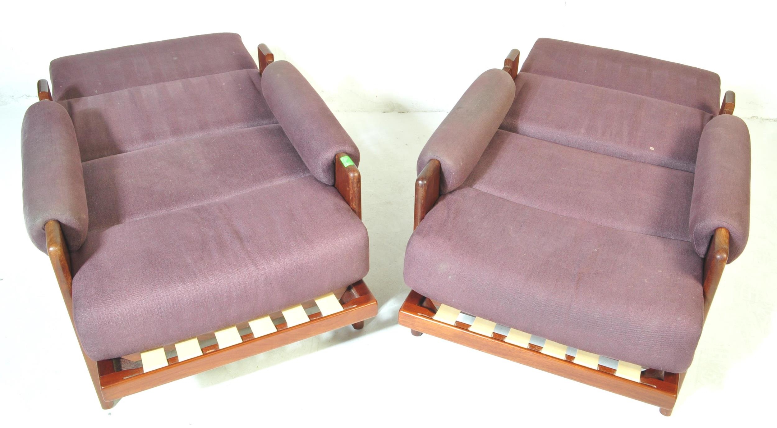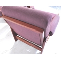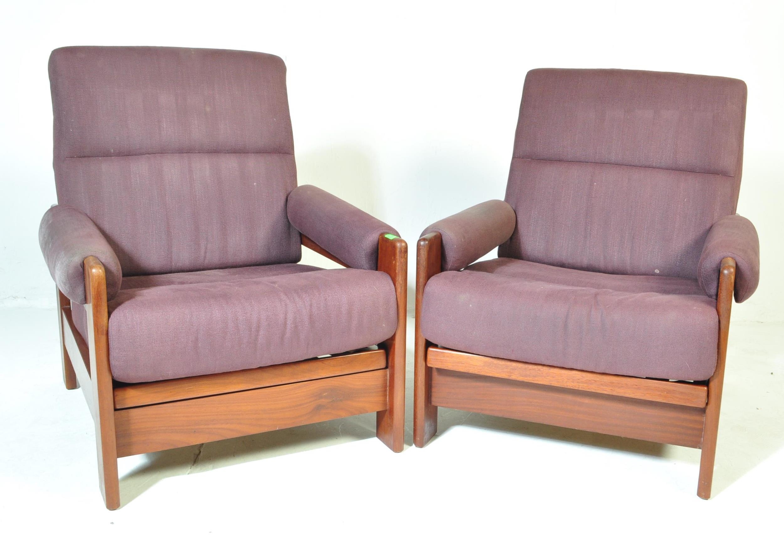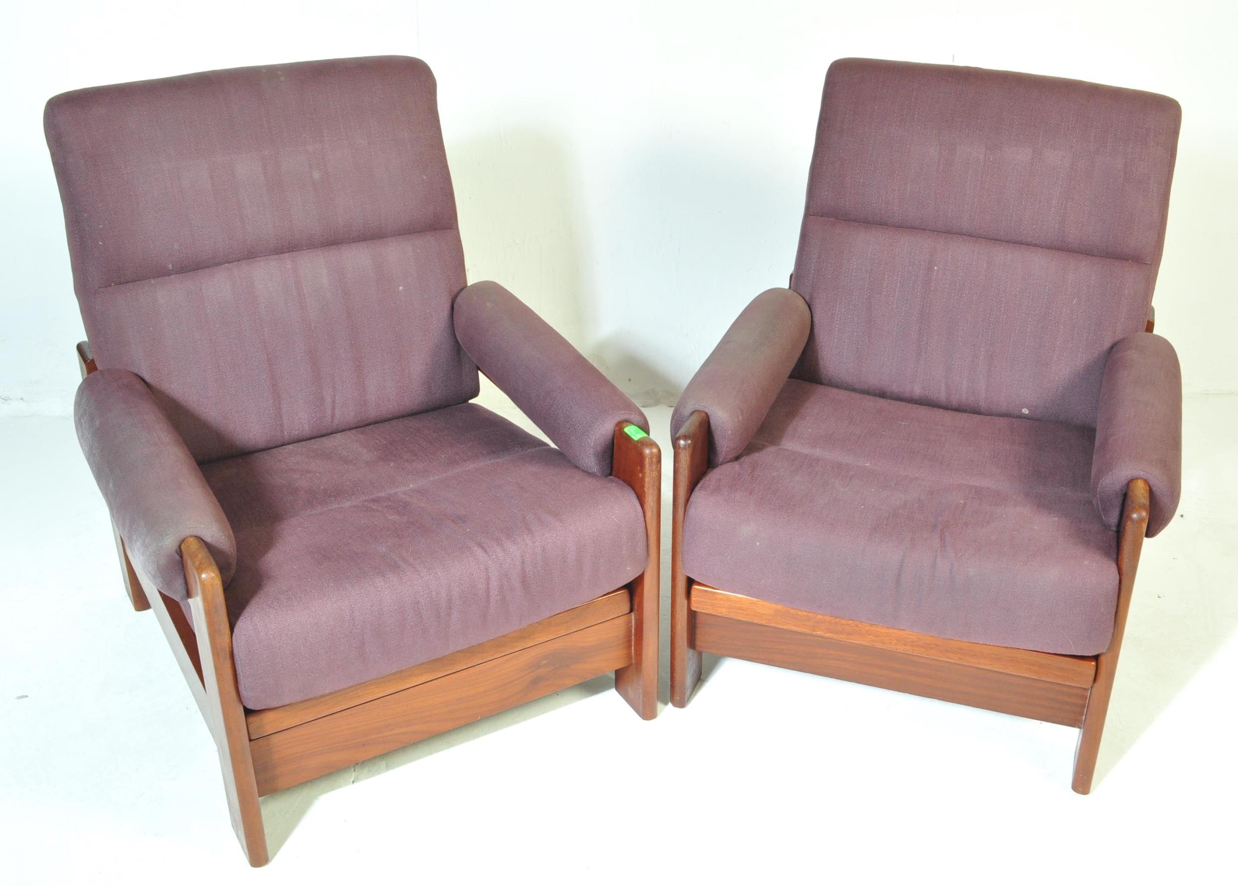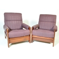 A pair of retro vintage 20th century circa 1970s oak framed armchairs day beds, with adjustable seat and back, two loose purple cushions, with padded elbow rests. Measures approx; 91cm x 77cm x 89cm.