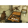A group of gentleman's buttons with spring backs, including bull's eye agate, chalcedony, opalescent glass, ceramic, onyx, and rolled gold, with vintage leather button case, a glass trinket box, a silver plated figure of a gundog, and a spring paper clip modelled in the form of a flaming torch.