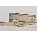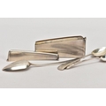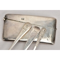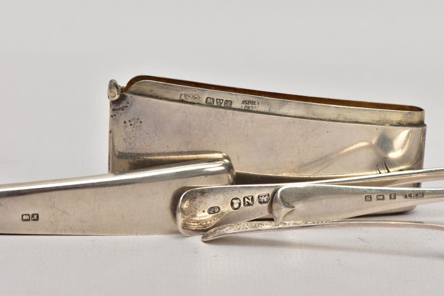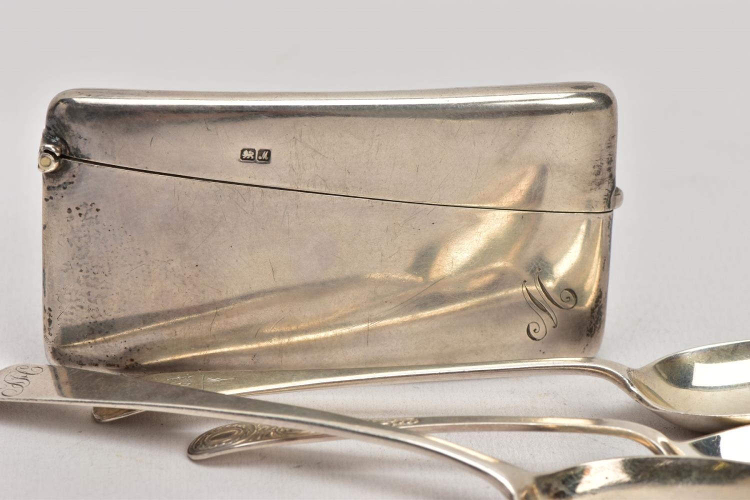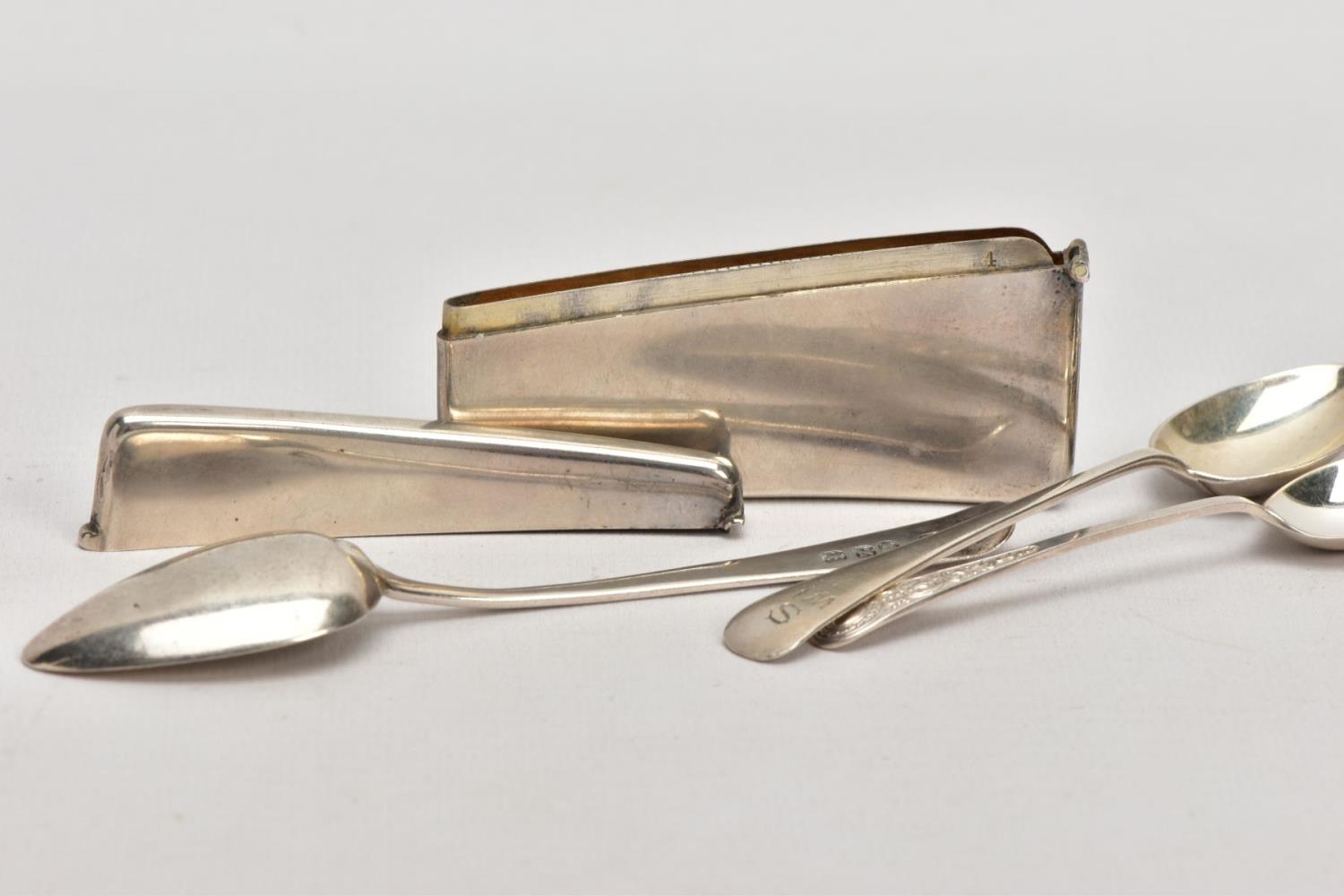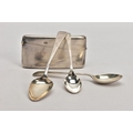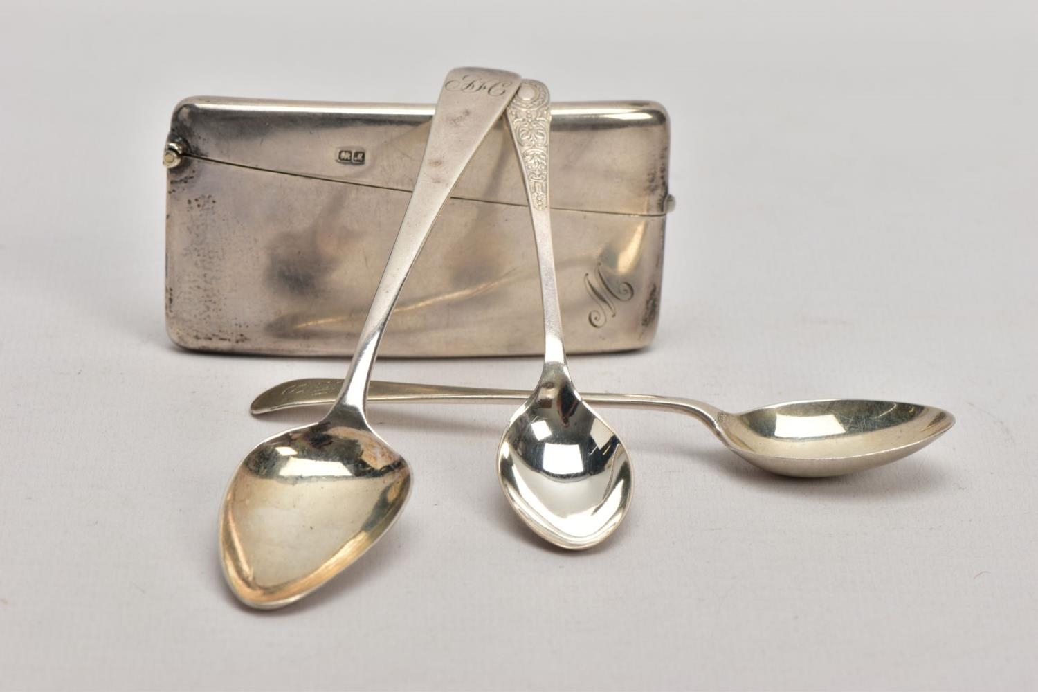FOUR ITEMS OF SILVER, to include a rectangular card case with gilt interior and engraved initial monogram to one corner, hinge broken, together with a silver George III teaspoon, hallmark for London 1808, and two further silver teaspoons, hallmarks for Birmingham 1937 and Sheffield 1902, lengths 81mm to 127mm, approximate total gross weight 74.5 grams