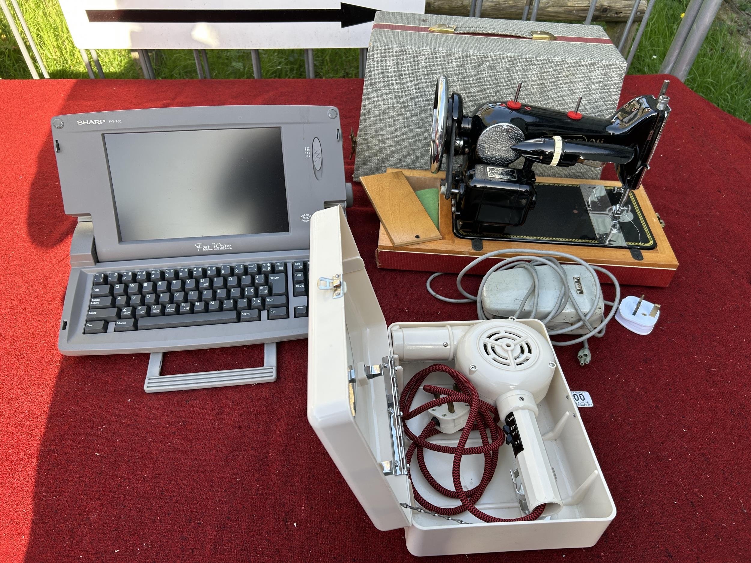 Harris 9H Electric sewing machine with lead, Bakelite Hair Dryer and Sharp FW-760 Font Writer with lead