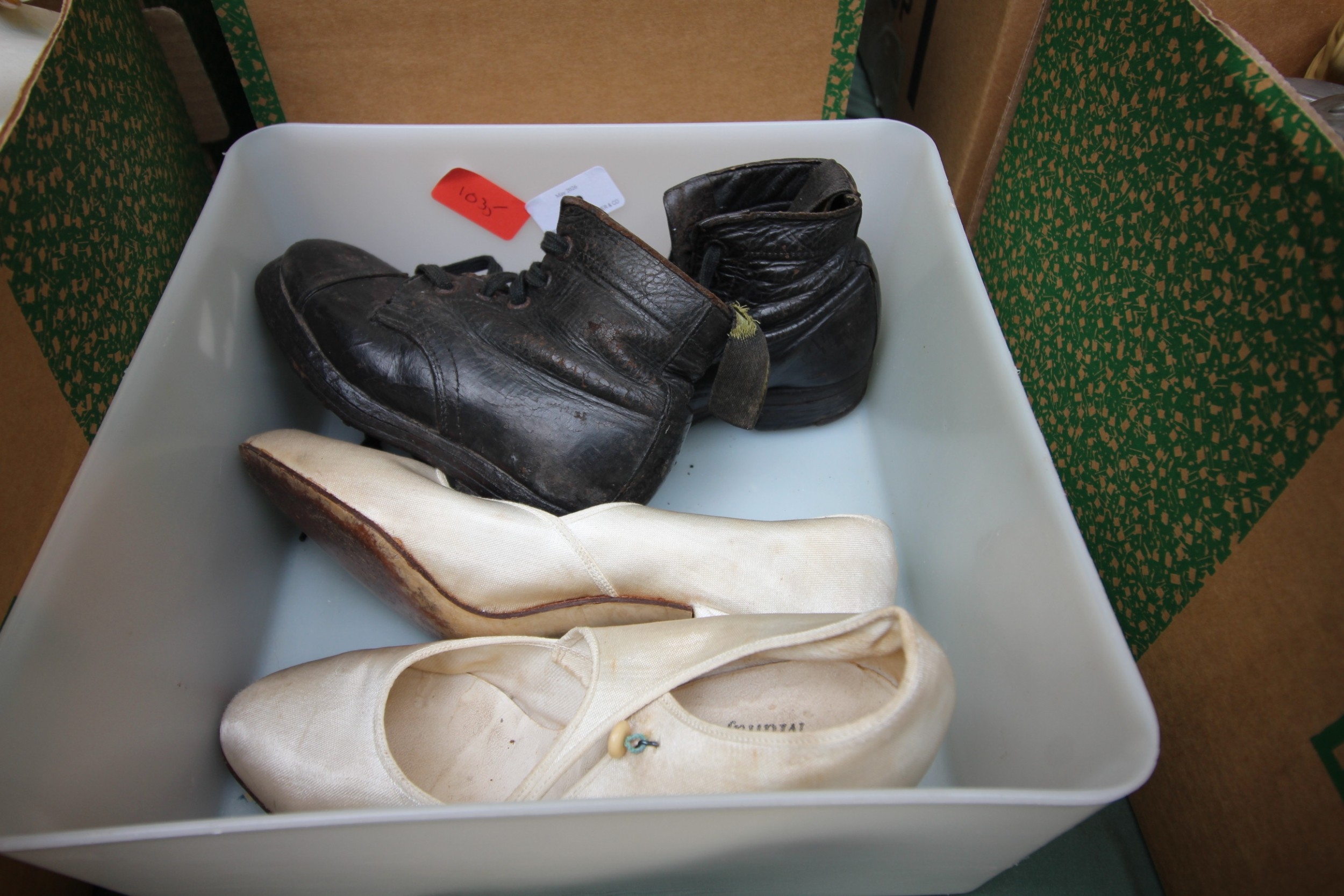 Vintage pair of children's leather hob nail boots together with a pair of vintage ladies shoes
