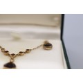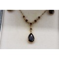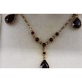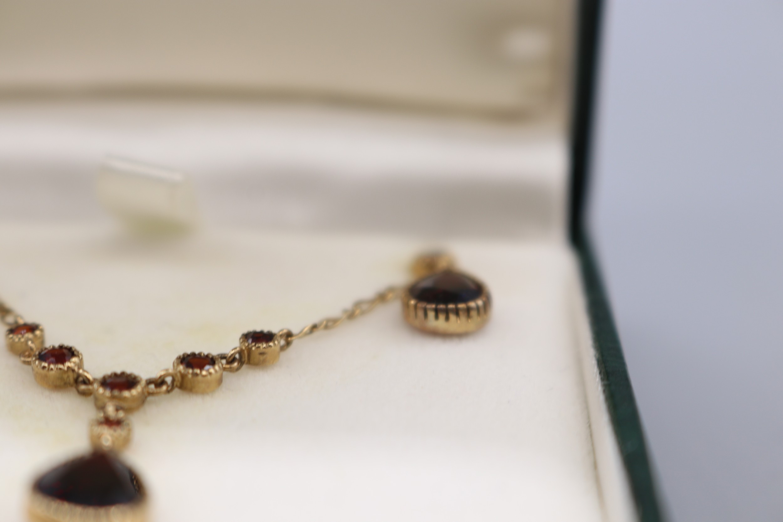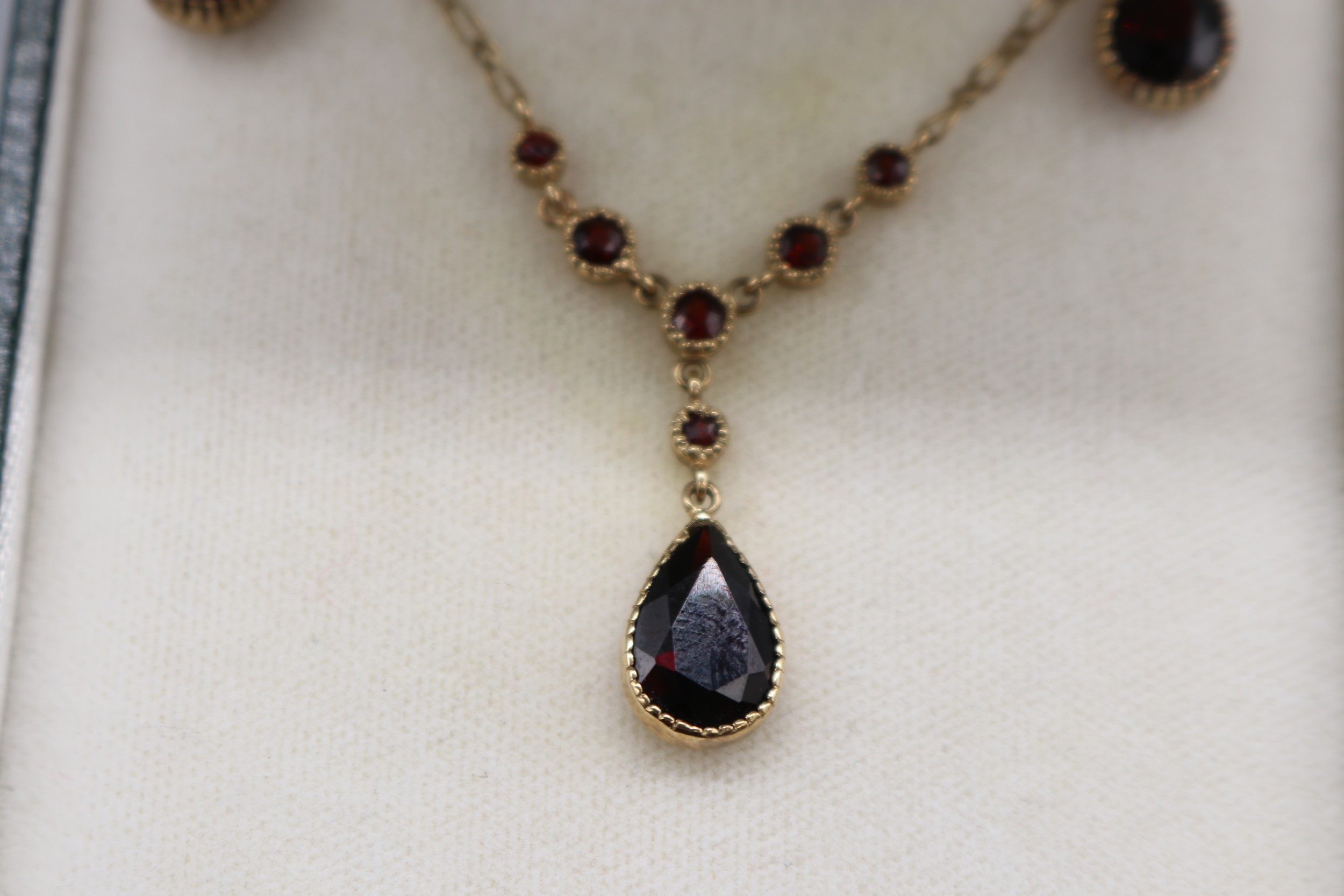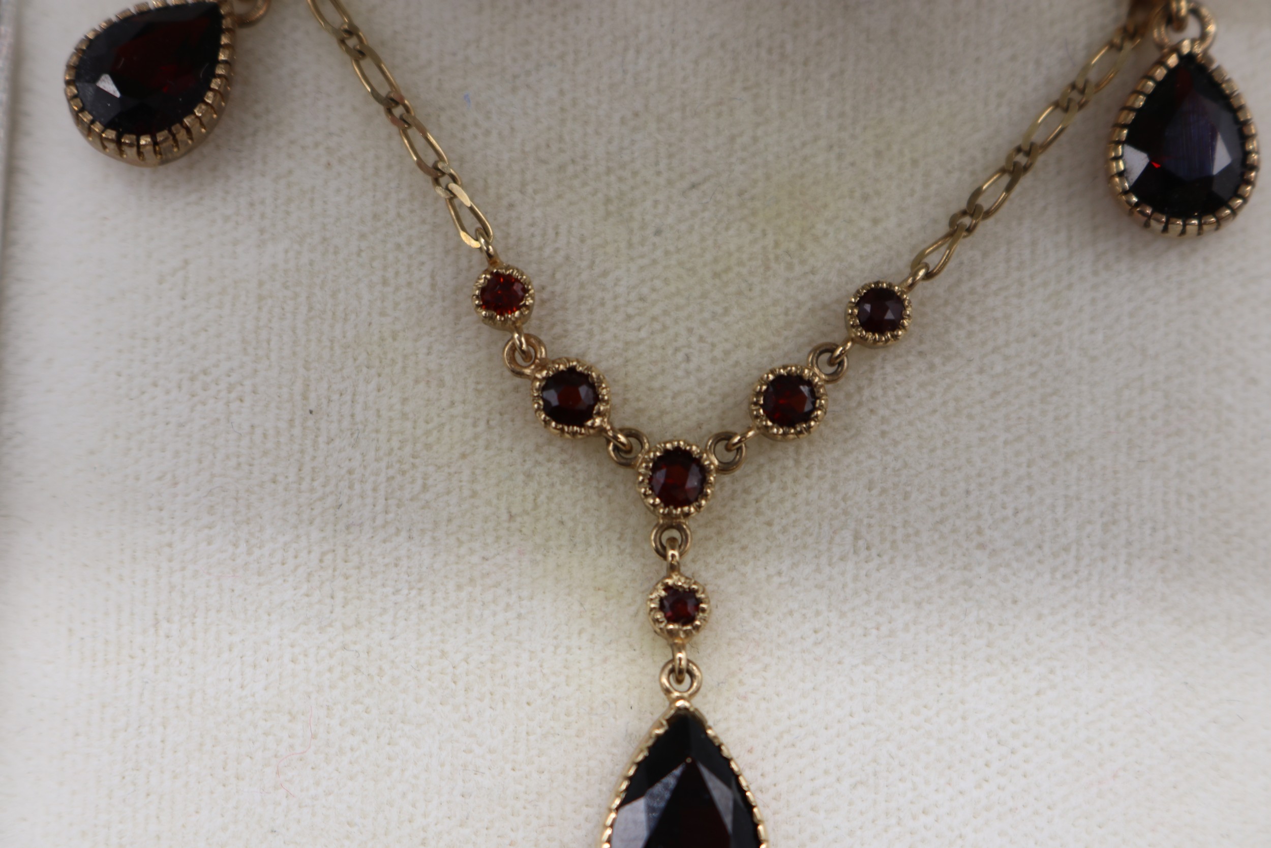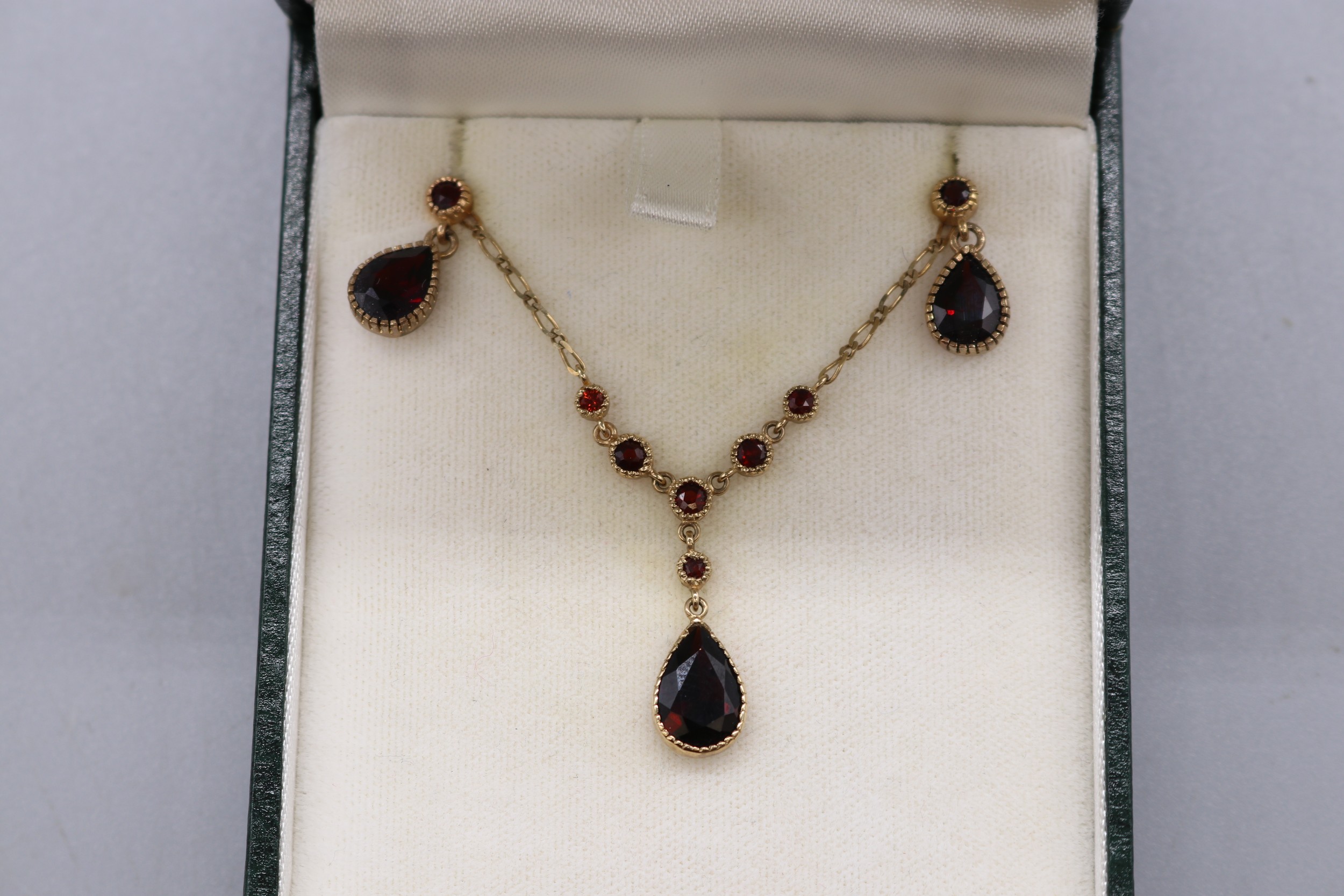 Stamped 9ct yellow gold garnet pendant and earrings set, comprising a hallmarked 9ct seven-stone garnet millgrain bezel-set lariat style necklet, length 16", weight 2.93g; and a matching pair of stamped 9ct two-stone drop earrings, each set with a round faceted garnet stud and a larger faceted pear-cut garnet drop weight 1.72g