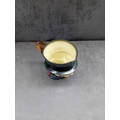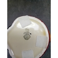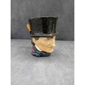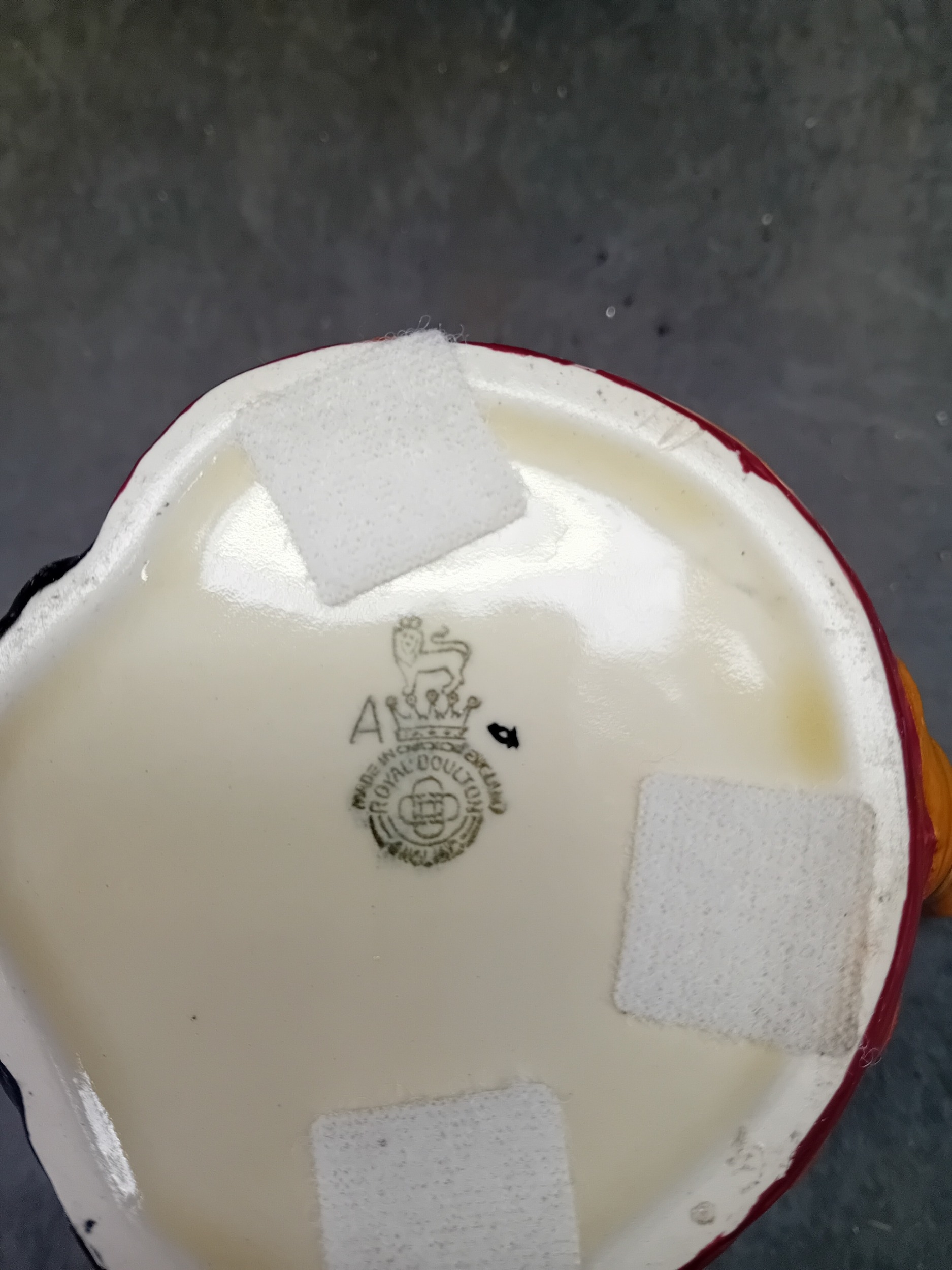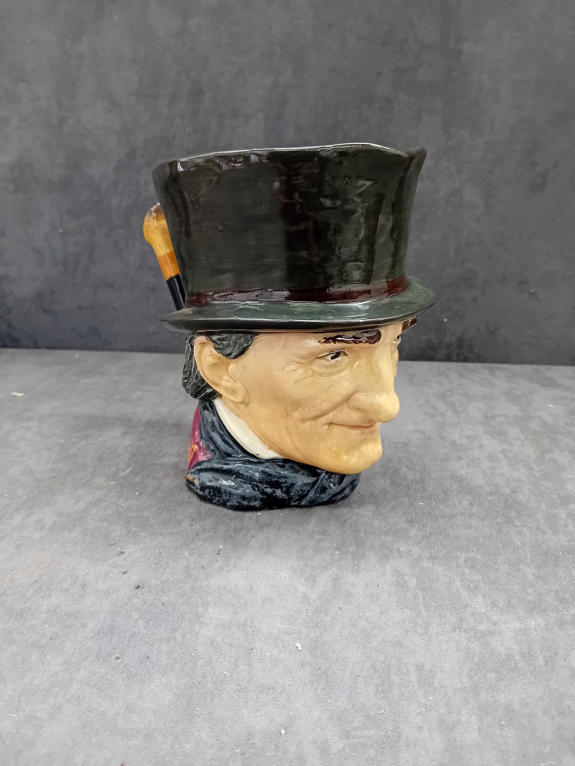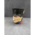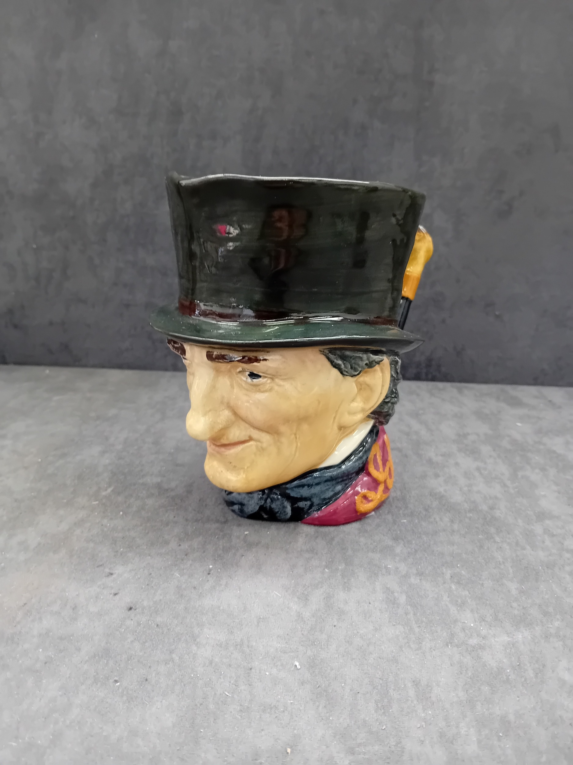 A Royal Doulton 'John Peel' character jug, crafted from polychrome glazed ceramic. The jug depicts a smiling gentleman wearing a dark green top hat, a dark jacket, a red waistcoat, and a cravat. A brown cane forms the handle. The interior is glazed in a pale yellow. The underside features a clear Royal Doulton backstamp, comprising a crown over a lion, stating "MADE IN ENGLAND ROYAL DOULTON ENGLAND, " along with an "A" mark and a partially obscured D-series model number, "D6XXX". Four white felt pads are adhered to the base.