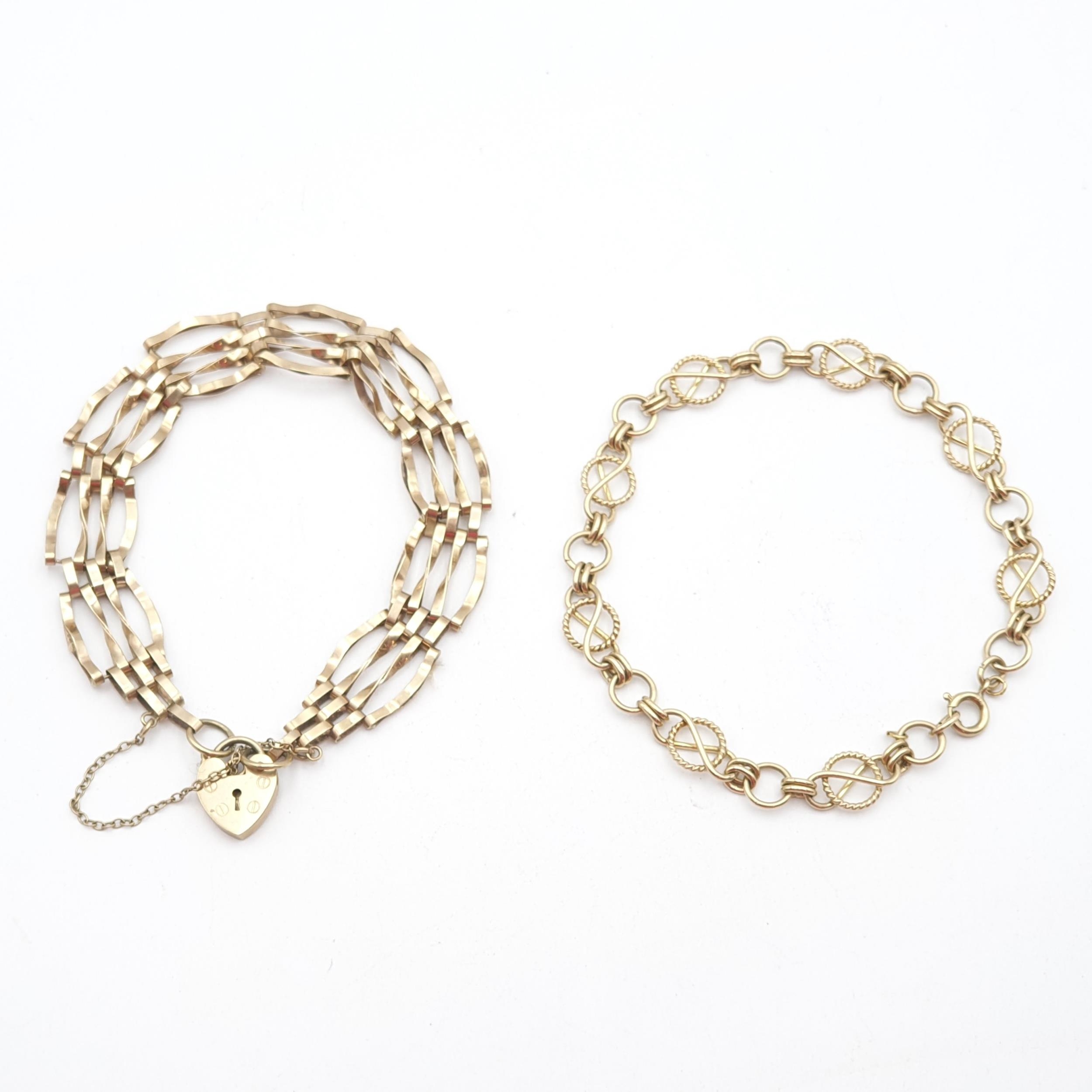 A 9ct gold Gate-link Bracelet with heart padlock clasp and a 9ct gold Fancy-link Bracelet, total weight approx 13.8gms