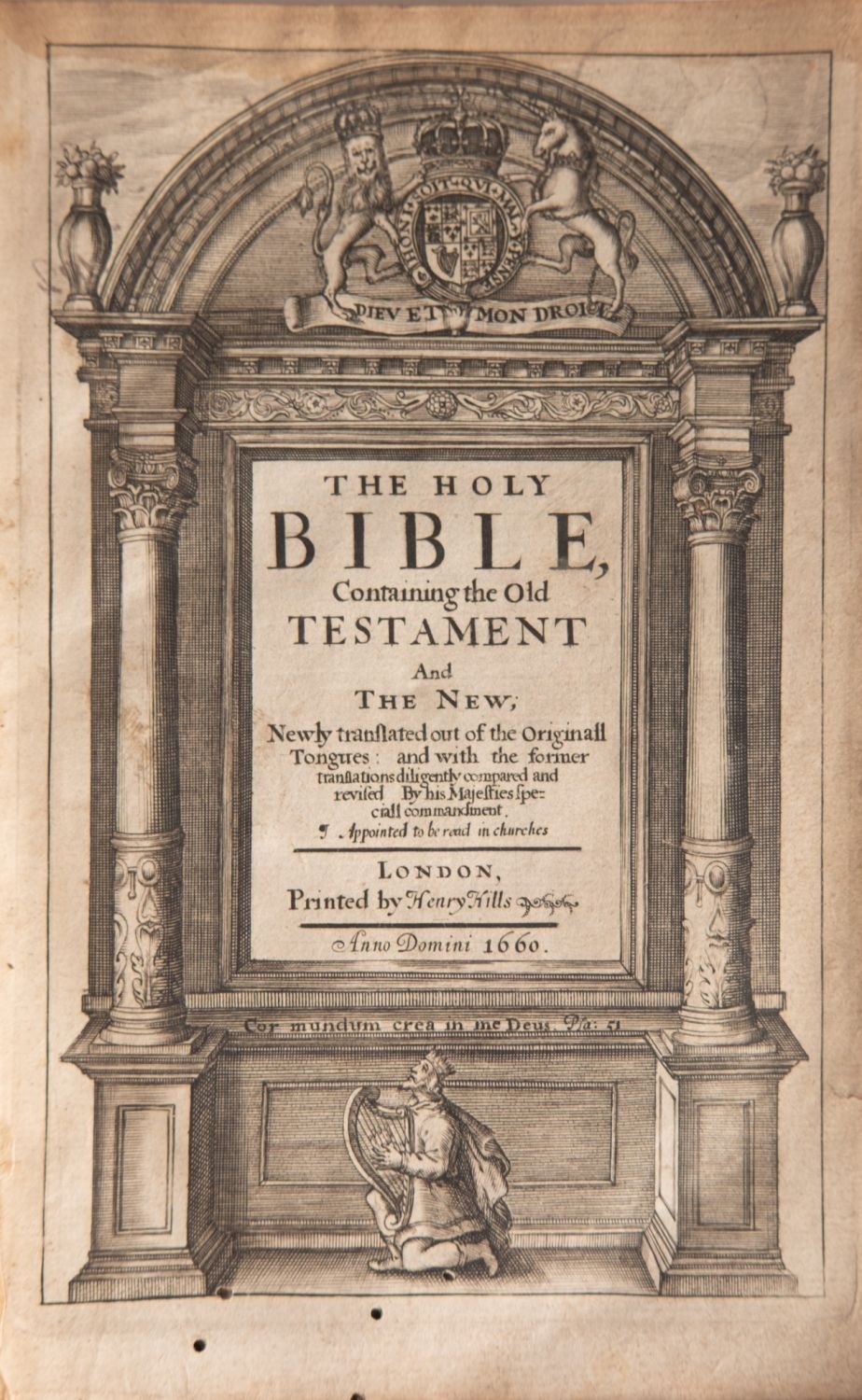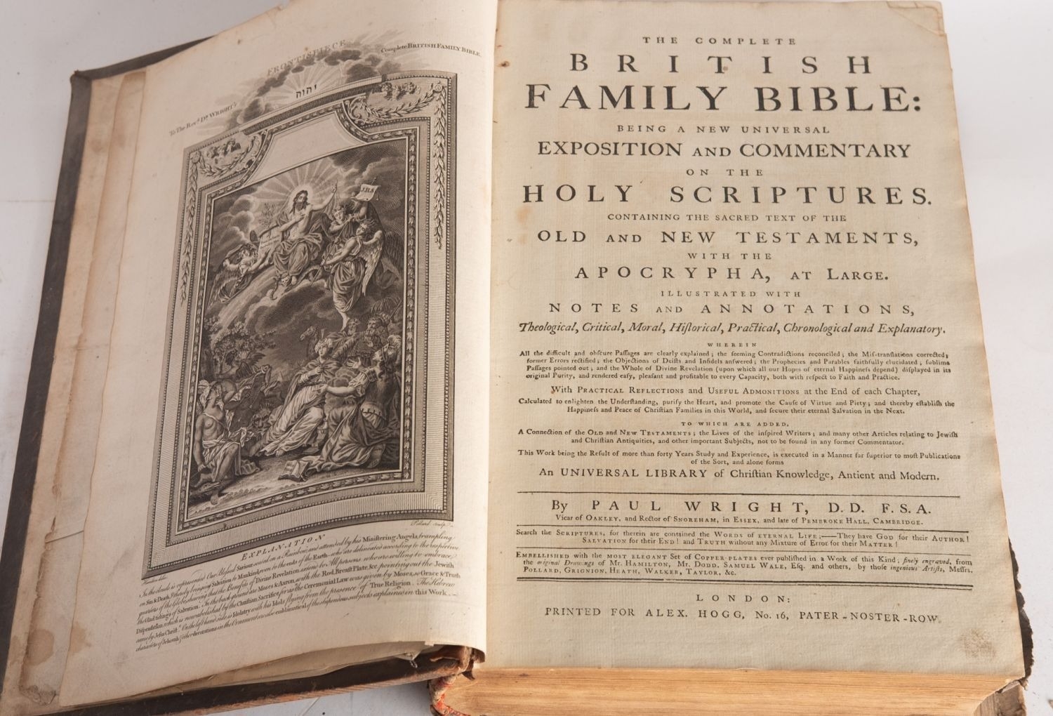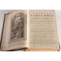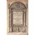 BIBLE, ENGLISH. The Holy Bible Containing the Old Testament and The New..., London: Printed by Henry Hills, 1660, engr. general title, New Testament title, bound with A Brief Concordance..., London: Printed by W. Du-Gard for N. Bourn, 1652, title, ink ownership inscription to ffep, ink annotations to blank after New Testament, worm-tracks, contemp. calf distressed, 8vo; together with... BIBLE, ENGLISH. WRIGHT, Paul (ed.). The Complete British Family Bible: Being a new universal Exposition and Commentary on the Holy Scriptures..., London: Printed for Alex. Hogg, nd, engr. frontis., plates, significant worm damage to numerous leaves at rear, contemp. calf scuffed, folio.