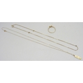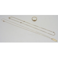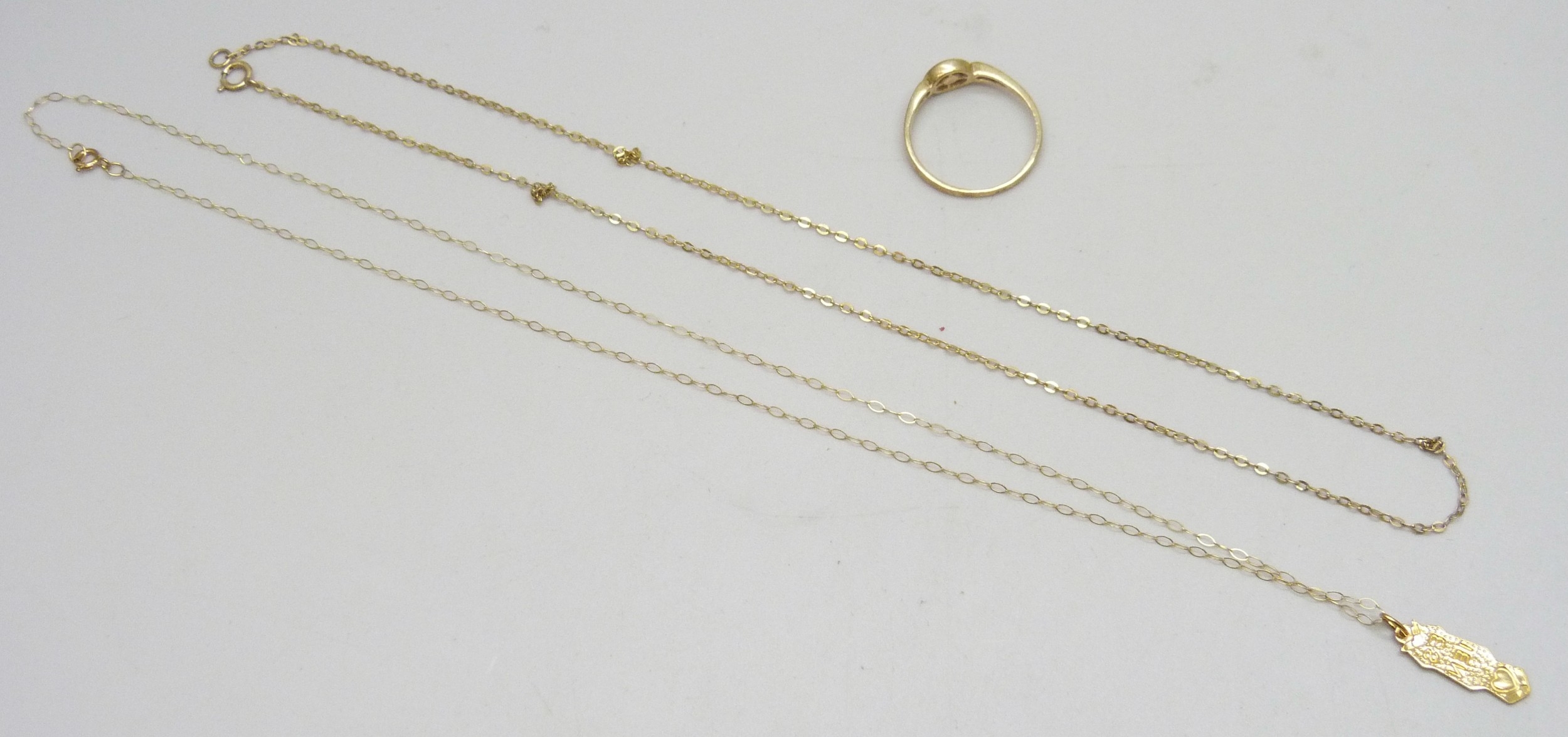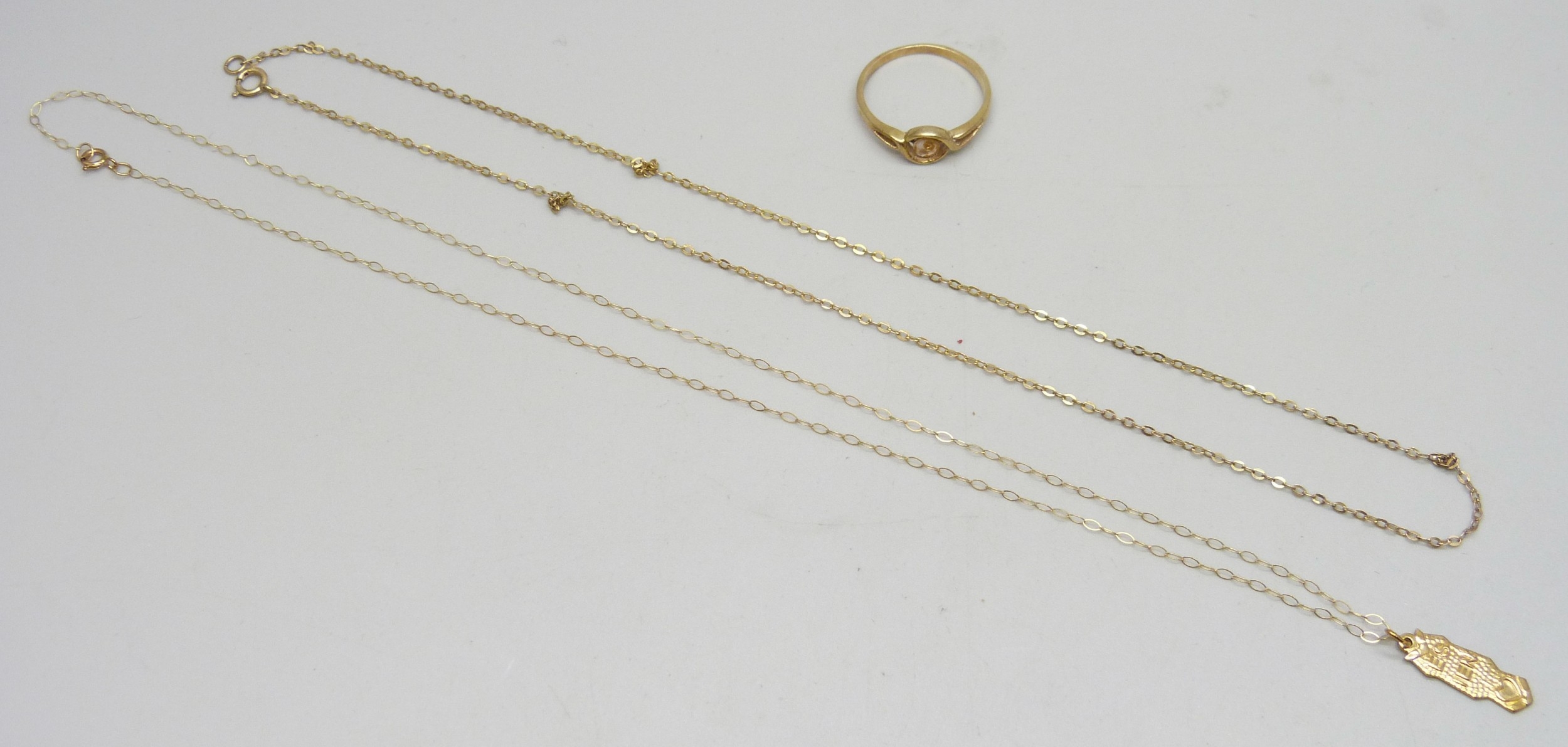 Two 9ct gold necklace chains, one with an unmarked pendant, and a 9ct gold ring, a/f, 2.9g total