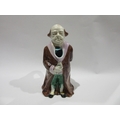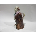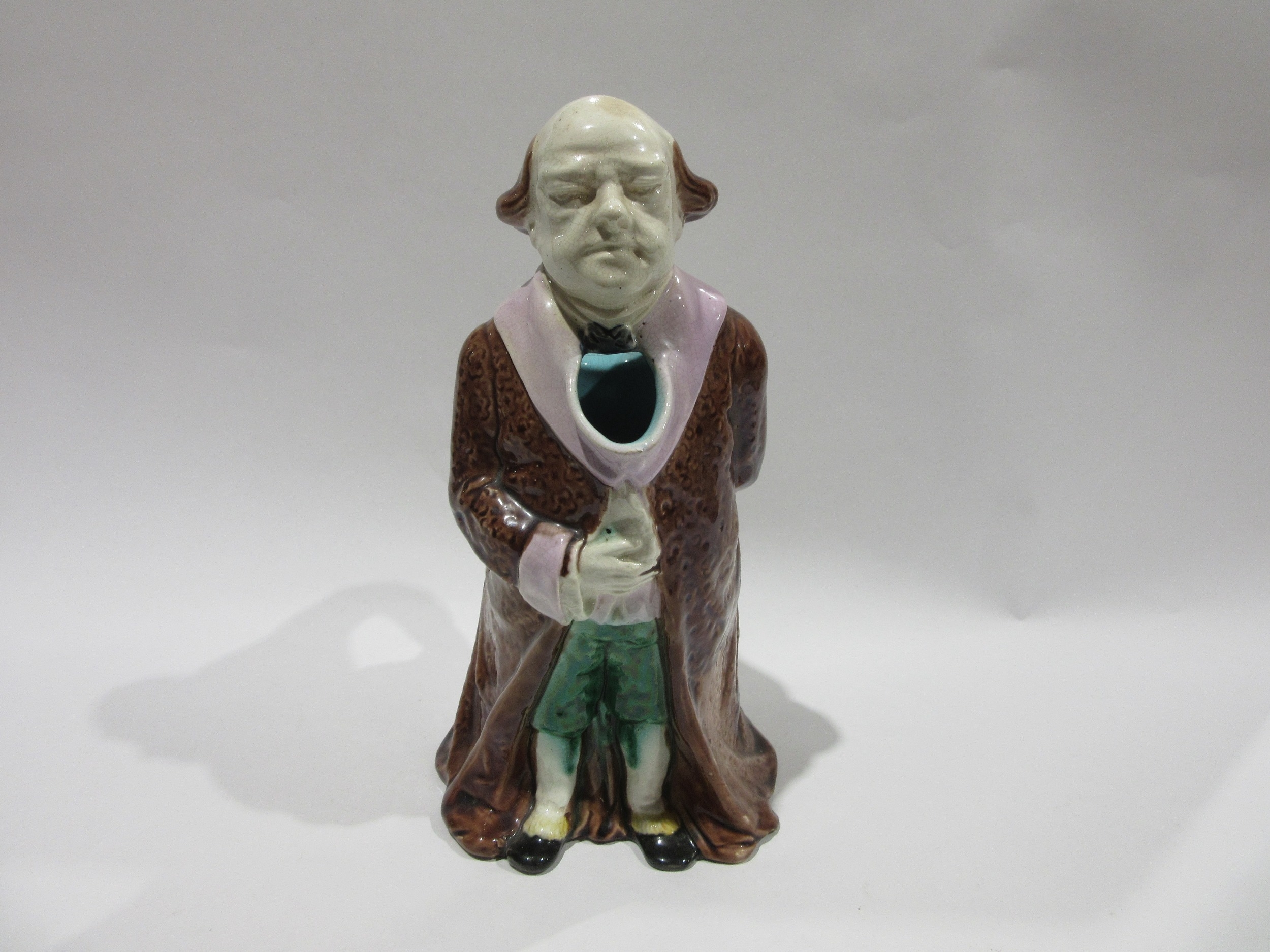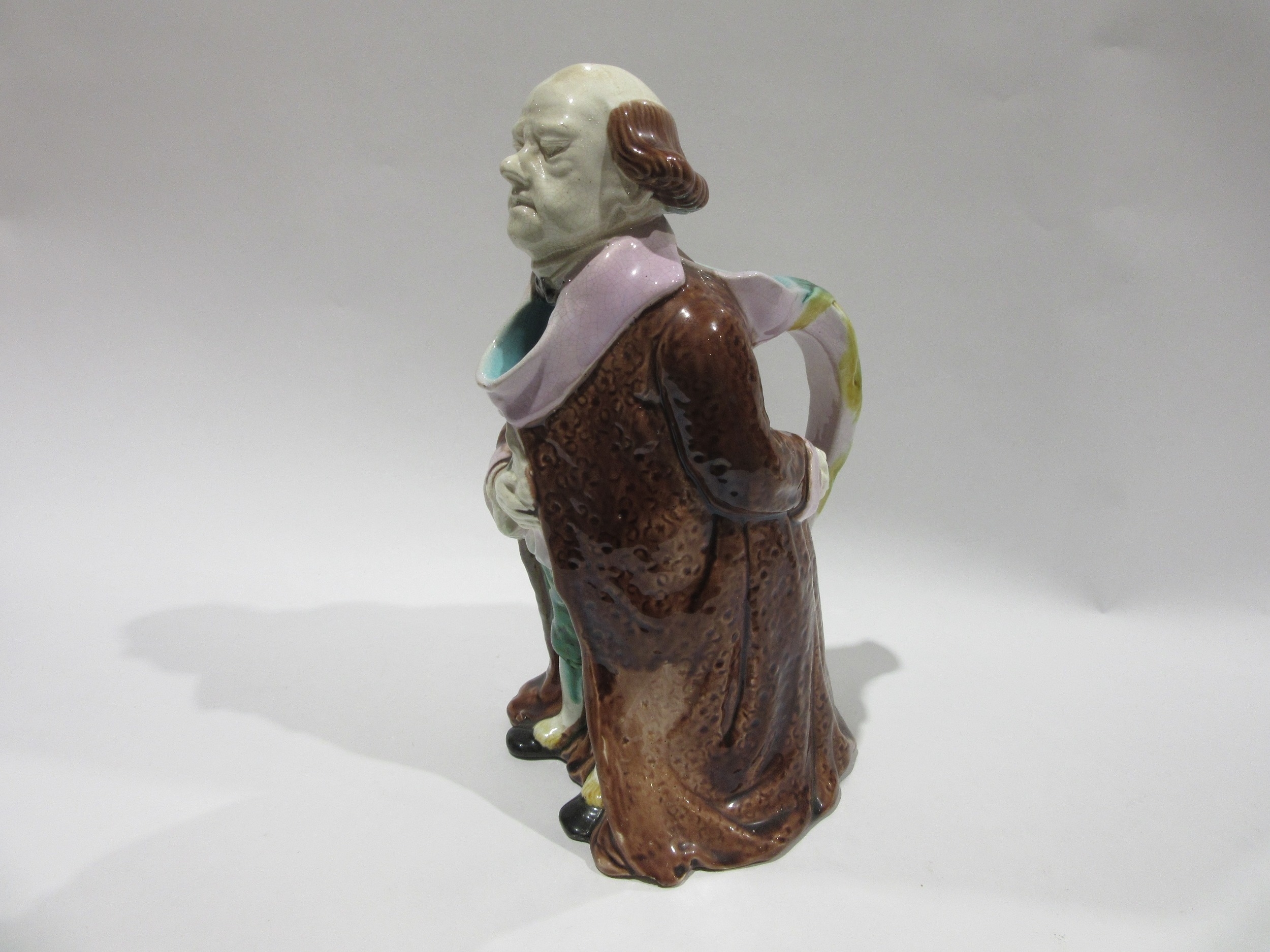 A 19th Century continental Majolica character jug, modelled as a standing gentleman attired in a long brown coat, green breeches and blue hose, he holds a book in his right hand, his left behind his back holding a scroll. Unsigned, 27.5cm tall.