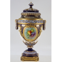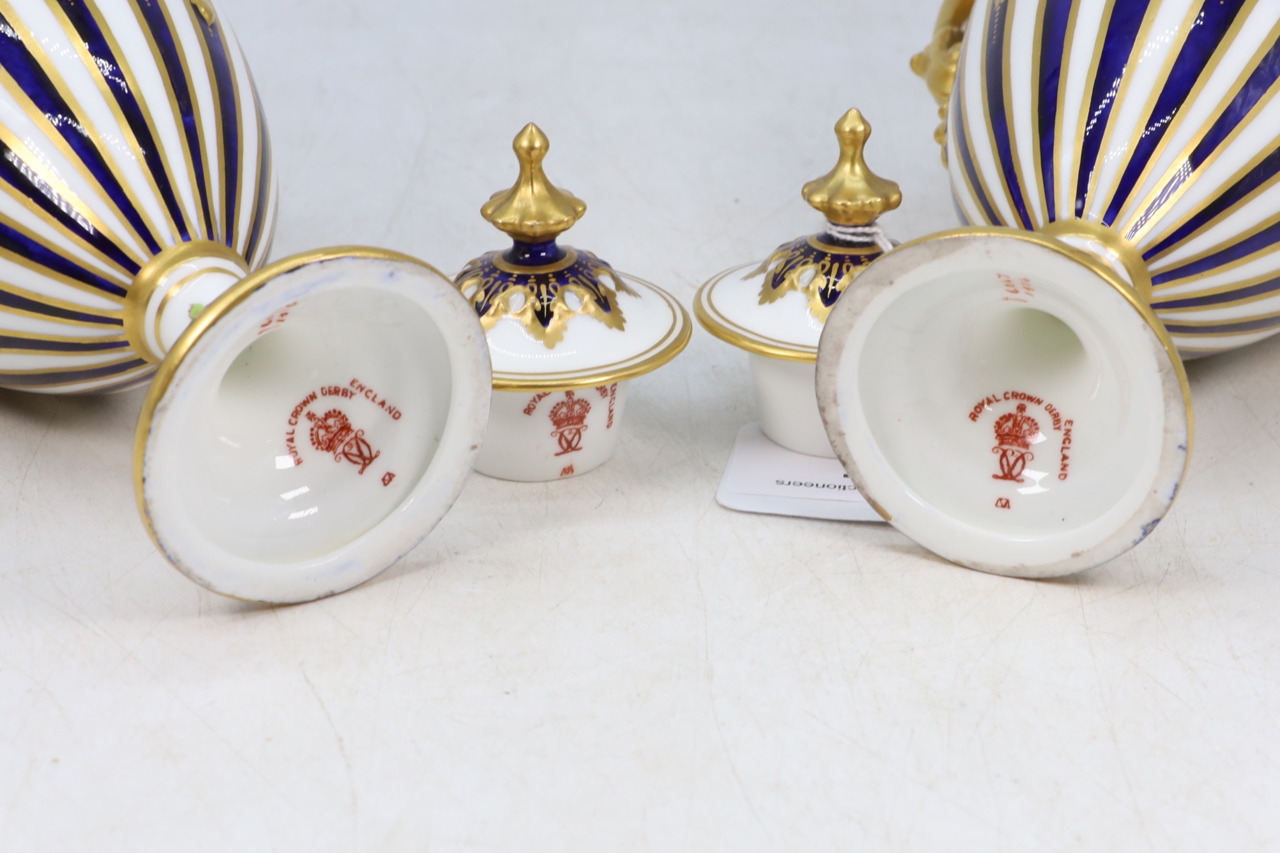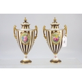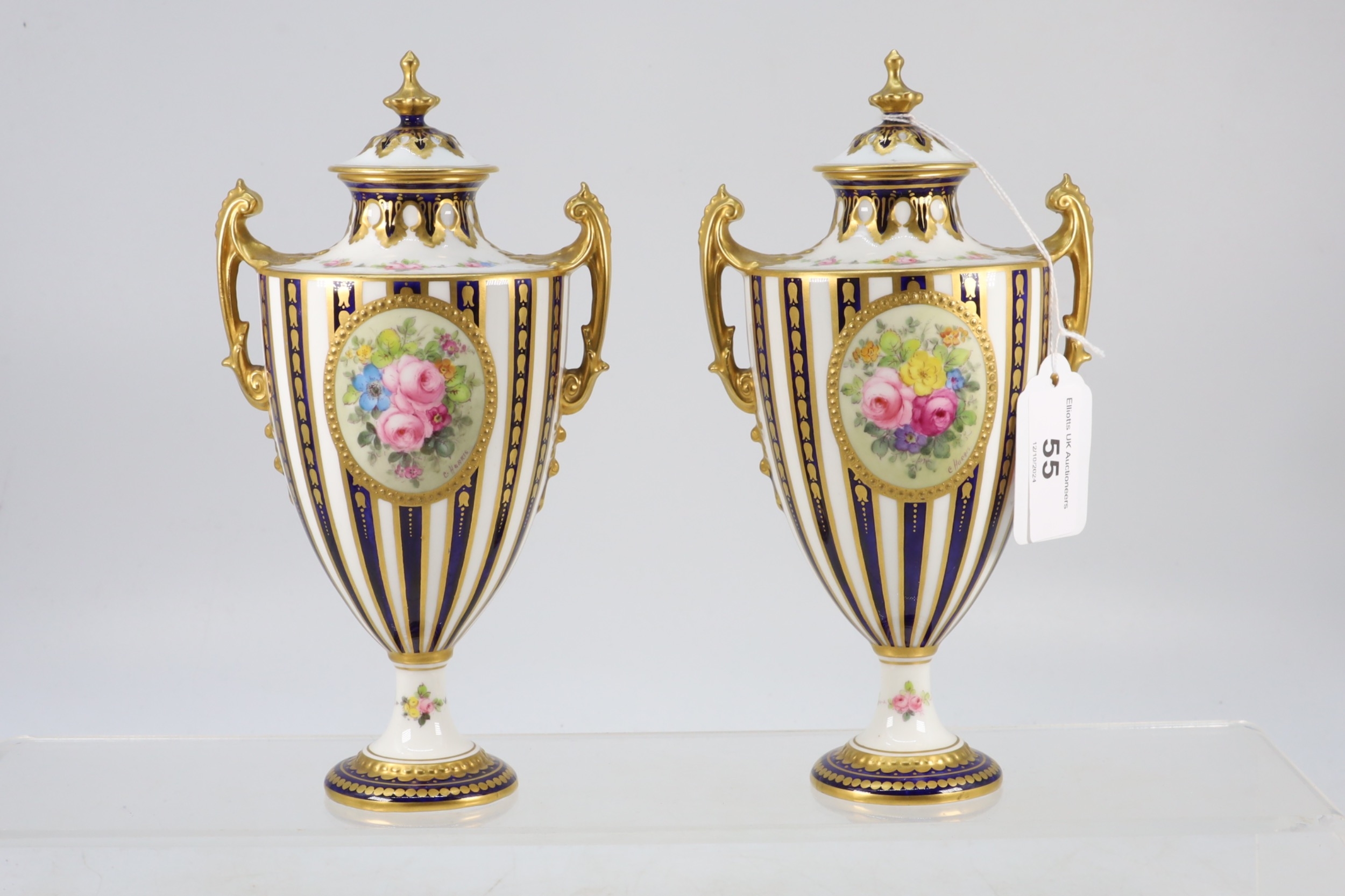 A pair of Royal Crown Derby twin handled vases with covers central lozenges with hand painted floral sprays signed C. Harris (approx. 19cm tall each)