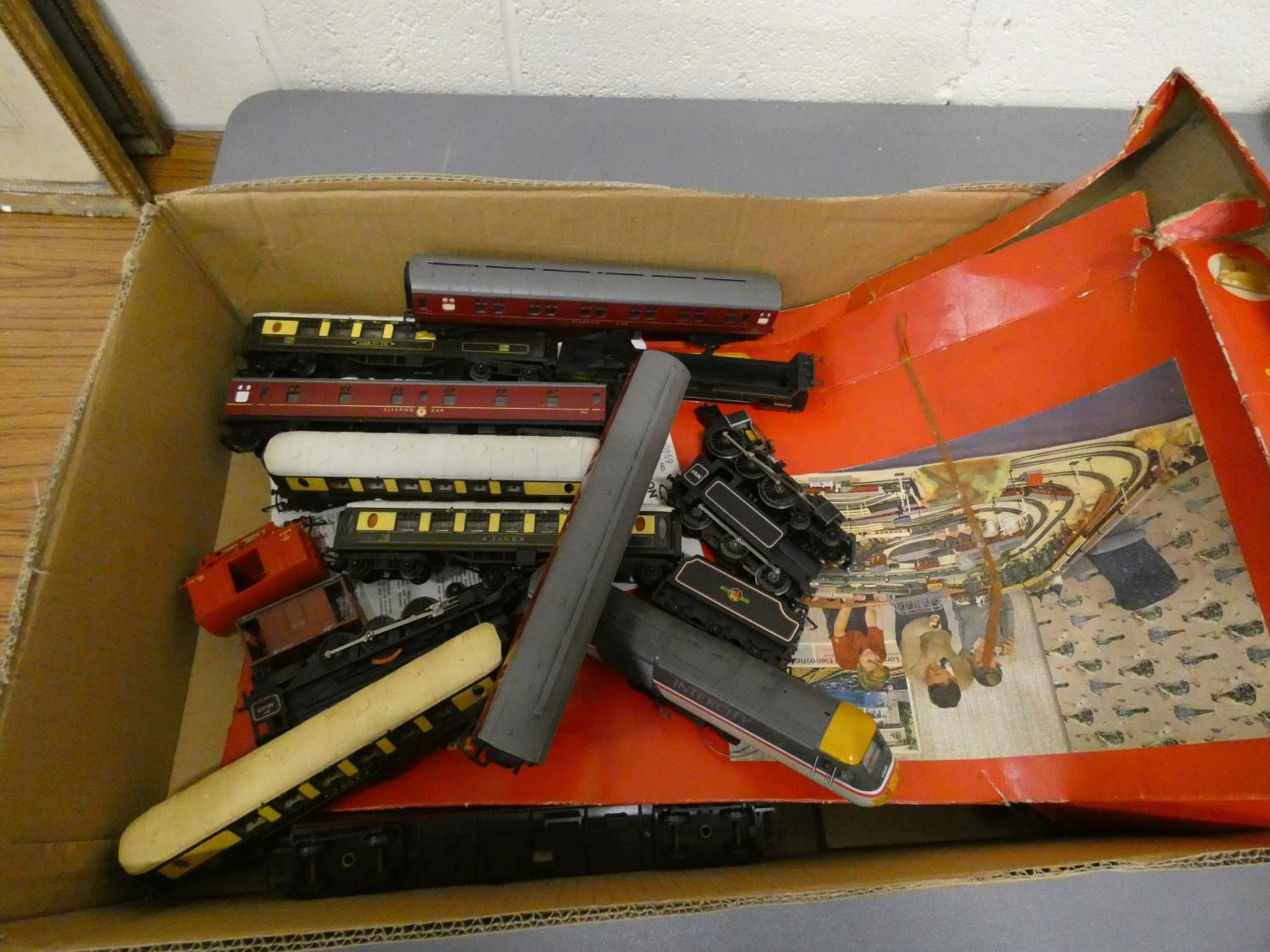 Collection of vintage 00 gauge model railway engines and rolling stock mostly Tri-ang. To include three Triang R52, R259 & R50 engines and a Triang RS21 box.