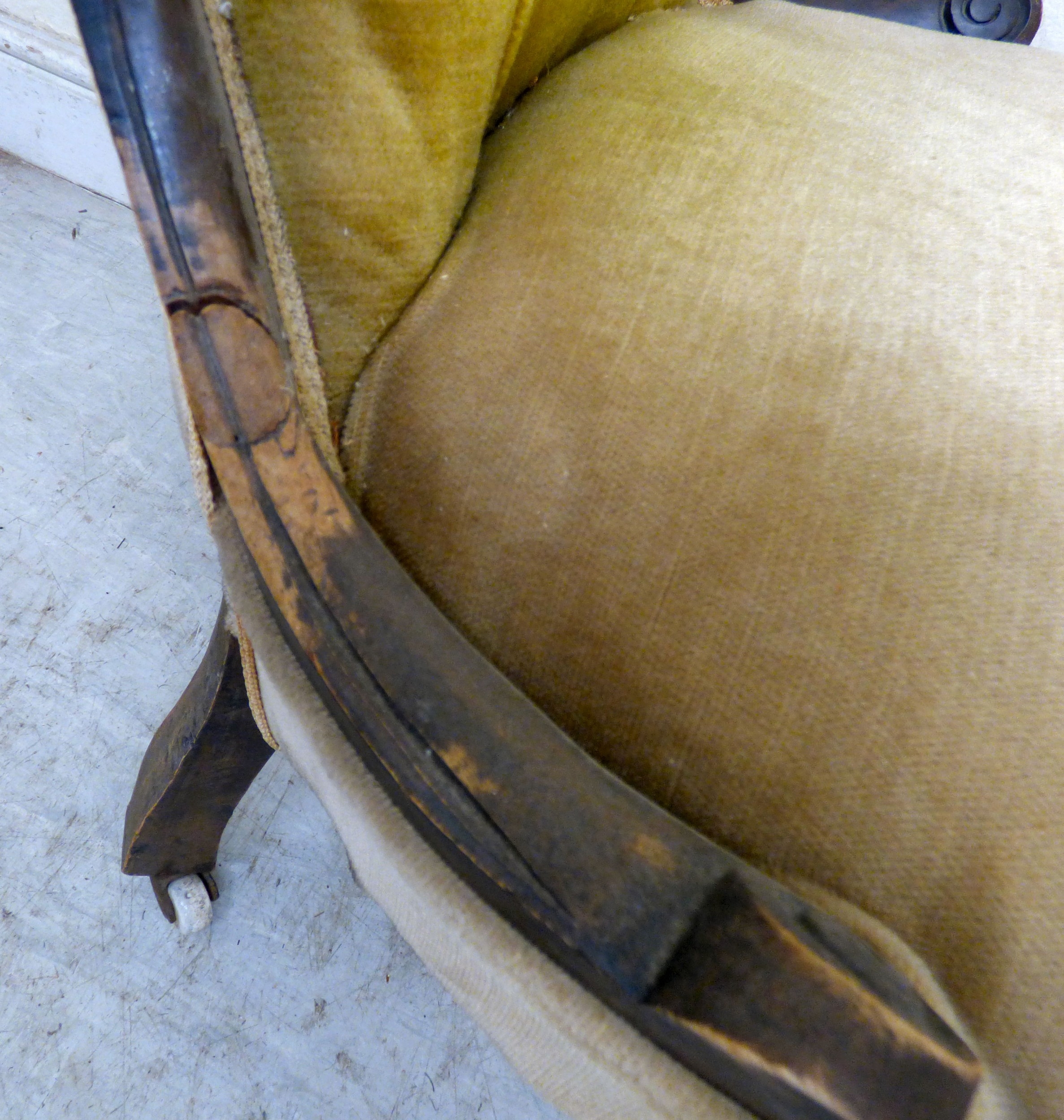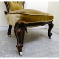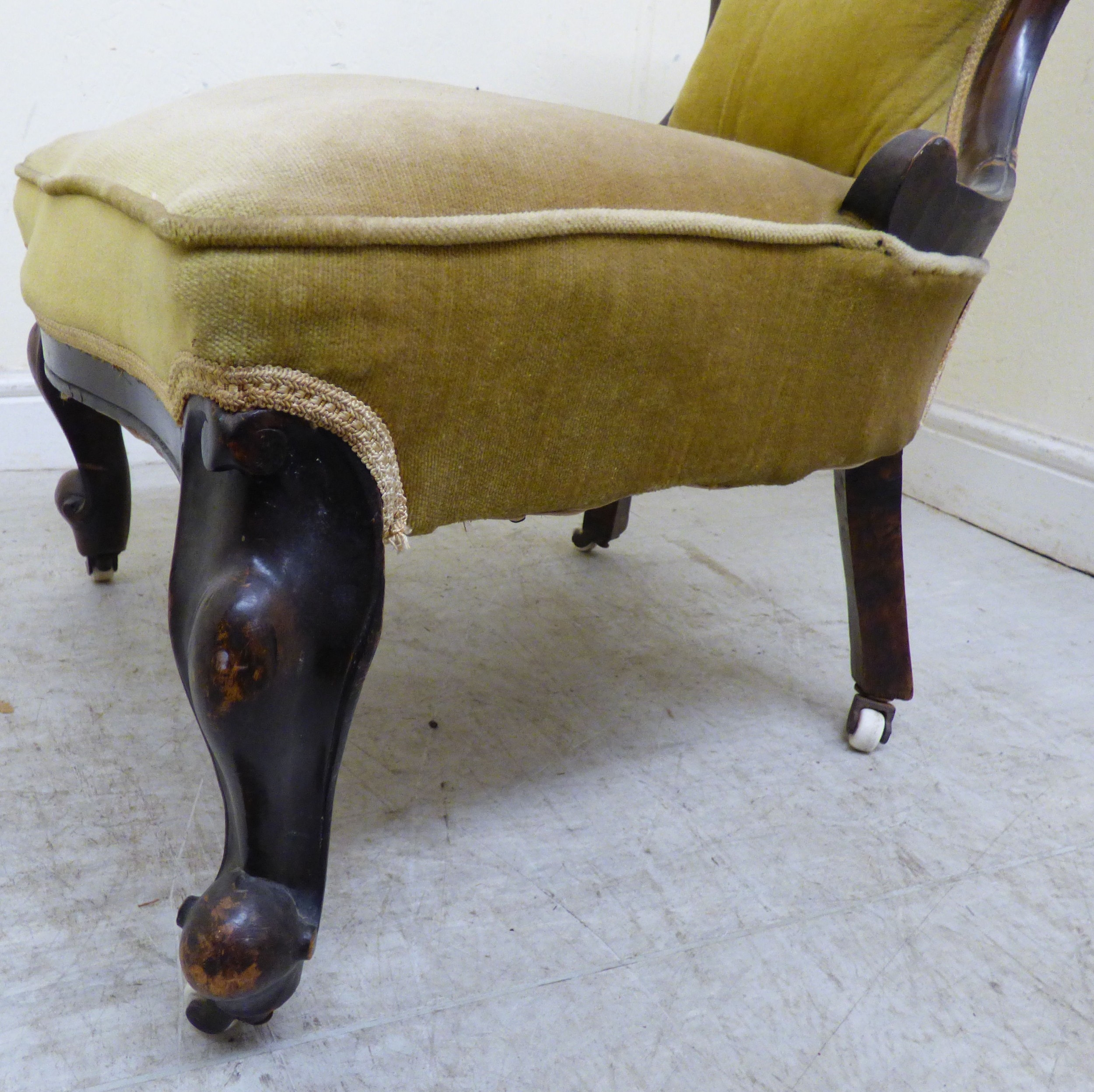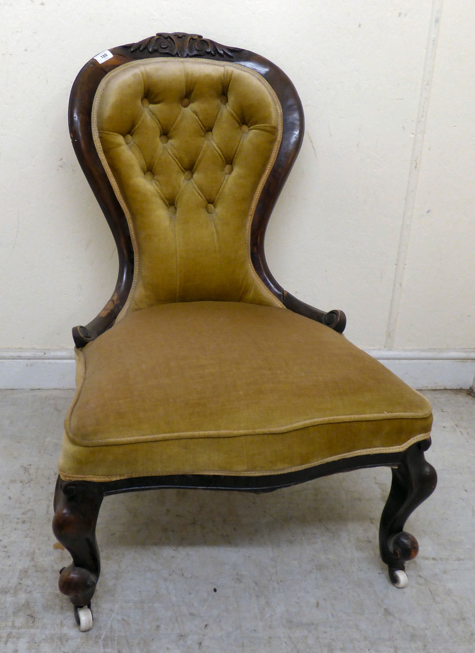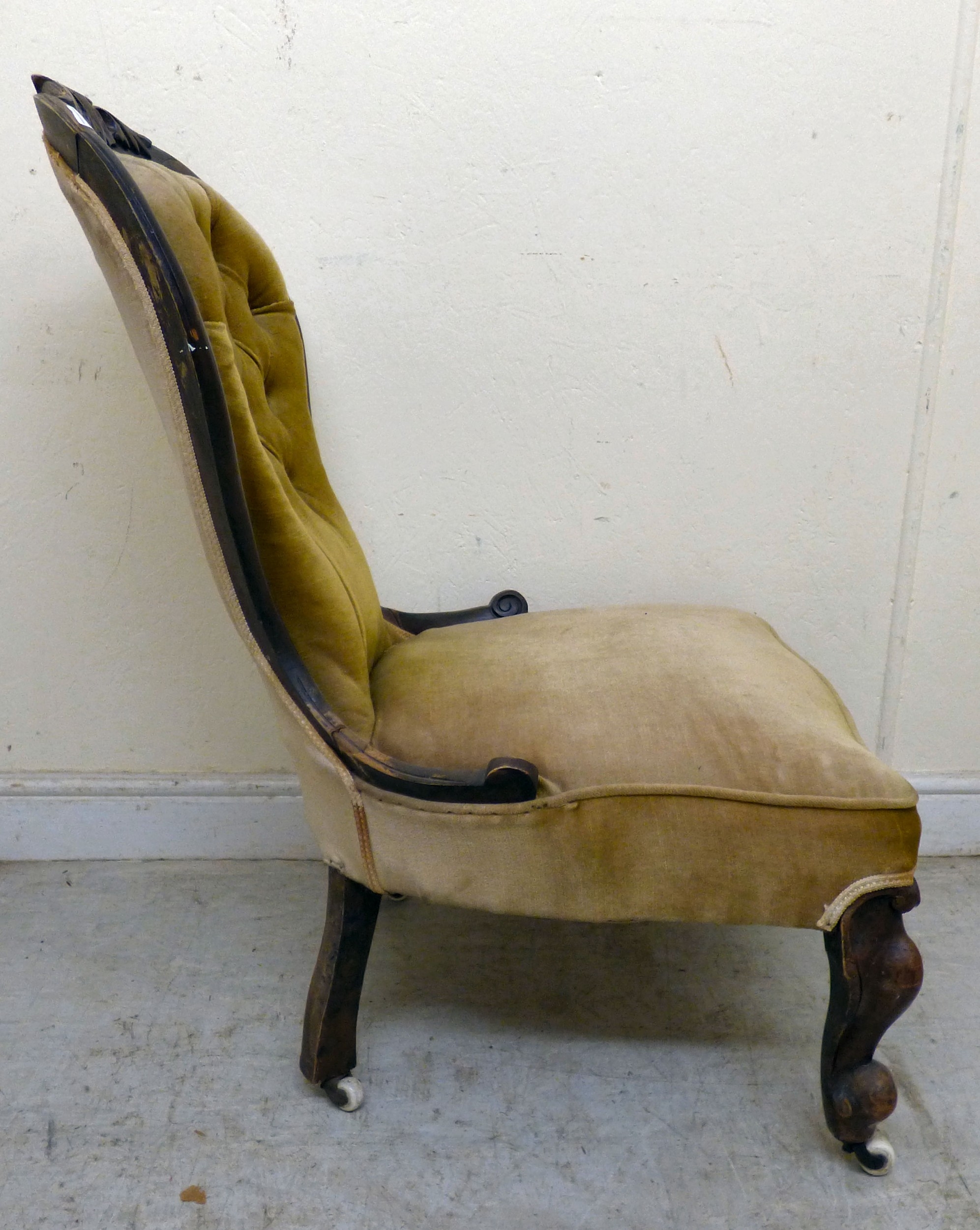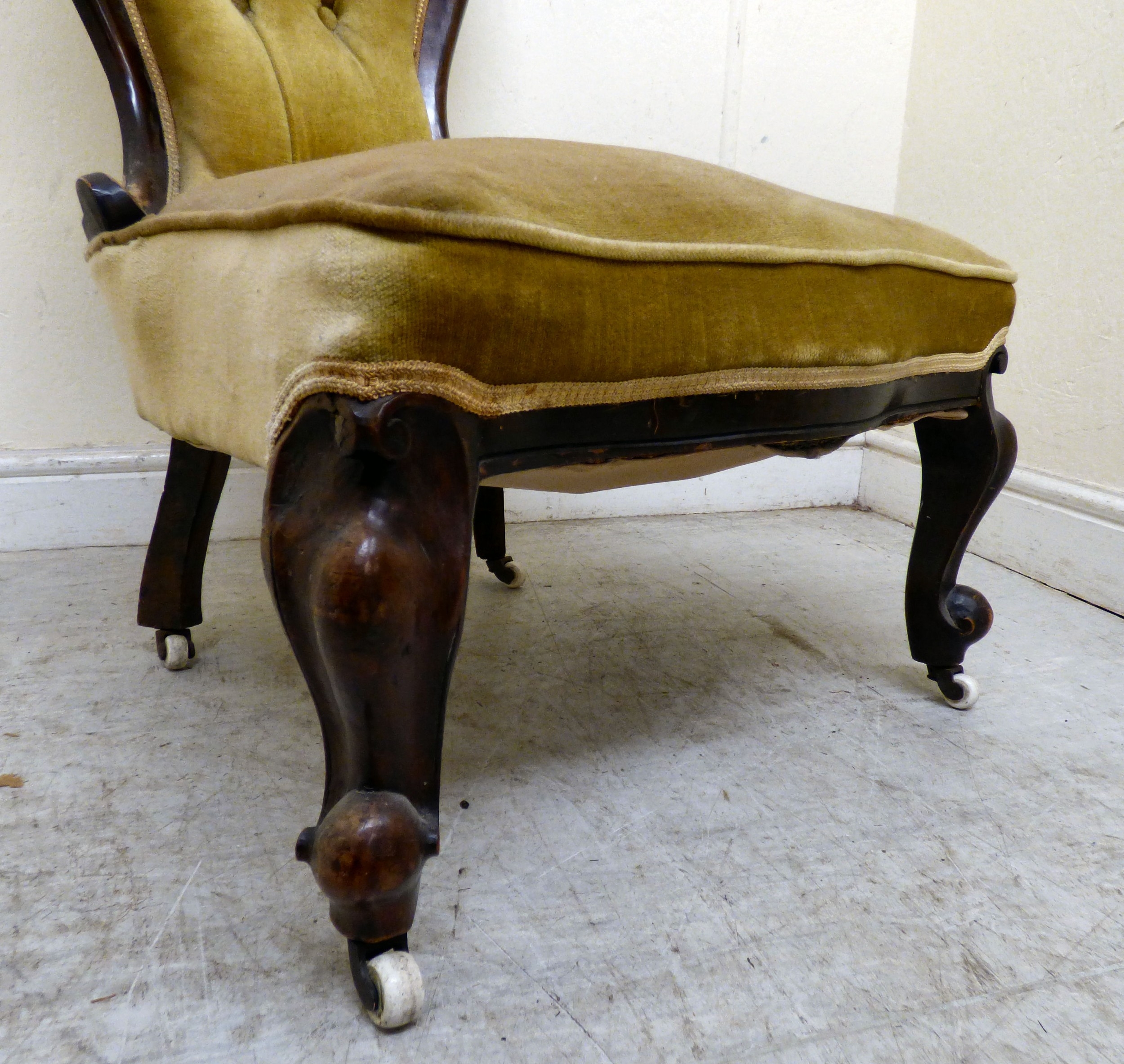 A late 19thC walnut framed salon chair with a button upholstered back and seat, raised on cabriole legs