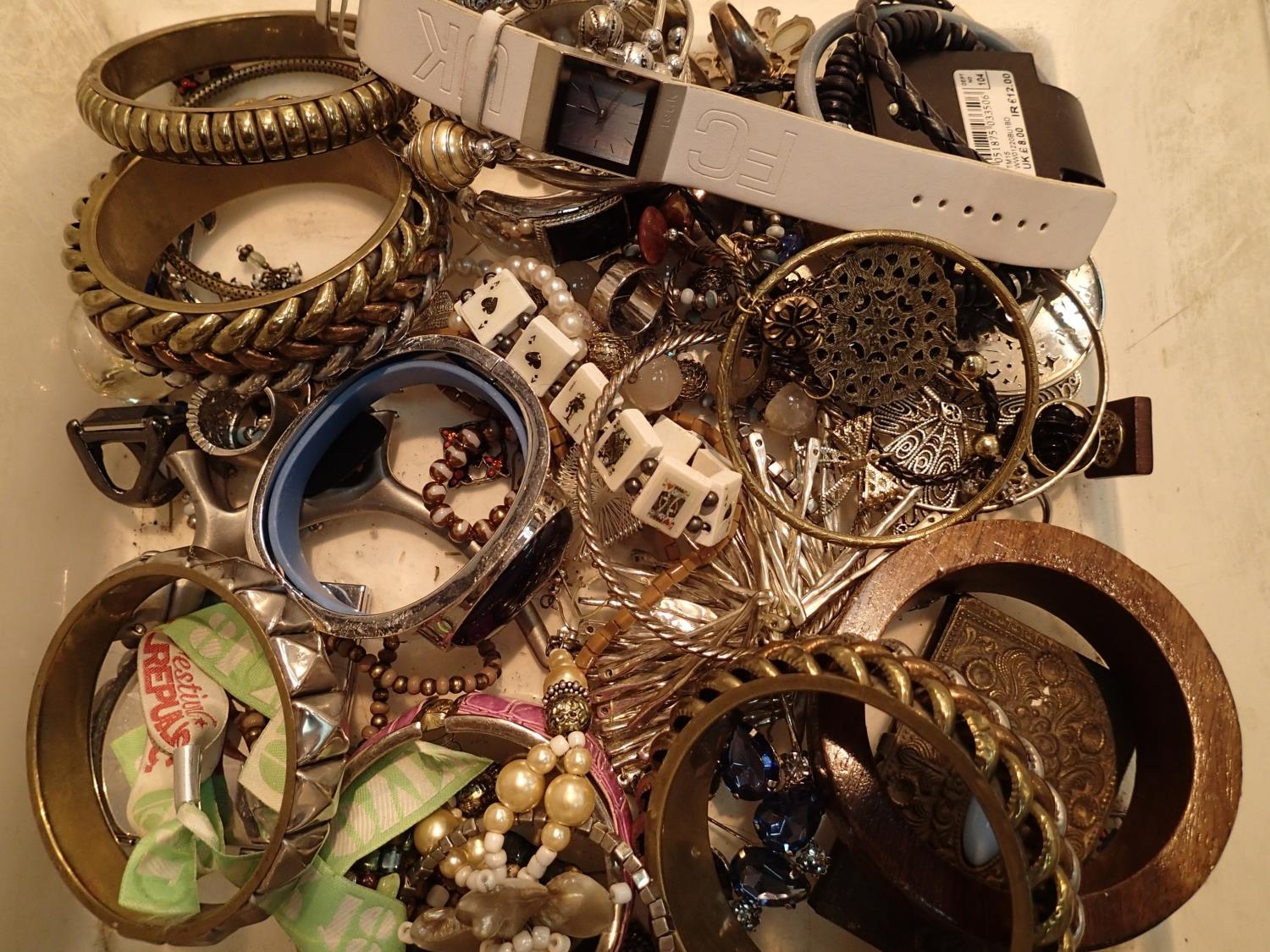 Box containing a selection of modern ladies costume jewellery to include bangles, dress watch etc. P&P Group 1 (£14+VAT for the first lot and £1+VAT for subsequent lots)