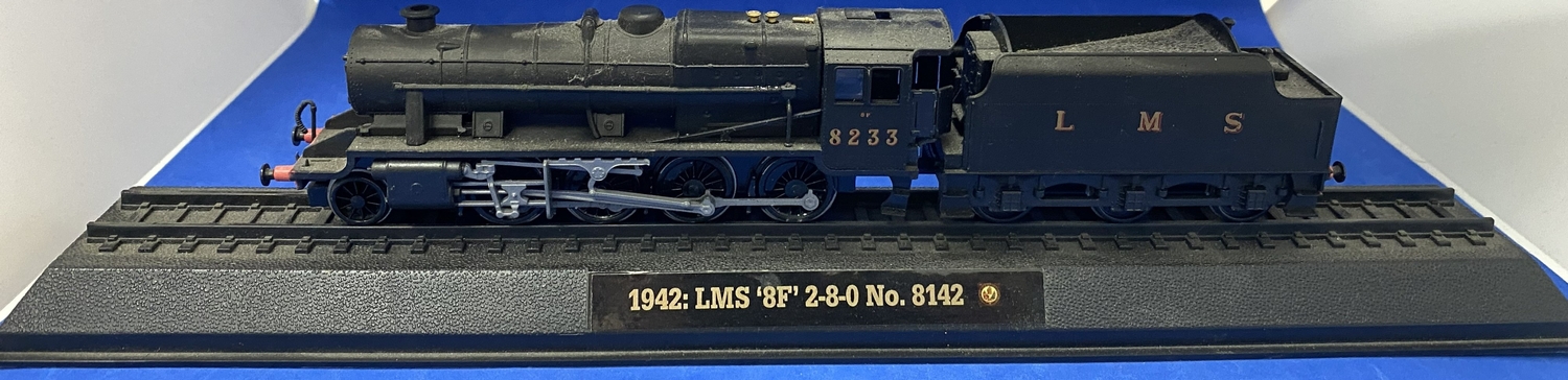 1942: LMS '8F' 2-8-0 No. 8142, train model on rail base.