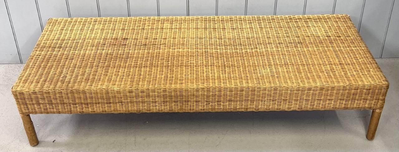 A vintage, wicker, low coffee table. Dimensions(cm) H34, W150, D51.