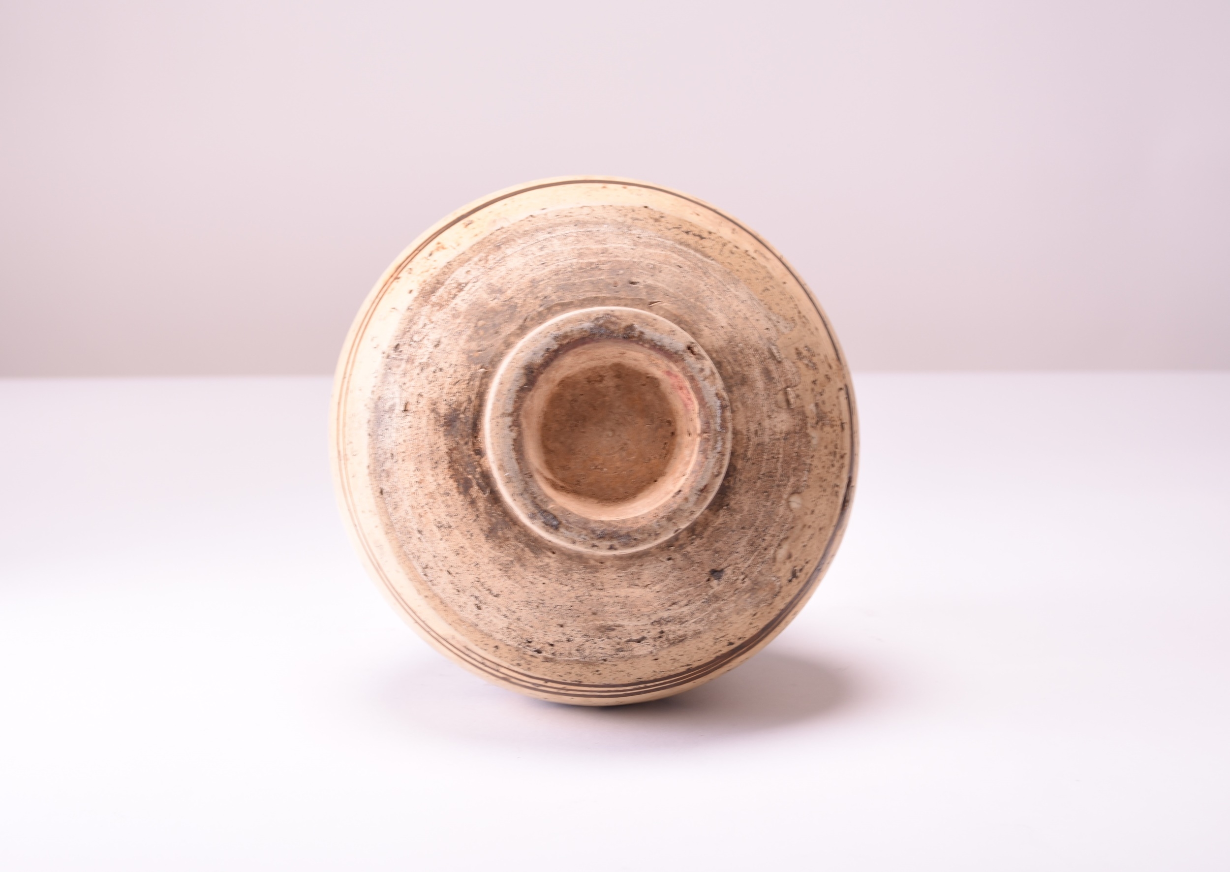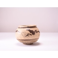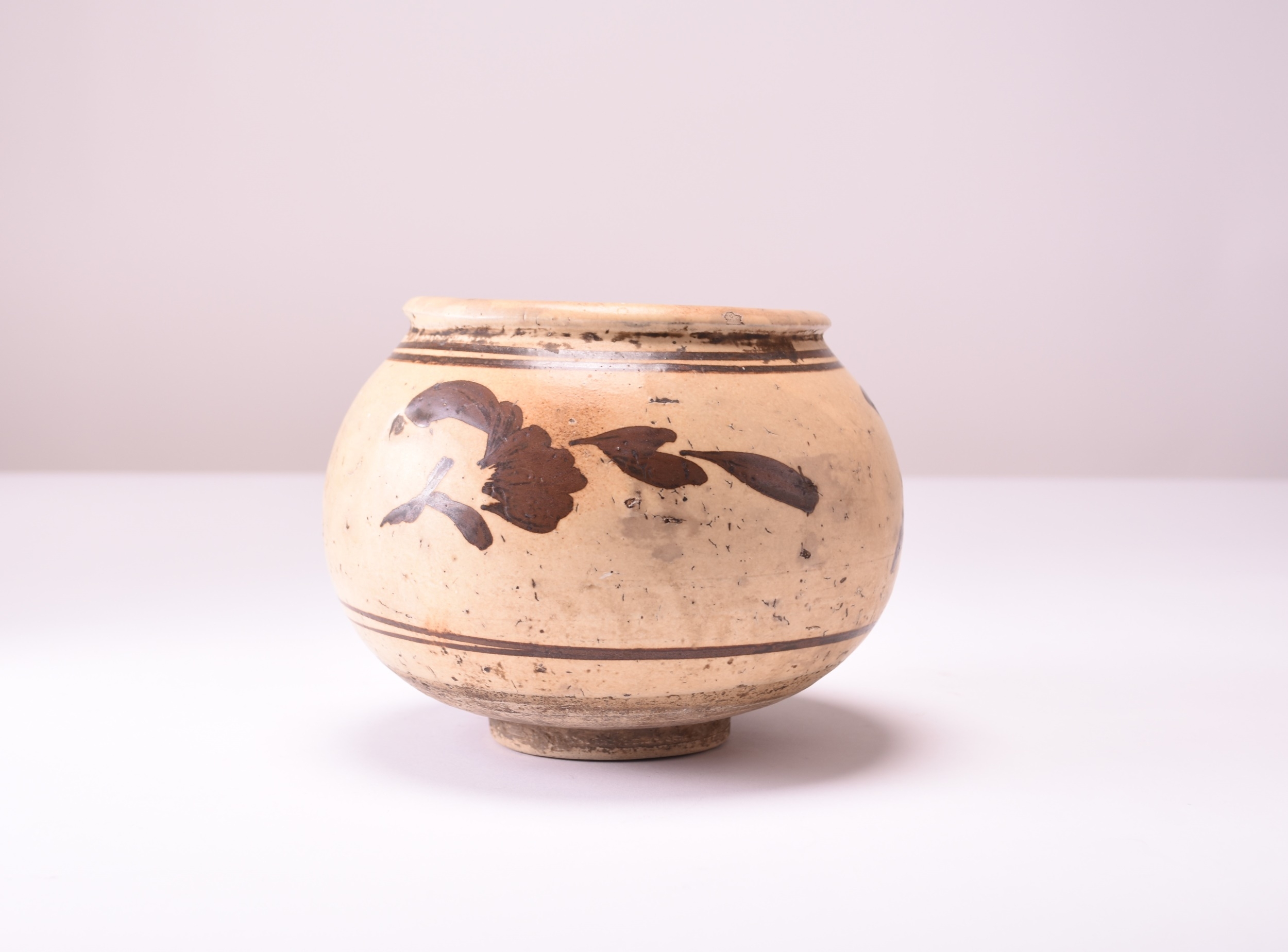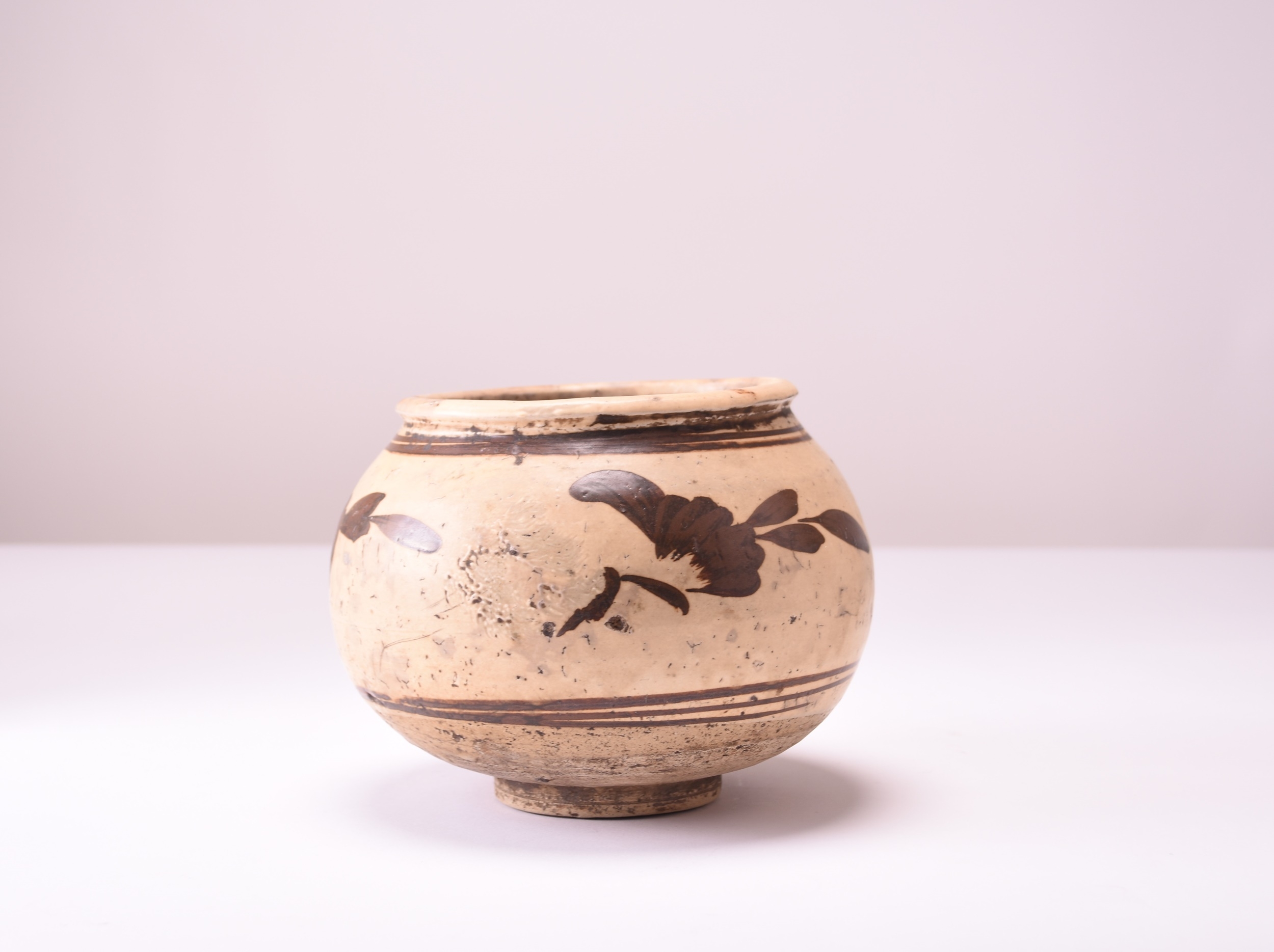 A Chinese painted Cizhou jar, Yuan Dynasty Of rounded form with everted rim, decorated with brownish-black on a cream slip ground with three stylised flowers and foliage between tramline borders. 15.5cm high English private collection, the property of a gentleman.