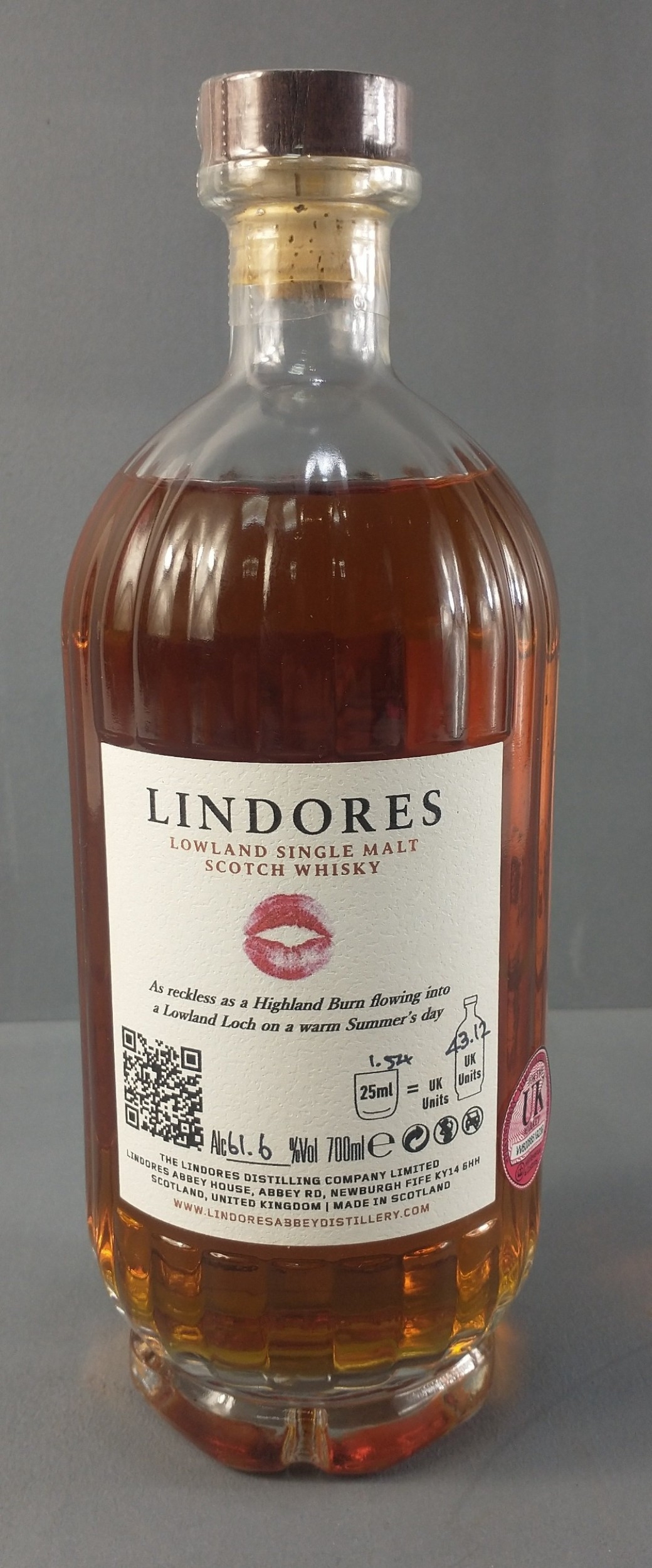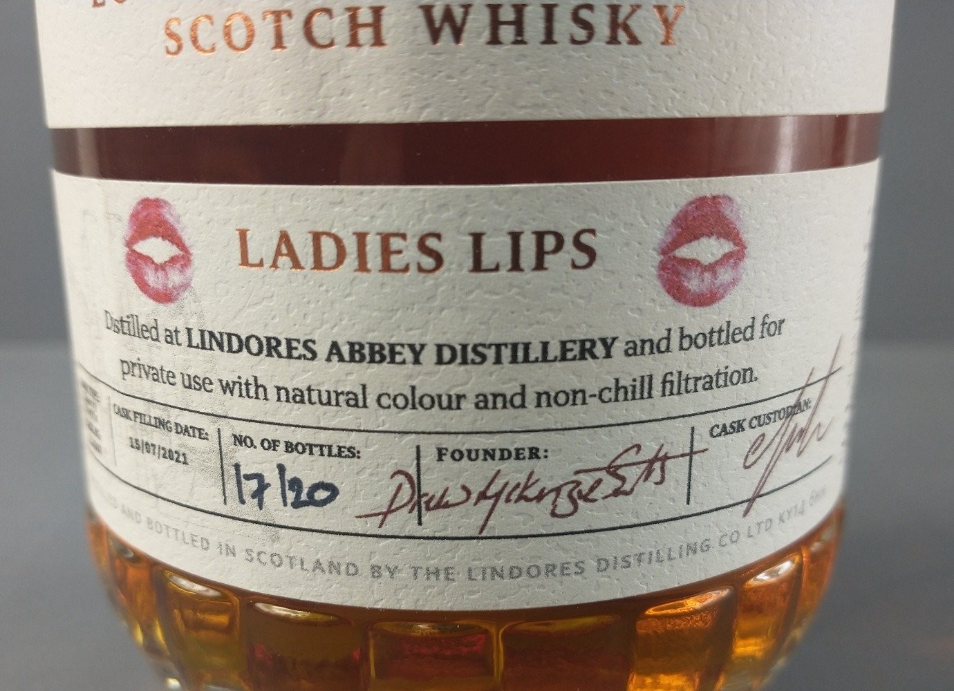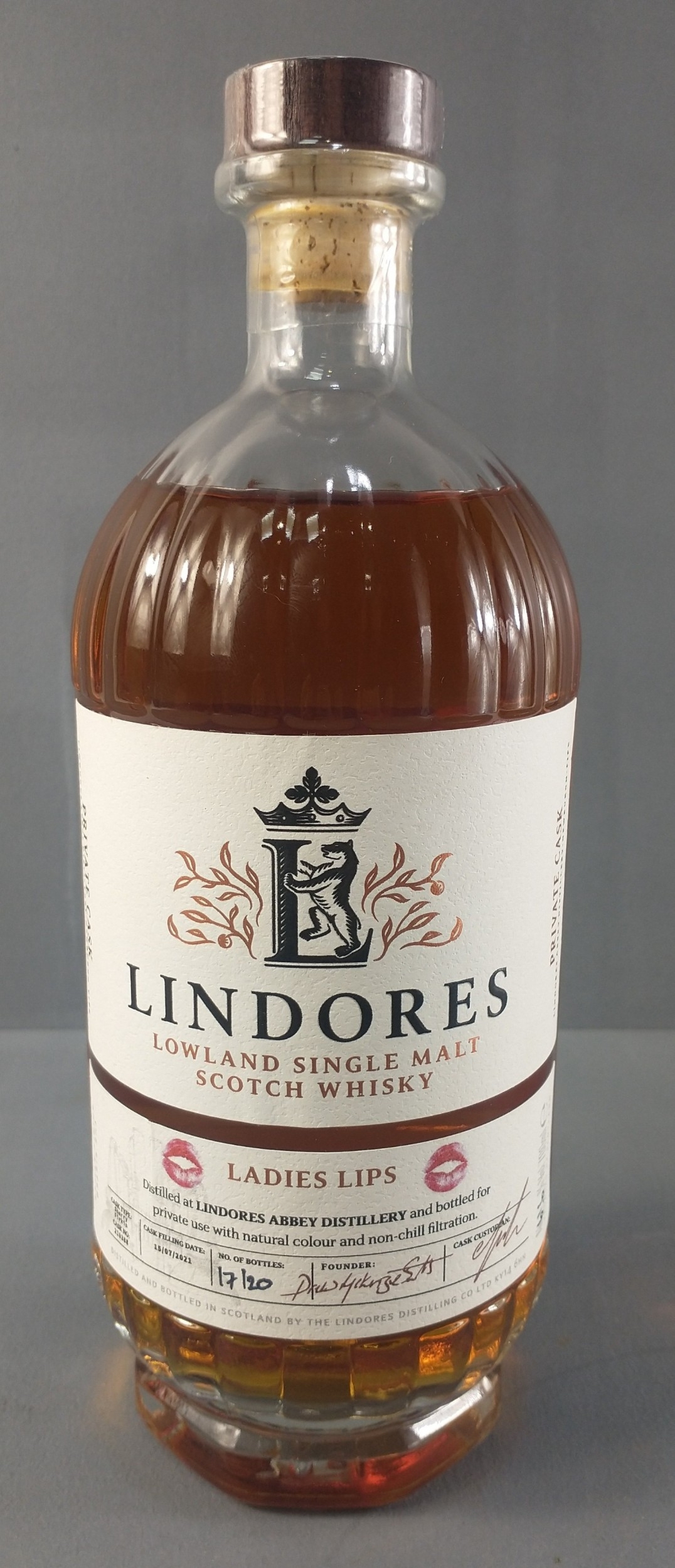LINDORES Lowland Single Malt Scotch Whisky. LADIES LIPS PRIVATE CASK bottled by Mary Bryson. 700ml bottle. Bottle 17/20